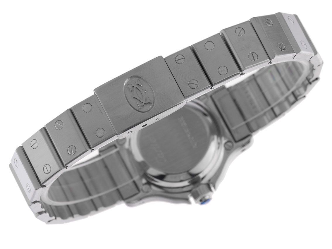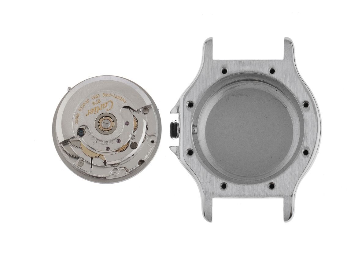 Caja de acero inoxidable satinada, diámetro de la caja sin corona 24mm, altura de la caja 8,7mm. Bisela de acero inoxidable atornillado en 8 puntos y pulido. Pulsera de acero inoxidable satinada, cierre desplegable de acero inoxidable con logo del fabricante. Esfera blanca con números romanos negros y agujas azules. Movimiento automático, calibre 076 con 25 piedras preciosas. Indicación de horas, minutos y segundos a través de agujas centrales con parada de segundero para un ajuste preciso de la hora. Cristal de zafiro resistente a los arañazos. Corona con cabujón de espinela. Fondo de acero inoxidable atornillado en 4 puntos y grabado. Peso del reloj incluyendo la pulsera 49g, longitud de la pulsera incluyendo la caja 160mm. Número de referencia: 187903, número de caja: B0836XXX, año de fabricación: 1993, ID: P247035500226H-5100, número de artículo: 10000084708. Con control de marcha y completa restauración exterior de marzo de 2026. Caja original de Cartier y documentos de garantía sin fecha, así como extracto del Watch Register de febrero de 2026, certificado de The Watch Register / sin entrada (base de datos internacional de relojes perdidos o robados), Full Set. Superoferta, inversión con potencial de revalorización, pieza de colección muy rara. Muy buen estado. Tiempo de entrega inmediato.