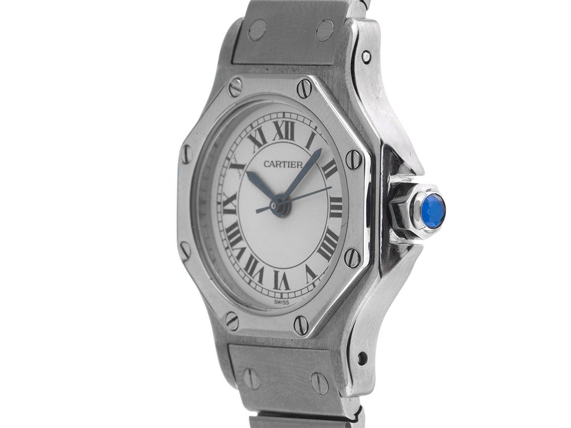 Cartier Santos Octagon PM kleines Modell Stahl Automatik Armband StahlGehäuse Edelstahl satiniert, Gehäusedurchmesser ohne Krone 24mm, Gehäusehöhe 8,7mm. Lünette Edelstahl 8-fach verschraubt und poliert. Armband Edelstahl satiniert, Faltschließe Edelstahl mit Hersteller-Logo. Zifferblatt weiß mit schwarzen römischen Ziffern und gebläuten Zeigern. Uhrwerk Automatik, Kaliber 076 mit 25 Edelsteinen. Anzeige von Stunde, Minute und Sekunde über Zeiger aus der Mitte mit Sekundenstopp zur sekundengenauen Einstellung der Uhrzeit. Saphirglas kratzfest. Krone mit Spinell Cabochon. Boden Edelstahl 4-fach verschraubt und graviert. Gewicht der Uhr inklusive Armband 49g, Länge des Armbandes inklusive Gehäuse 160mm. Referenznummer: 187903, Gehäusenummer: B0836XXX, Baujahr: 1993, ID: P247035500226H-5100, Artikelnummer: 10000084708. Mit Gangkontrolle und kompletter äußerlicher Aufarbeitung von März 2026. Original Cartier Box und Garantie Papiere ohne Datumseintrag sowie Watchregister Auszug von Februar 2026, The Watch Register Zertifikat / ohne Eintrag (Internationale Datenbank für verlorene oder gestohlene Uhren), Full Set. Superschnäppchen, Kapitalanlage mit Wertsteigerungspotential, sehr seltenes Sammlerstück. Sehr guter Zustand. Lieferzeit sofort.