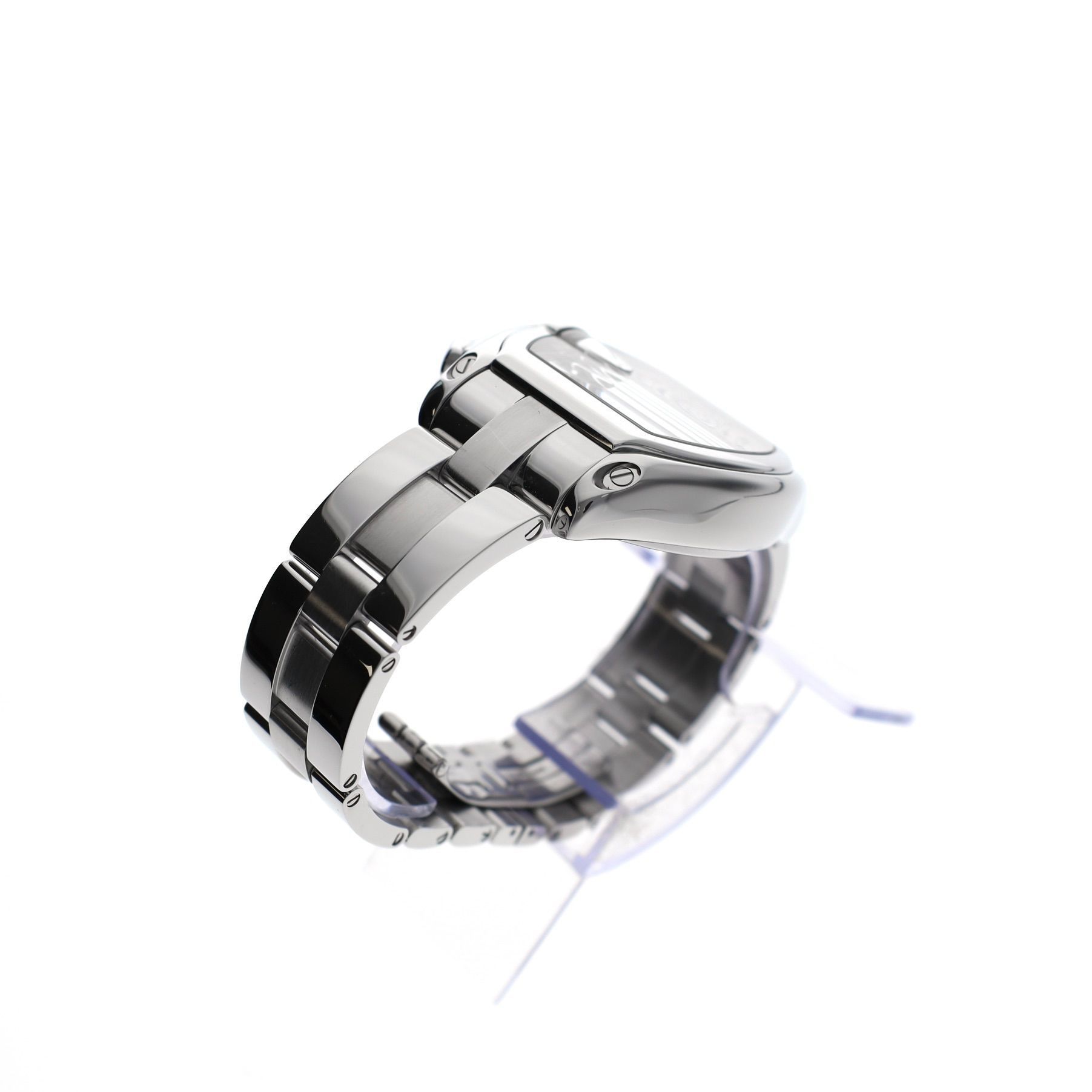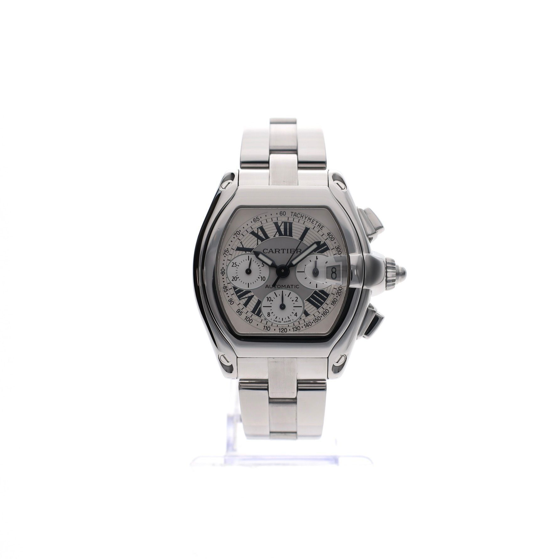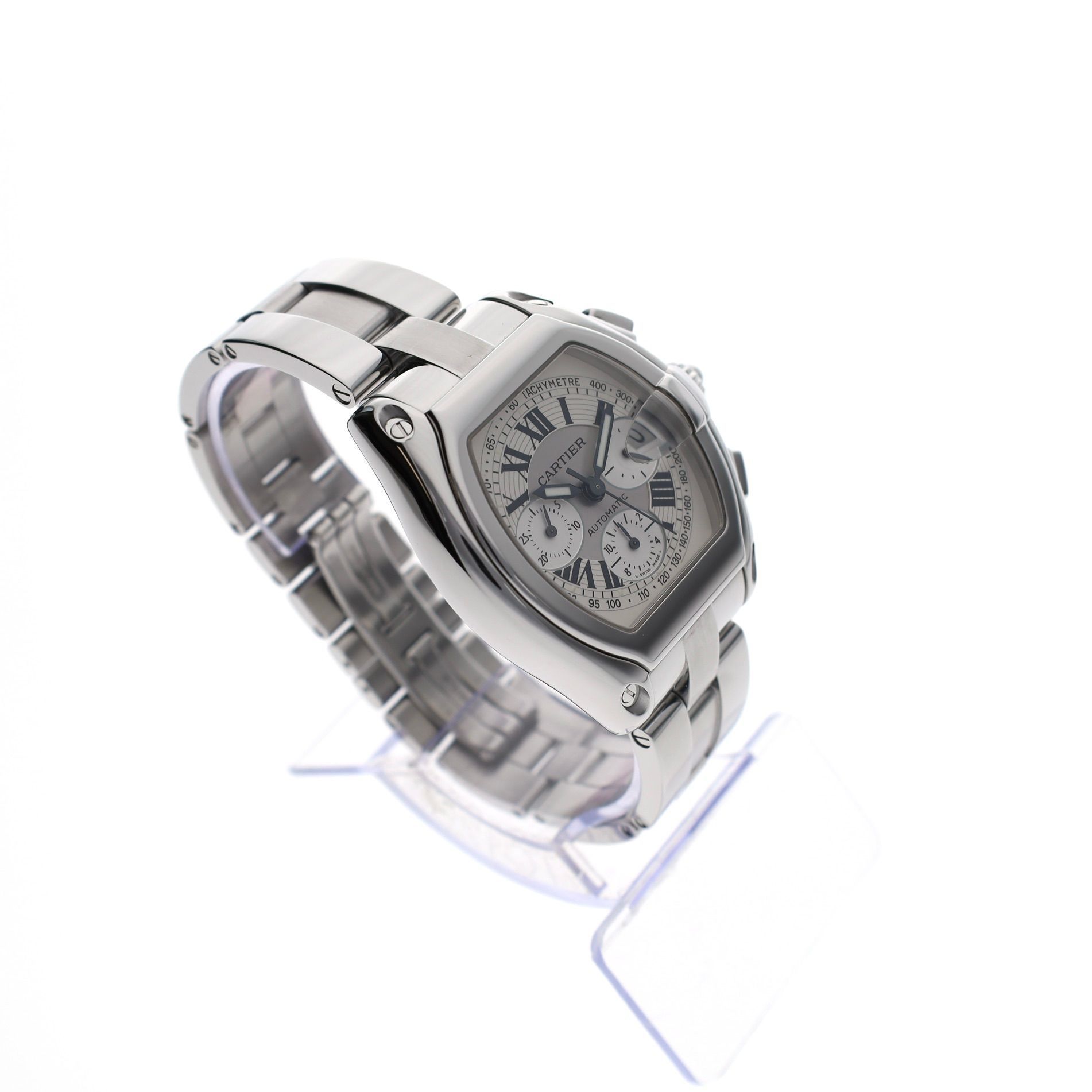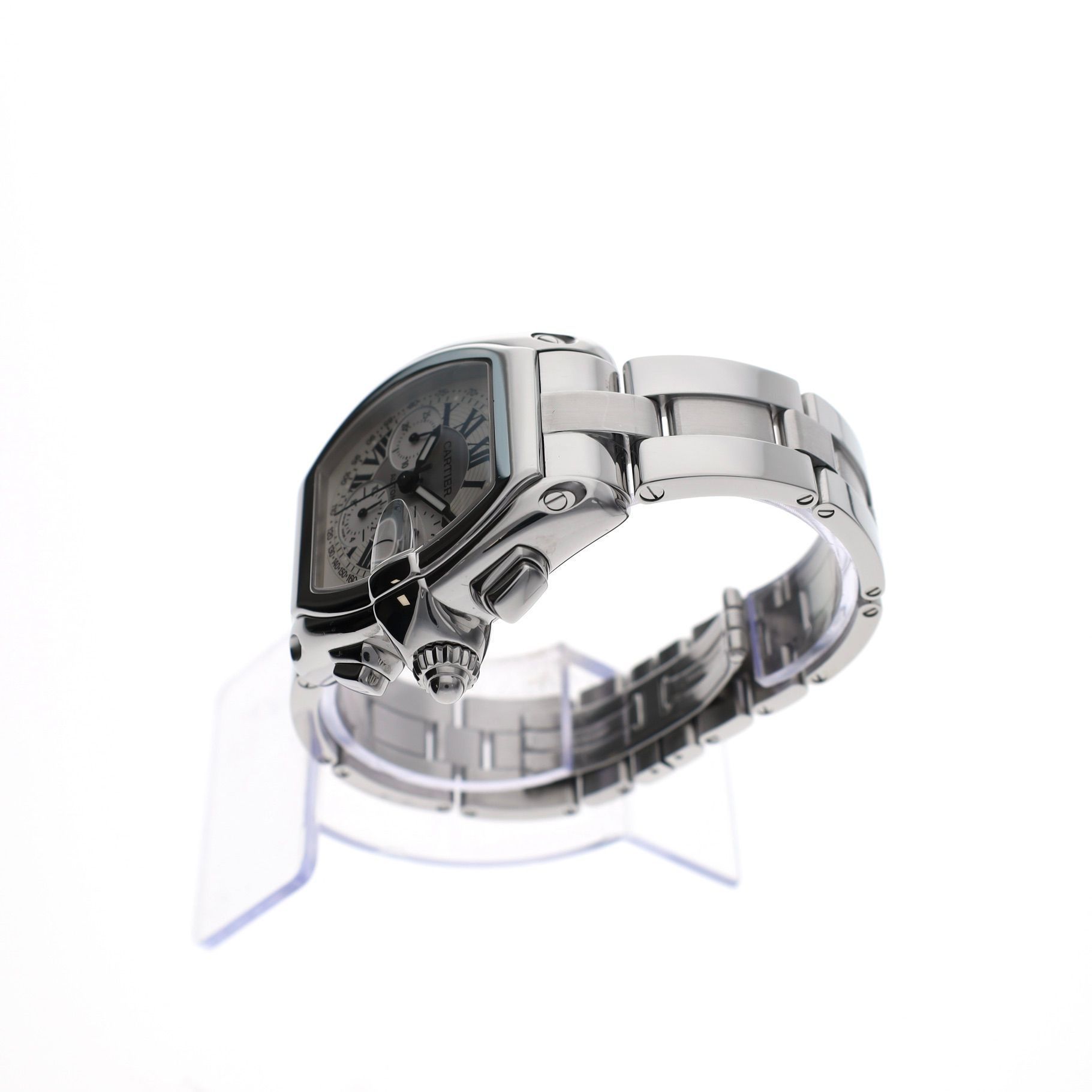 The Cartier Roadster Chronograph is one of Cartier's most recognizable modern designs, inspired by the streamlined lines of classic automobiles. With its tonneau-shaped case, enlarged date display, and perfectly integrated bracelet, the Roadster has become a distinctive and increasingly sought-after model within the Cartier collection. This piece, reference W62006X6 (case number 2618), dates from 2003 and is equipped with an automatic chronograph movement. The stainless steel case projects a powerful presence on the wrist without compromising on elegance. The dial with Roman numerals, luminous hands and chronograph subdials combines sportiness with the timeless Cartier signature.Strap & extrasThis watch comes on the original stainless steel Cartier bracelet and is additionally supplied with:• Original Cartier crocodile leather strap• Original Cartier folding clasp• Additional Cartier crocodile leather strap• Original leather strap storage caseThe watch is in very good, carefully worn condition with only minor signs of wear commensurate with age and careful ownership. It has been fully tested for functioning and reliability.This is an exceptionally complete collector's set, including:• Original (extra-large) Cartier presentation box• Original warranty papers• Original purchase invoice• Instruction manual• Service invoice 2007/2008• Leather strap pouch• Additional original Cartier crocodile strap with folding clasp• Our warranty certificate with a 1-year guaranteeA rare opportunity to acquire a particularly complete and excellently preserved Cartier Roadster Chronograph from the early production years.