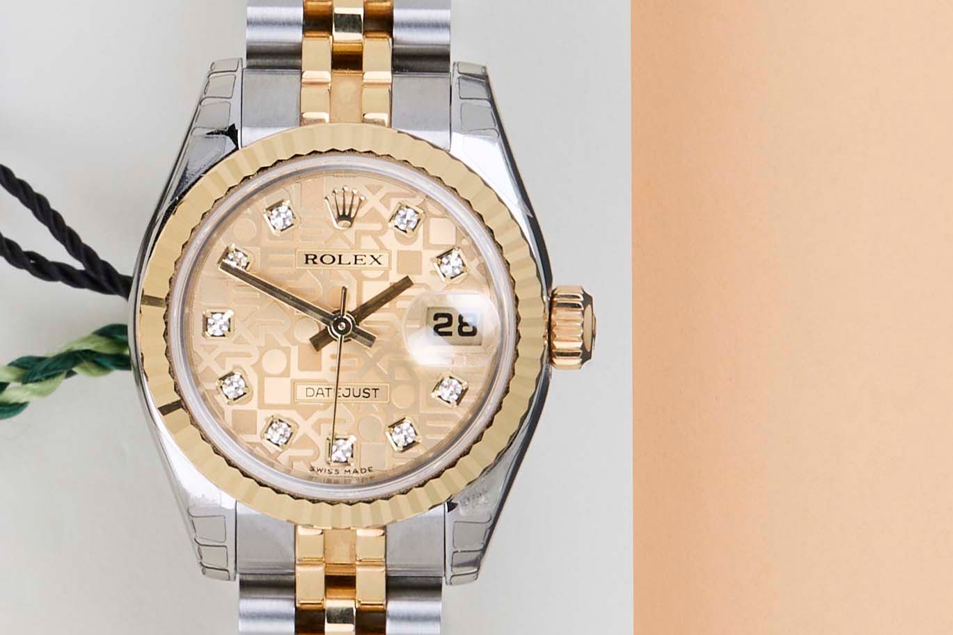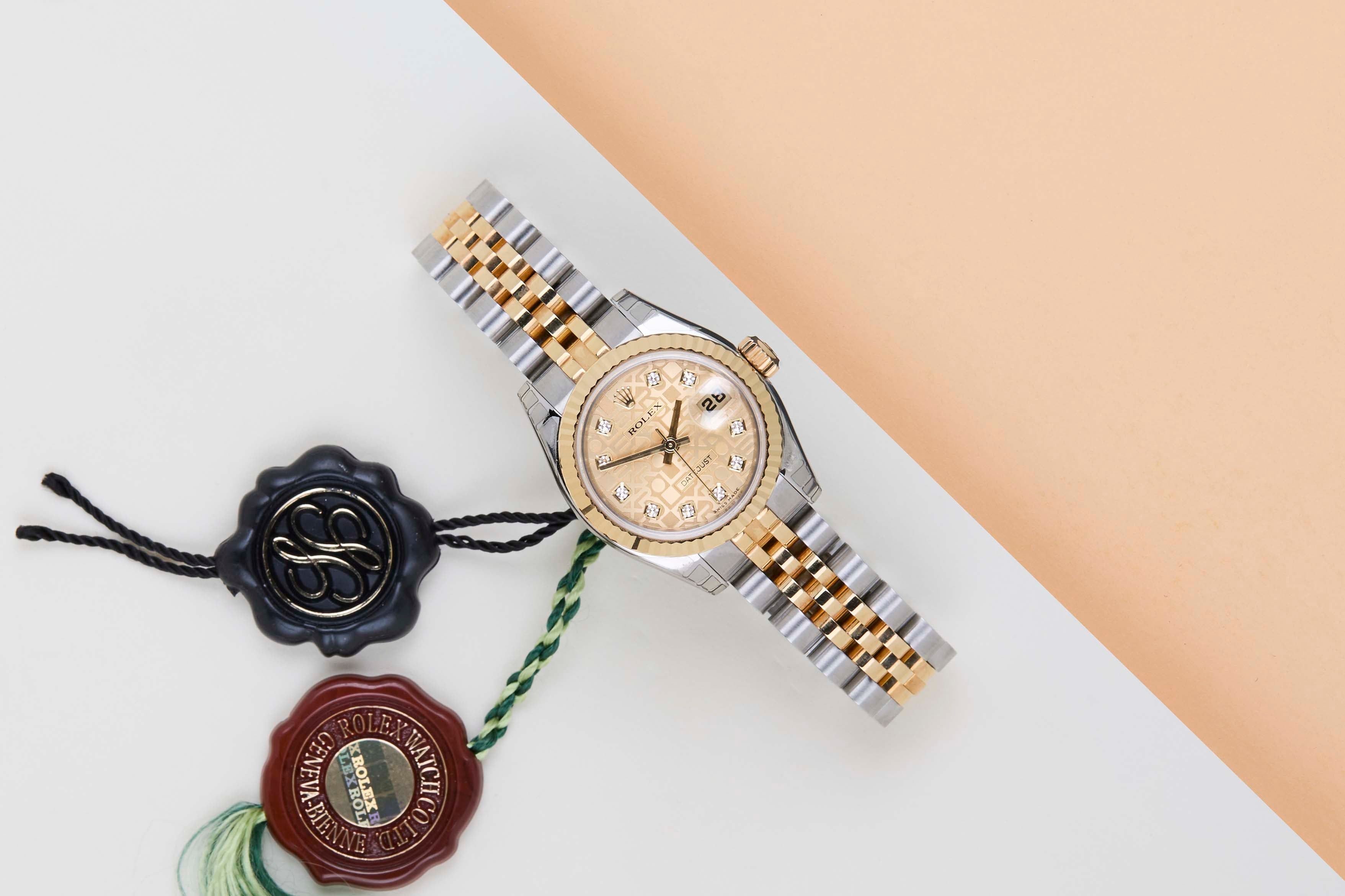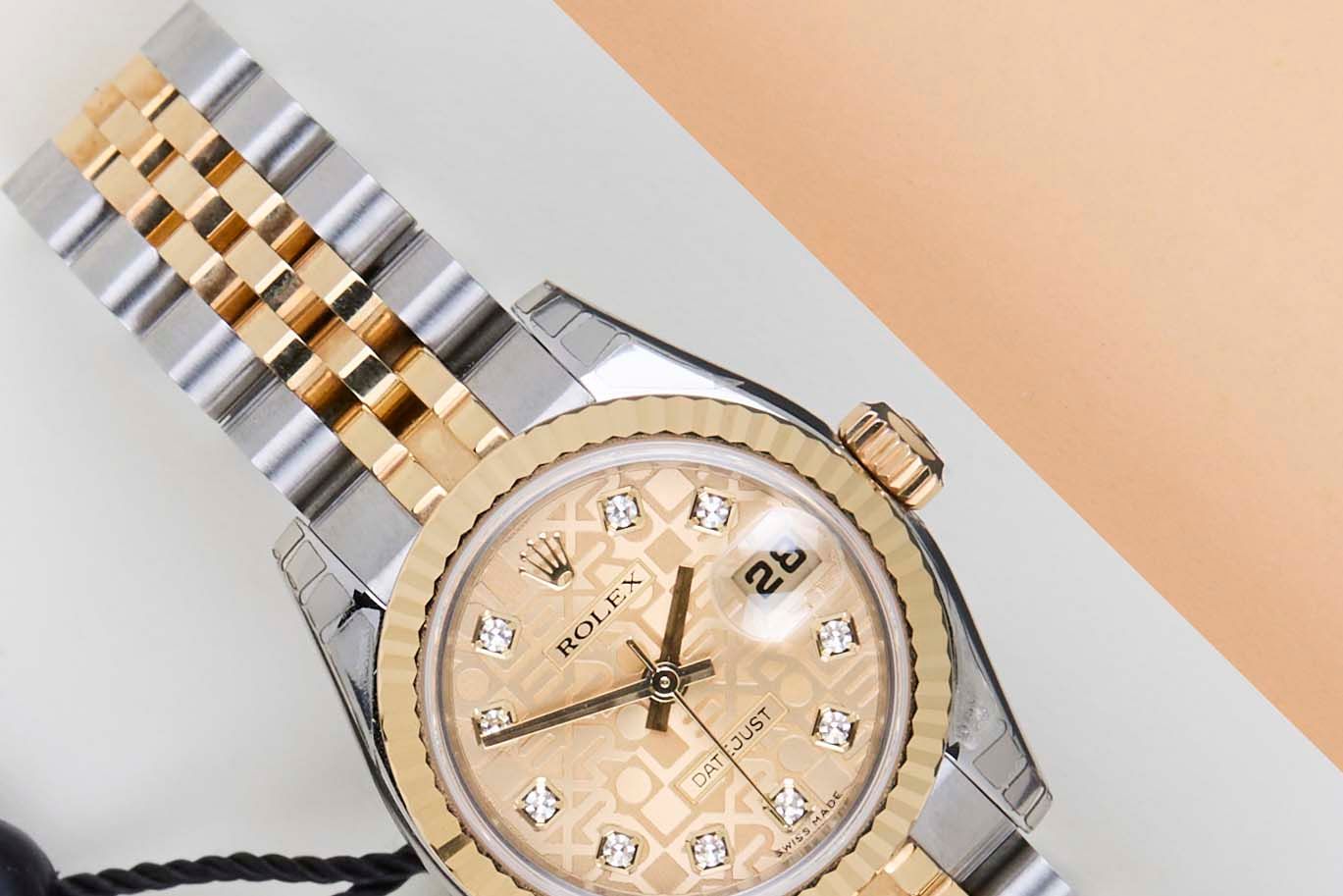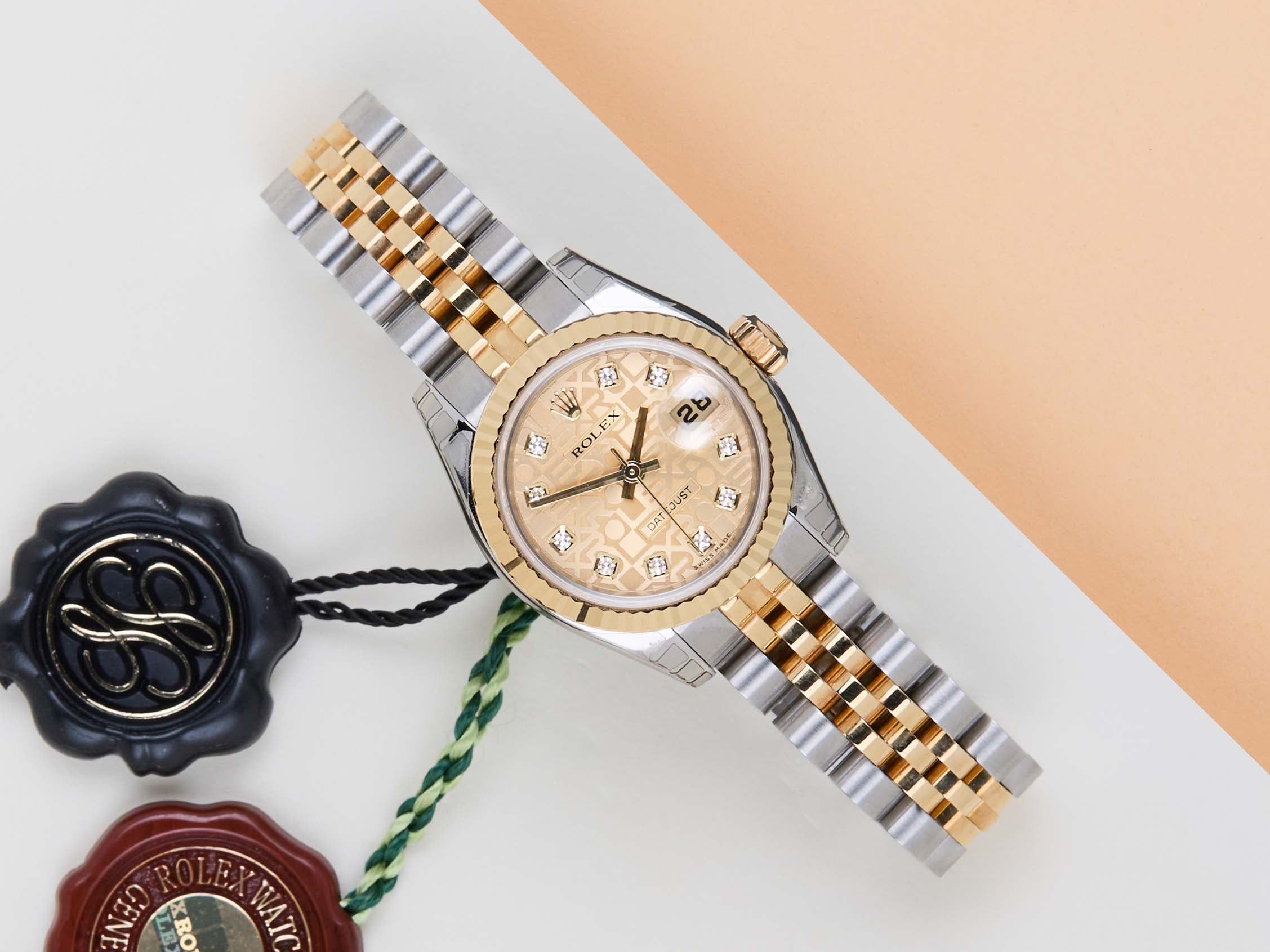 New & Unworn (NOS - New Old Stock) | Partly stickered | Full-Set | Rolex Champagne Jubilee Diamond Dial Rolex introduced the original Datejust in 1945 to celebrate the company's 40th anniversary. Due to the enormous success, Rolex released the first Lady-Datejust in 1957.This Rolex Datejust 'Champagne Jubilee Diamond Dial' was sold for the first time in March 2007.This Datejust is made of a combination of 18k Yellow Gold and stainless steel and is fitted with a jubilee bracelet which conceals the Crownclasp.This Rolex Datejust 26 is in New & Unworn (NOS) Condition and comes with the original Rolex Warranty papers and Box. Furthermore, the watch has been checked by our watchmaker, and therefore, it comes with one year of Steiner warranty.