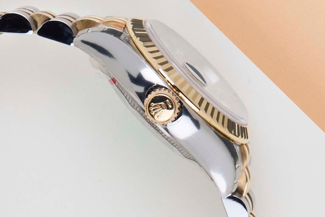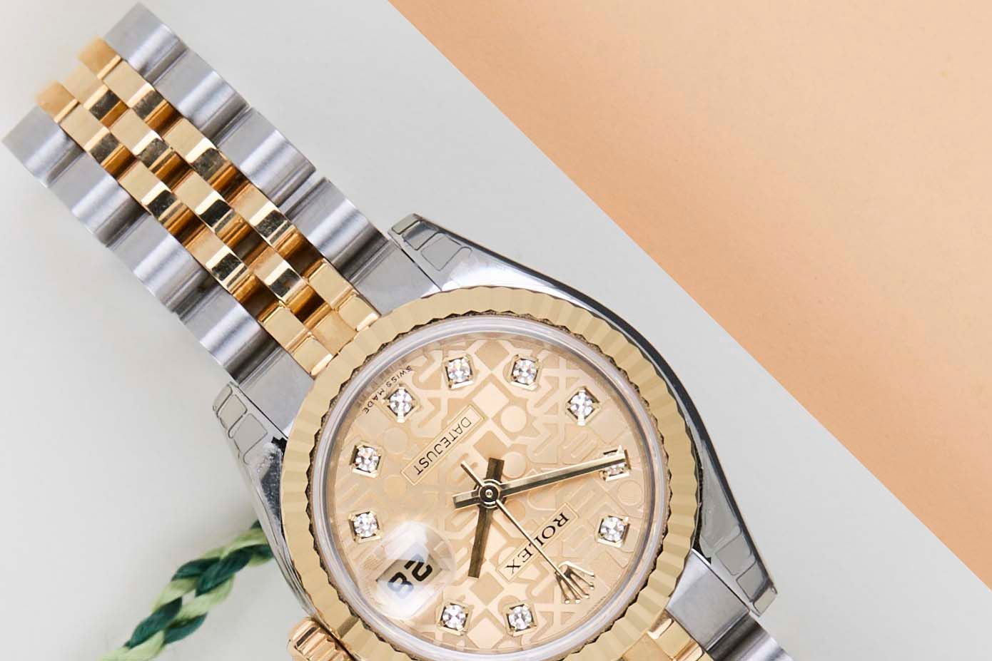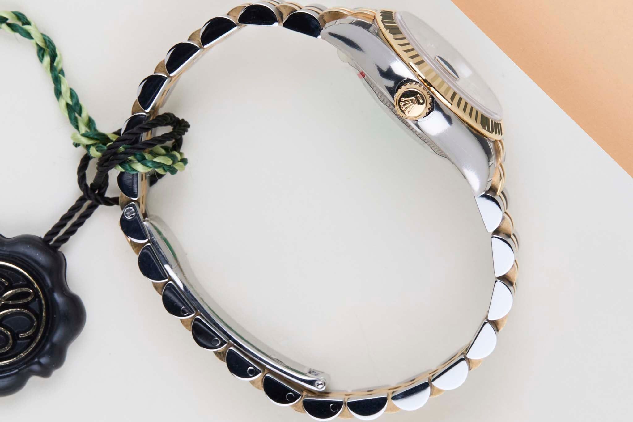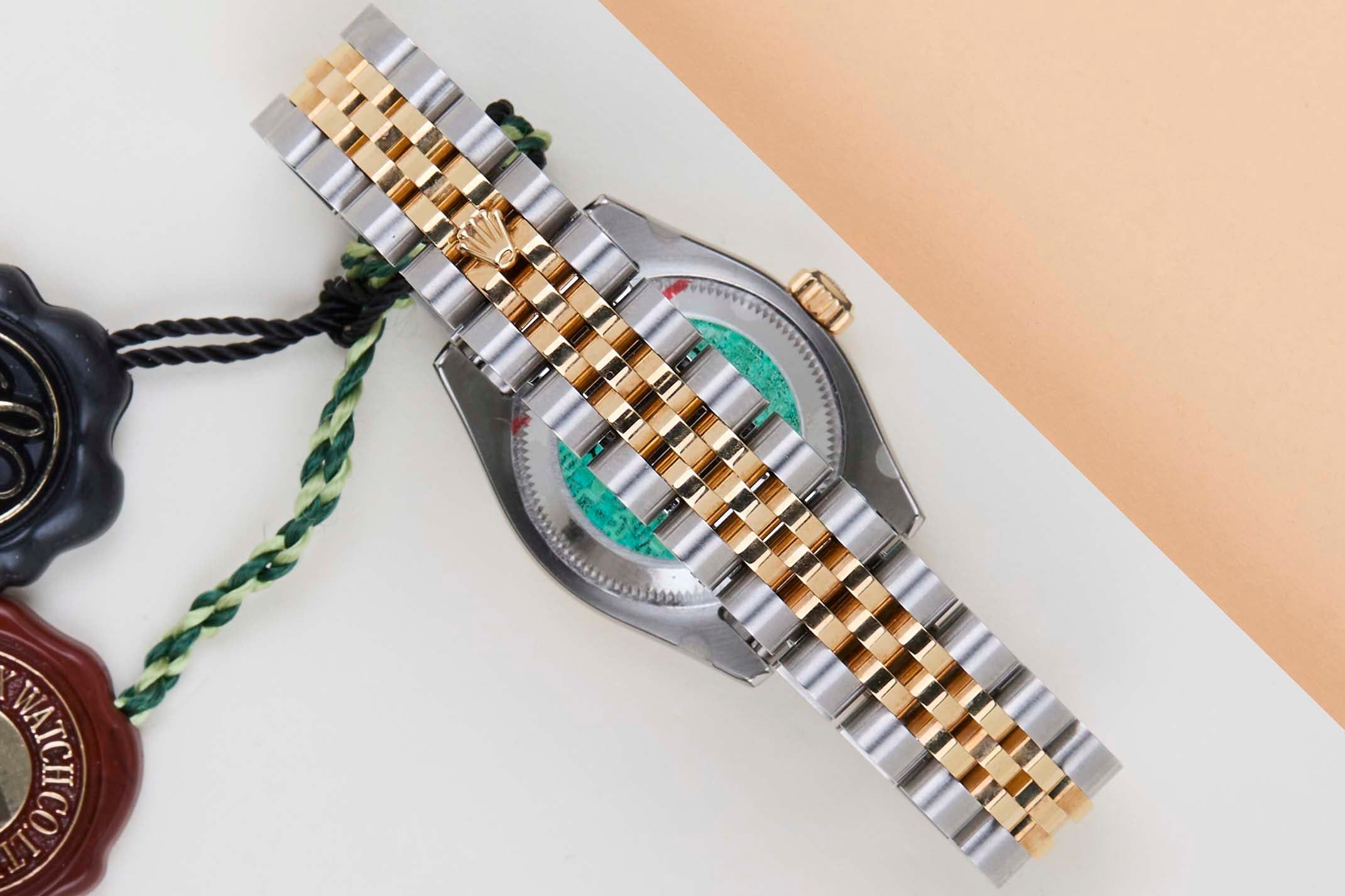 New & Unworn (NOS - New Old Stock) | Partly stickered | Full-Set | Rolex Champagne Jubilee Diamond Dial Rolex introduced the original Datejust in 1945 to celebrate the company's 40th anniversary. Due to the enormous success, Rolex released the first Lady-Datejust in 1957.This Rolex Datejust 'Champagne Jubilee Diamond Dial' was sold for the first time in March 2007.This Datejust is made of a combination of 18k Yellow Gold and stainless steel and is fitted with a jubilee bracelet which conceals the Crownclasp.This Rolex Datejust 26 is in New & Unworn (NOS) Condition and comes with the original Rolex Warranty papers and Box. Furthermore, the watch has been checked by our watchmaker, and therefore, it comes with one year of Steiner warranty.