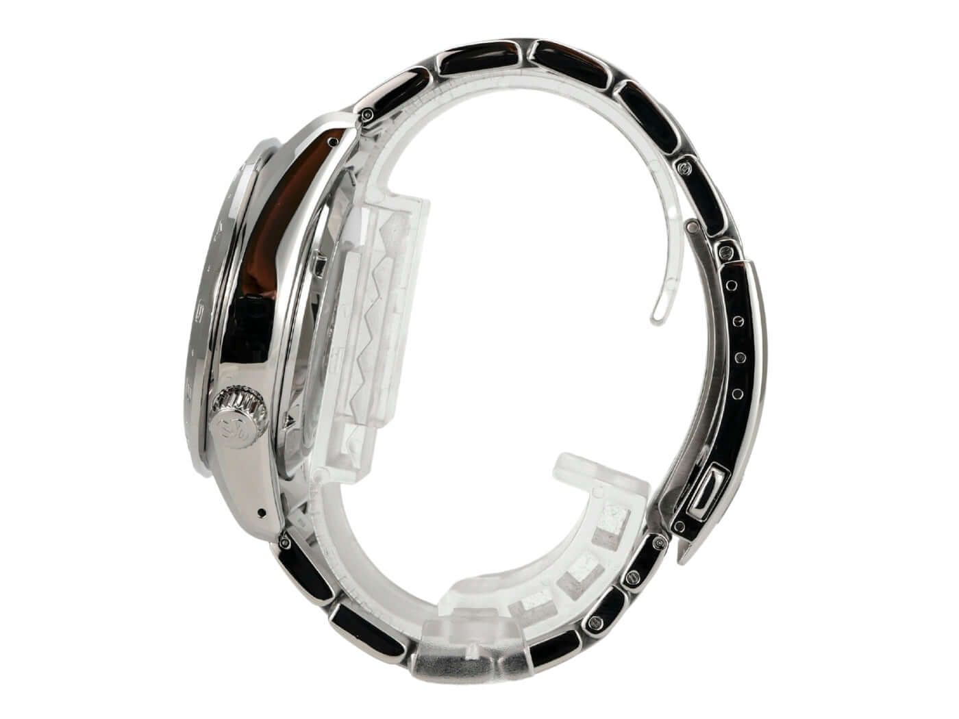 Caja hecha de acero inoxidable pulido y satinado, diámetro de la caja 40.5 mm, bisel de acero inoxidable pulido, pulsera de acero inoxidable pulido y satinado con cierre desplegable, esfera azul con índices luminosos, manecillas luminosas, movimiento automático, calibre 9S66, reserva de marcha de 72 horas, indicador de fecha, GMT, cristal de zafiro resistente a los arañazos, corona atornillada, fondo de caja de acero inoxidable con exhibición, resistente al agua hasta 20 bar.