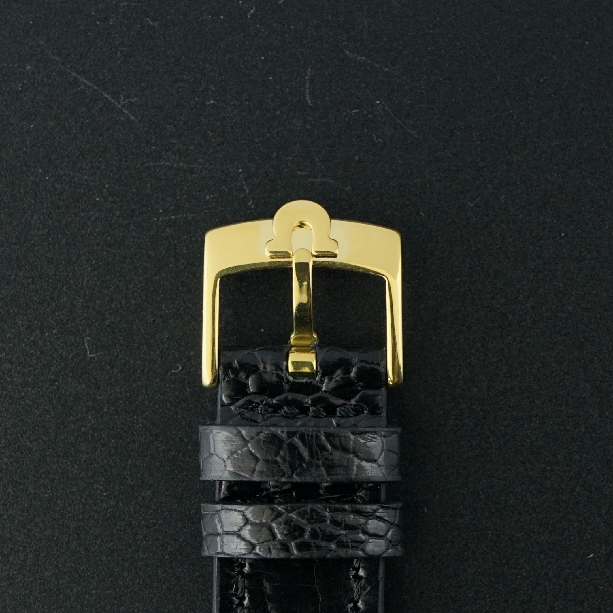 El reloj está acompañado de una correa de cuero de cocodrilo negra de grado 3. También conserva su hebilla original, aunque ha perdido color con el tiempo, por lo que se ha colocado una nueva hebilla en la correa nueva.