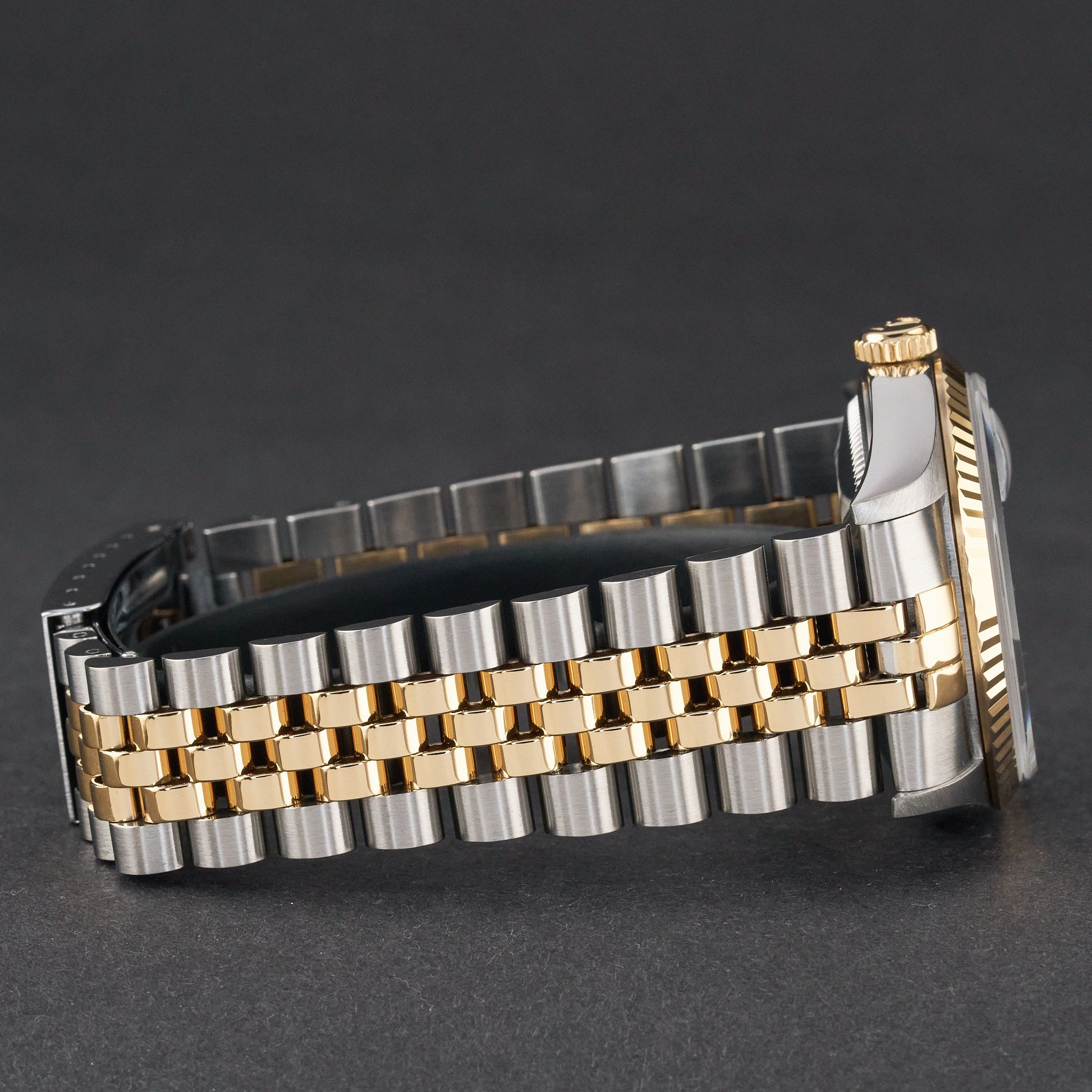 This Rolex Datejust 16233 features a Black Roman dial and is crafted from 18K yellow gold and stainless steel, with a production year of 1995.Case No: W33XXXX
