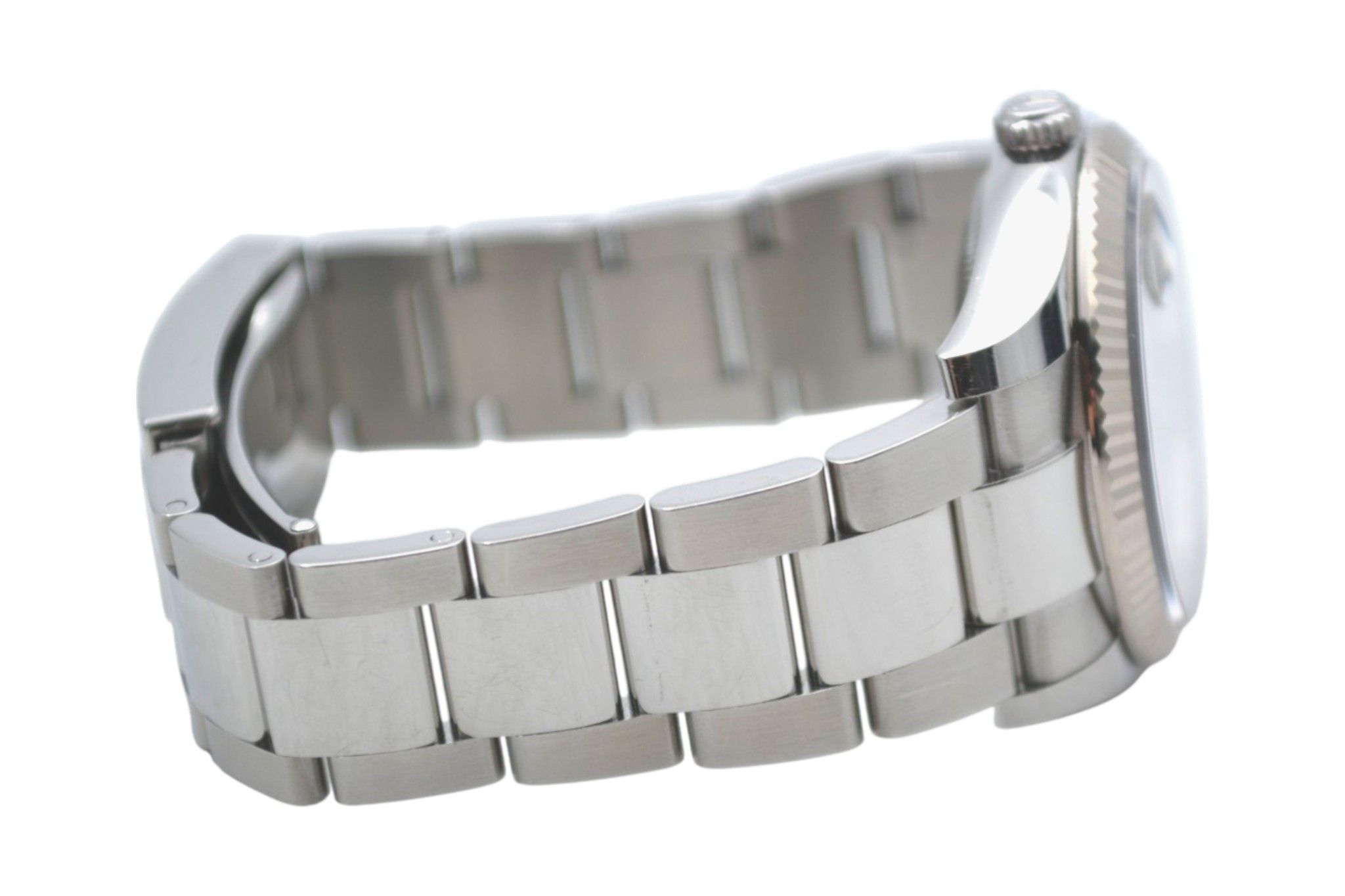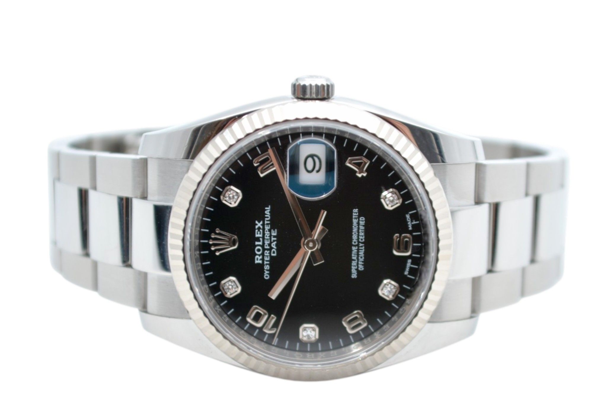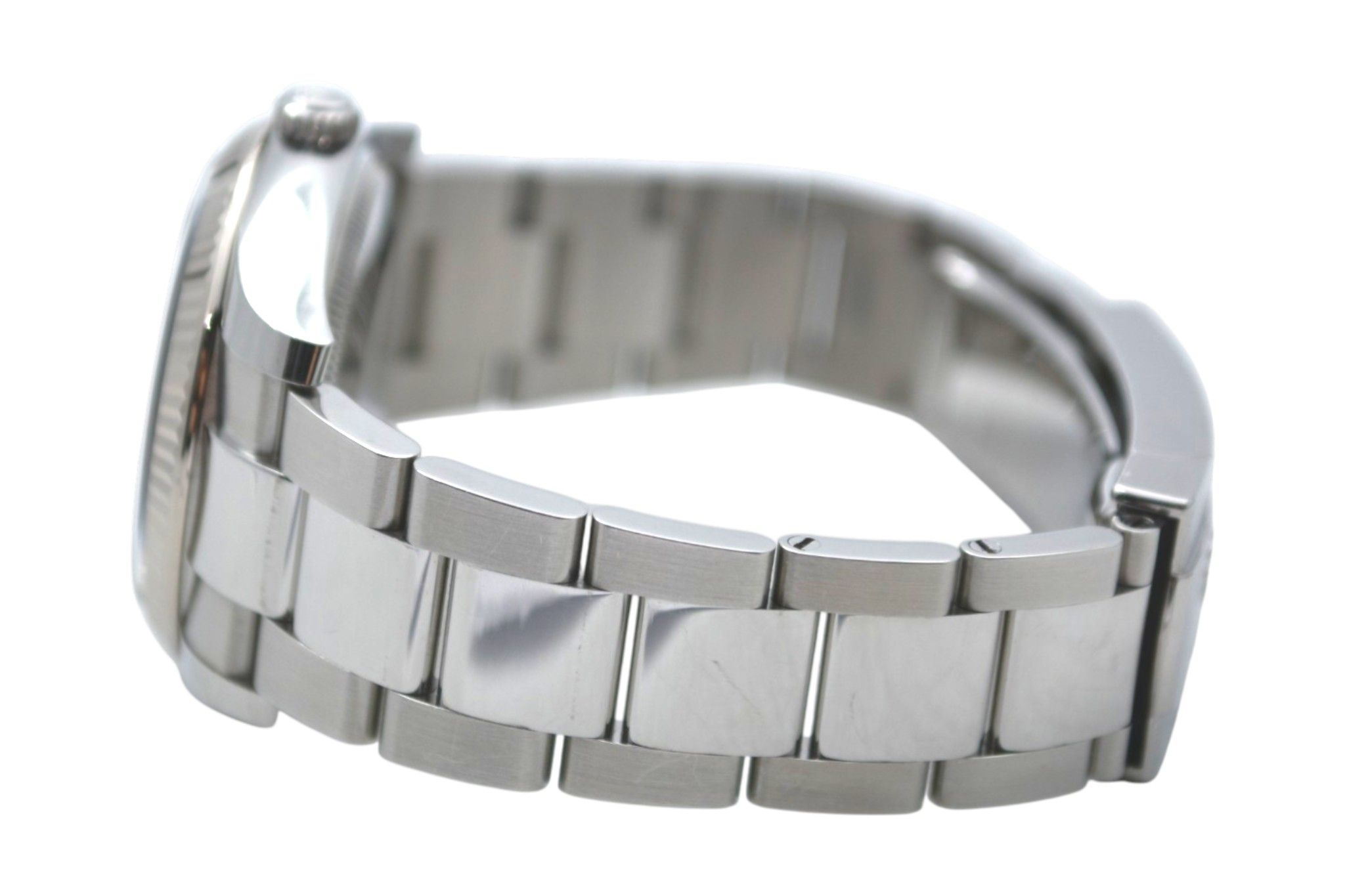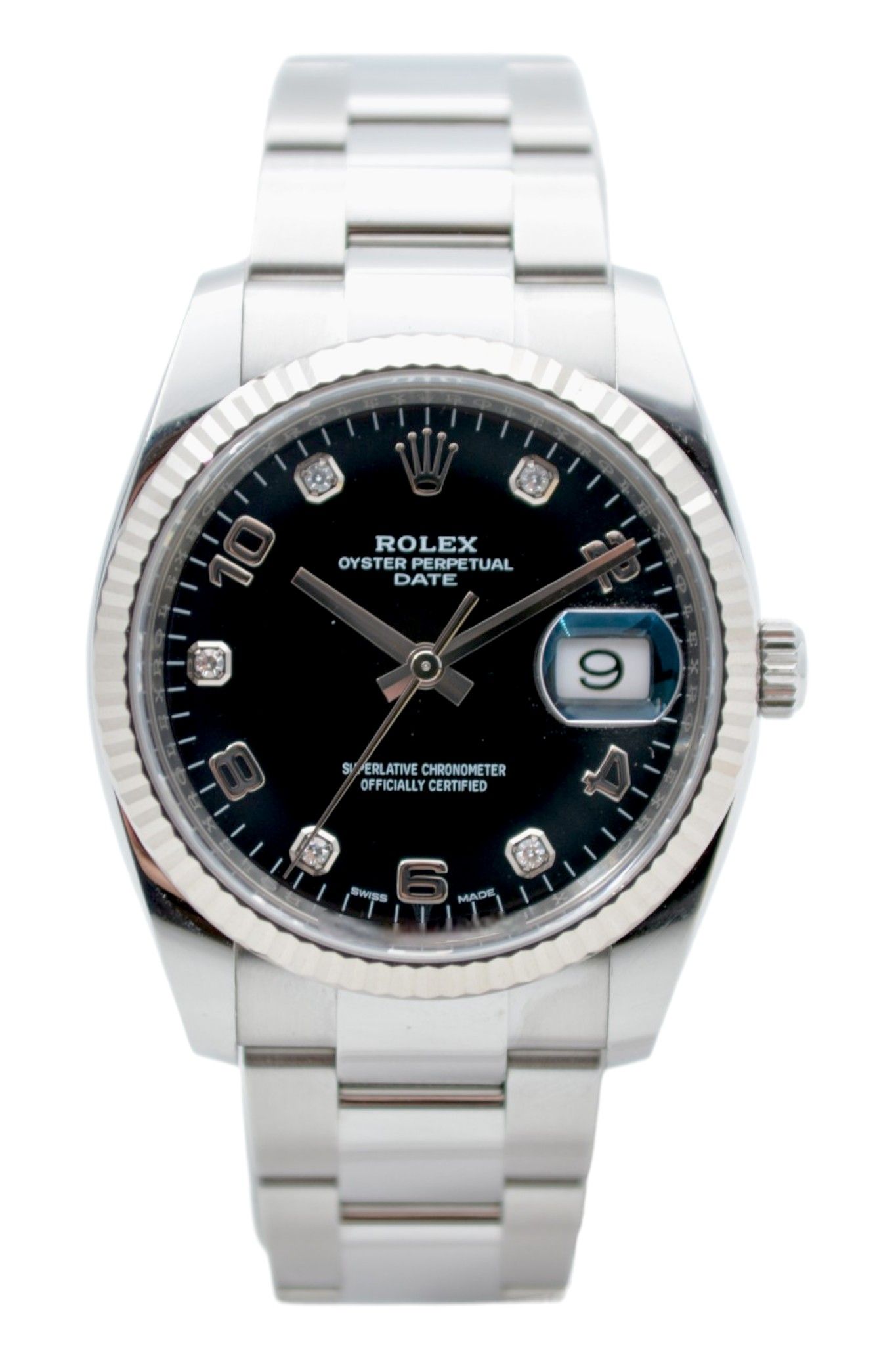 Crafted in stainless steel with an 18-carat white gold fluted bezel, the Oyster Perpetual Date Ref. 115234 embodies a subtle luxury that never seeks attention yet never goes unnoticed. The fluted bezel, one of Rolex’s most recognizable design signatures, catches the light with every movement, adding depth and character to the watch’s classic silhouette. Its 34 mm Oyster case is perfectly balanced — elegant on the wrist yet robust in construction. Built according to Rolex’s uncompromising standards, the case offers exceptional durability and water resistance up to 100 meters, protected by the famous screw-down crown and solid case architecture.