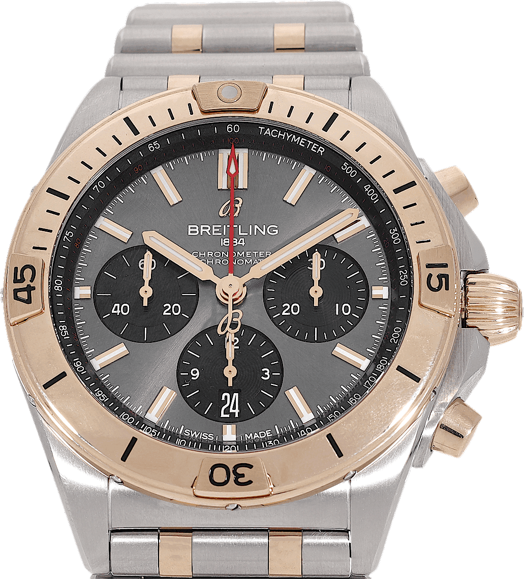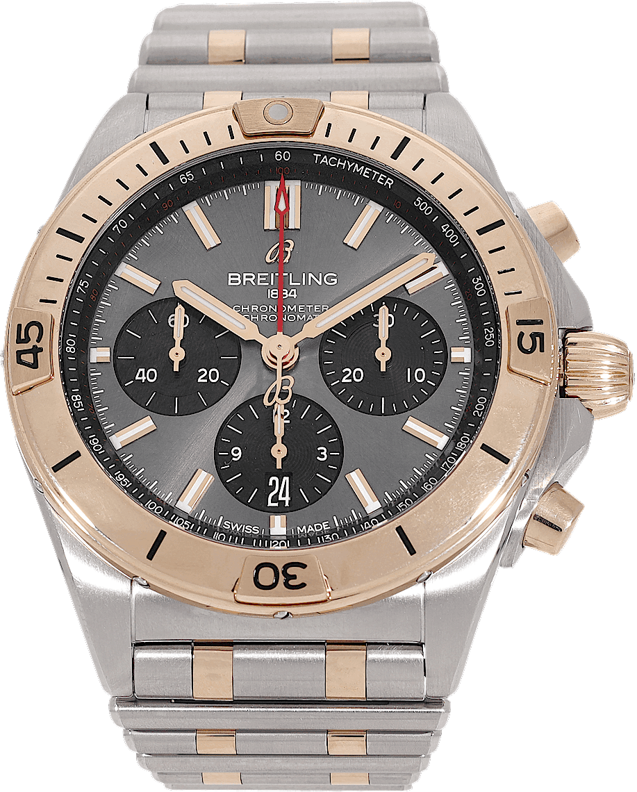 Breitling Chronomat 38, Reference: UB01341, Gender: Male, Size: 44mm, Dial color: Grey, Strap material: Stainless Steel Rose Gold, Movement: Automatic, Condition: Previously worn, minor to no signs of usage. The movement is flawless and the case has been cleaned. watch tested ensure full functionality. An inspection by our certified watchmakers guarantees its authenticity., Documents: Original papers, CHRONEXT Certificate