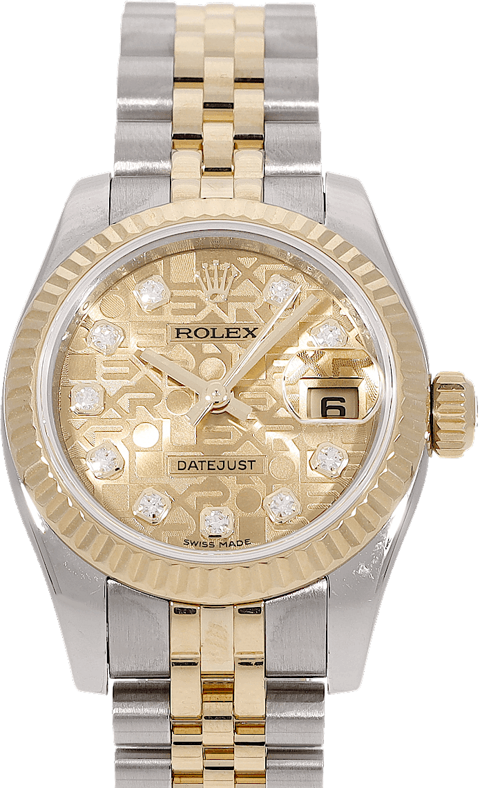 Rolex Lady-Datejust, Reference: 179173, Gender: Female, Size: 26mm, Dial color: Gold, Strap material: Stainless Steel Yellow Movement: Automatic, Year: 2015, Condition: Previously worn with some signs of usage. The movement is flawless and the case has been cleaned. watch tested to ensure full functionality. An inspection by our certified watchmakers guarantees its authenticity., Documents: Original papers, CHRONEXT Certificate