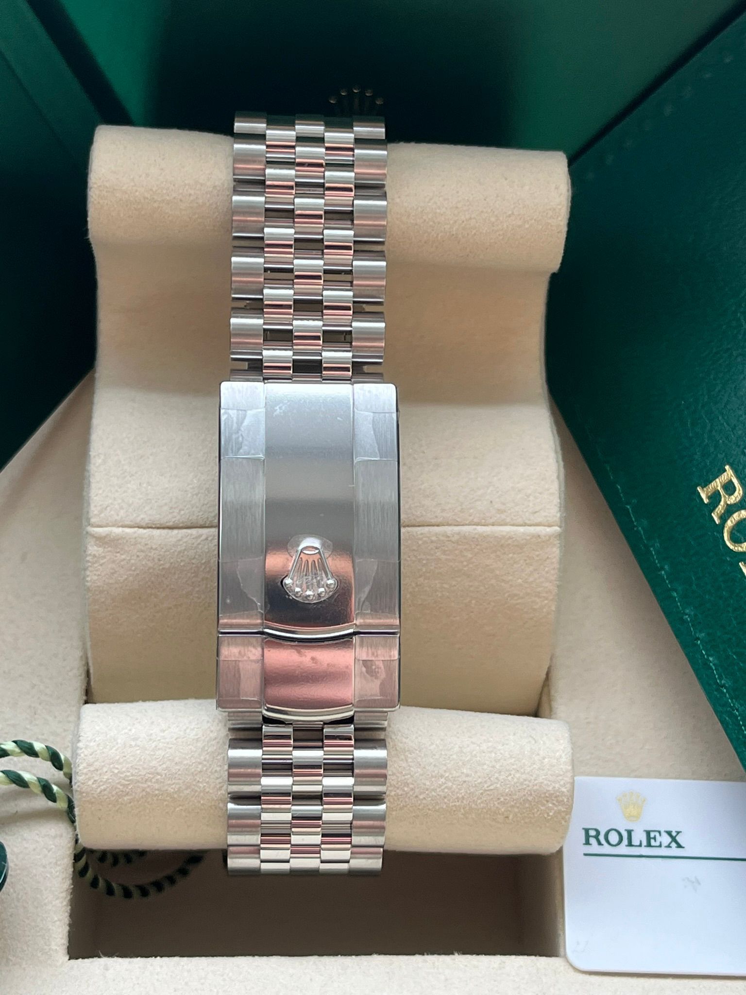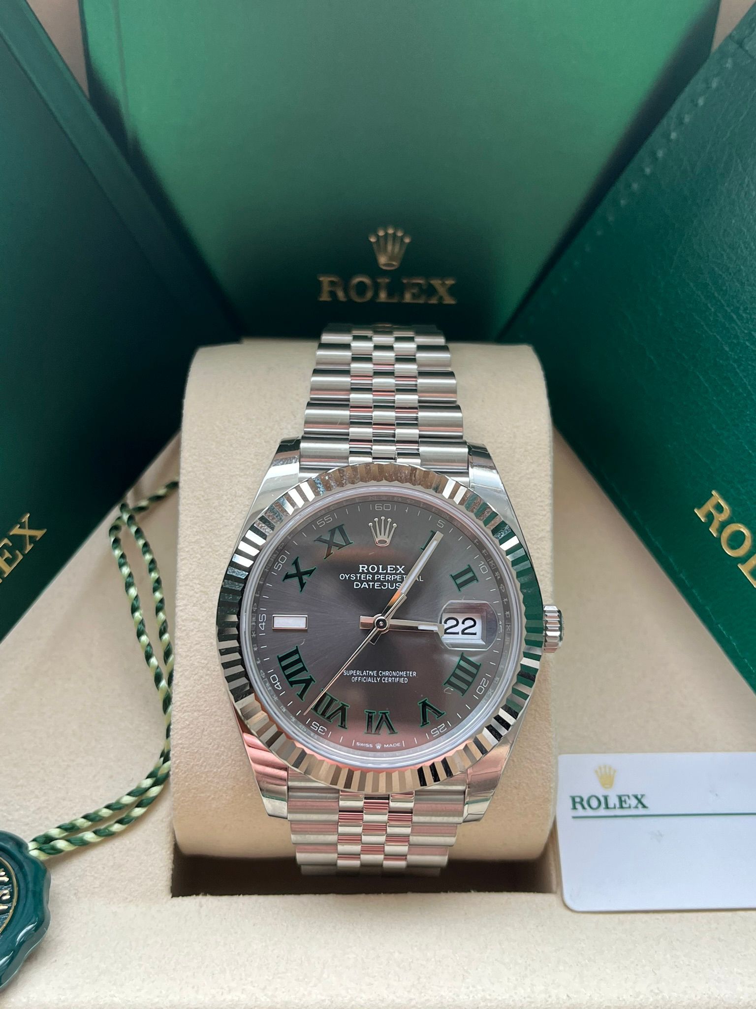 The watch is delivered as a full set, including the original Rolex box, warranty papers, booklets, and all original full links.