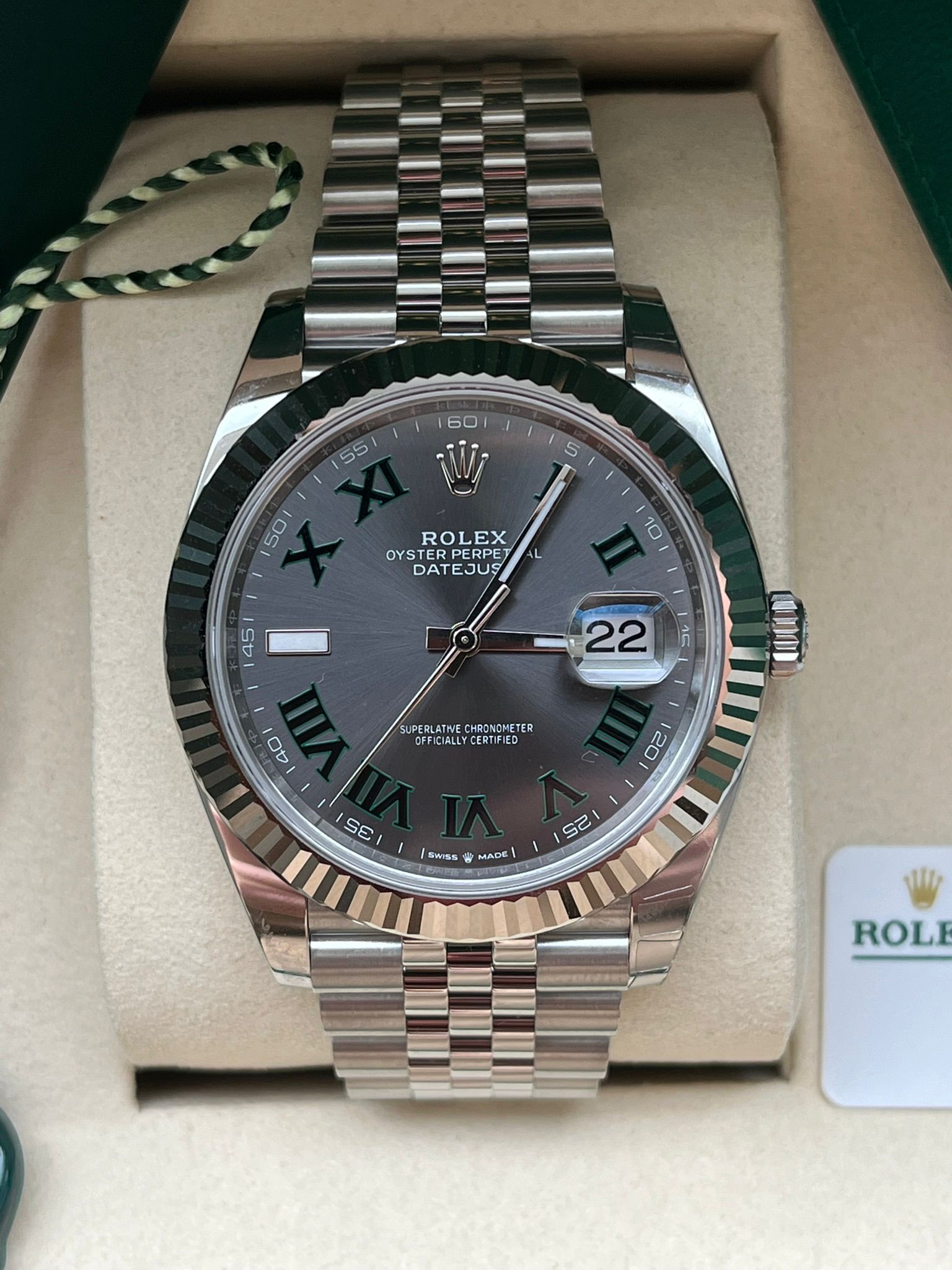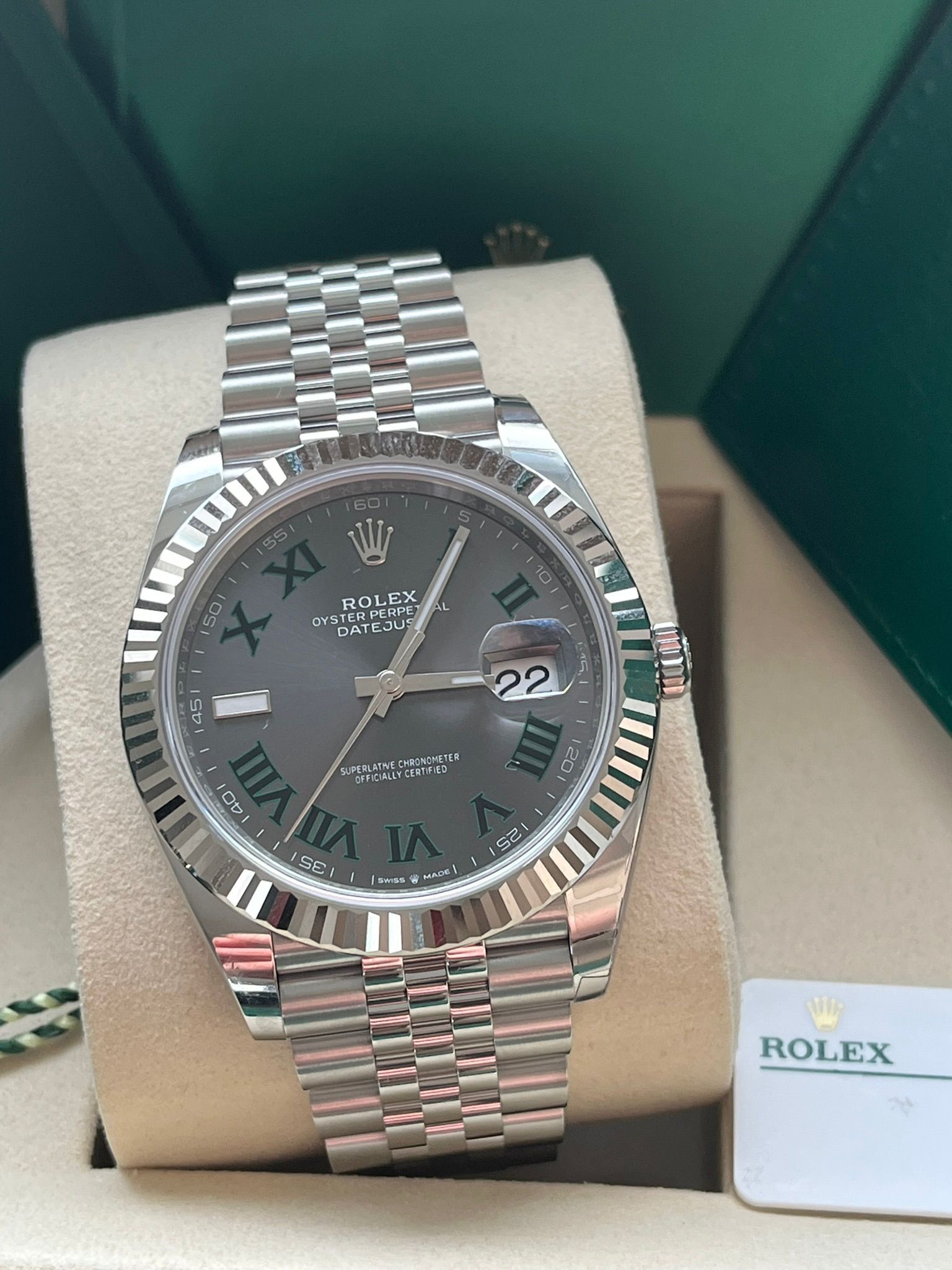 This iconic Rolex Datejust 41 ref. 126334 is presented with the striking green dial and the elegant white gold fluted bezel—one of the most modern and sought-after configurations within the Datejust collection. The combination of the 41 mm Oyster case in Oystersteel, the distinctive fluted bezel in 18k white gold, and the refined green dial results in a perfectly balanced timepiece that embodies Rolex’s timeless elegance and everyday versatility.This example is offered in new condition.