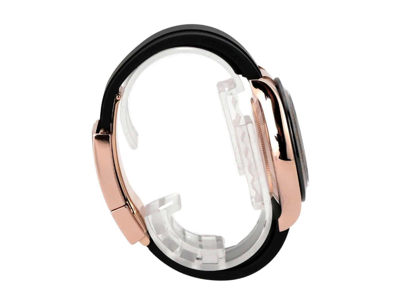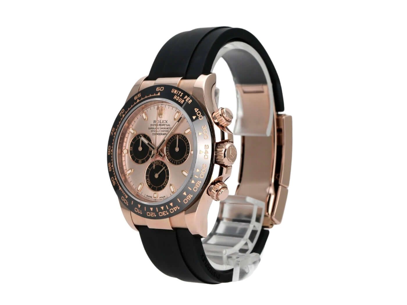 Rolex Cosmograph Daytona 18 kt Everose Gold / Oysterflex Ref. 116515LN SundustCase made of polished and satin-finished 18 kt Everose Gold, case diameter 40 mm, ceramic bezel with tachymeter, black Oysterflex strap with folding clasp, Sundust dial with luminous indices, black subdials, luminous hands, automatic movement, Rolex manufacture caliber 4130 with 44 jewels, frequency 28,800 vibrations per hour, chronometer, small seconds display at 6 o’clock, scratch-resistant sapphire crystal, screw-down 18 kt Everose Gold crown with crown guards, screw-down case back in 18 kt Everose Gold, water-resistant up to 10 bar.