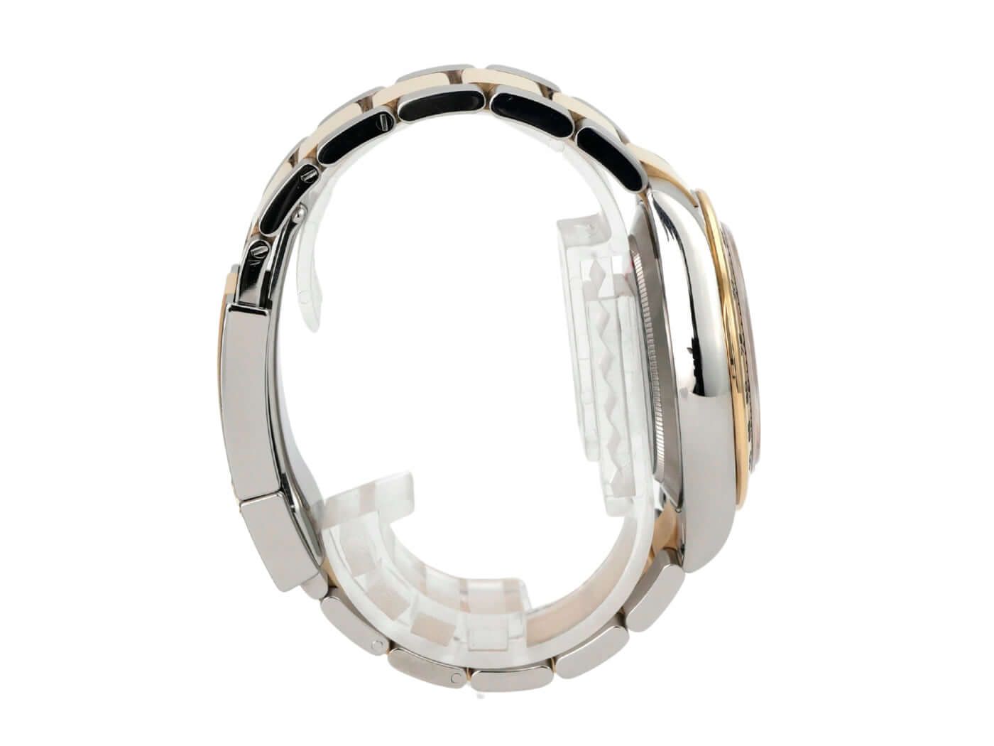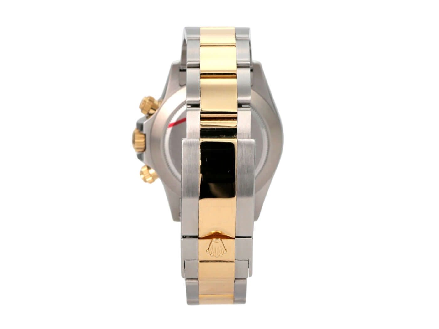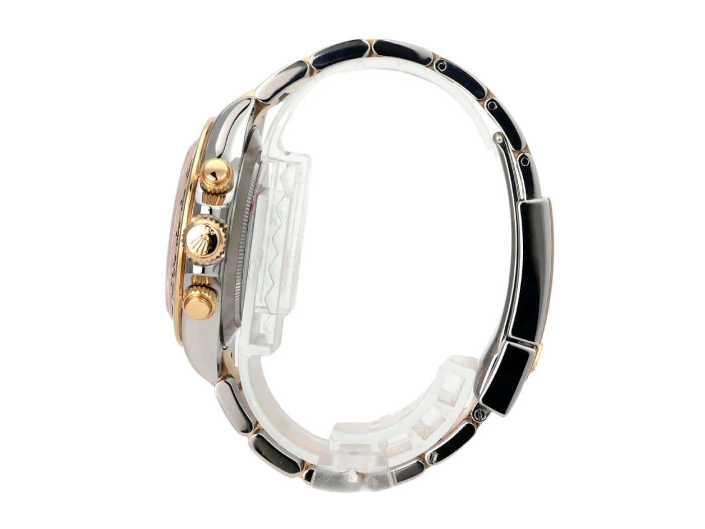 Caja de acero inoxidable pulido y satinado de 40 mm, bisel de oro amarillo de 18 quilates pulido con escala taquimétrica, pulsera de acero inoxidable Oyster / oro amarillo de 18 quilates pulido y satinado con cierre de seguridad plegable, esfera color champán con índices luminosos, manecillas luminosas, automático, calibre 4130 de manufactura Rolex, 44 rubíes, reserva de marcha de aproximadamente 72 horas, cronómetro, cristal de zafiro, corona atornillada con protectores de corona, fondo de caja atornillado de acero inoxidable, resistente al agua hasta 10 bar.