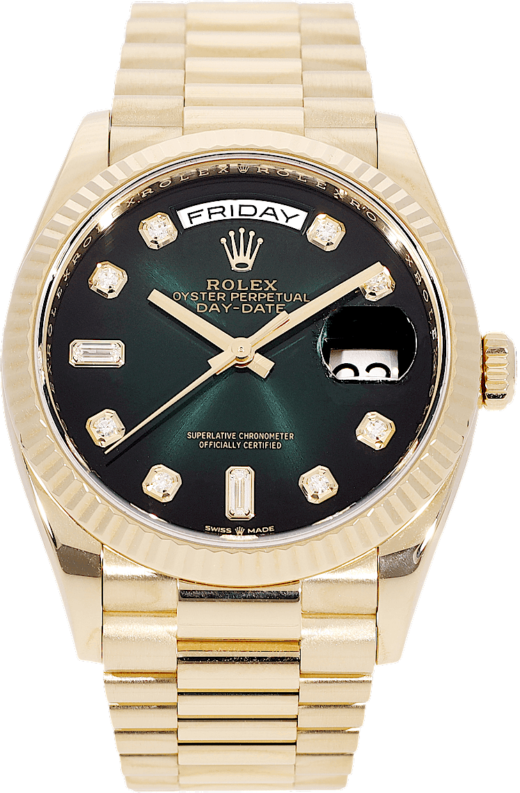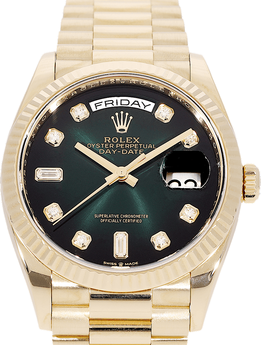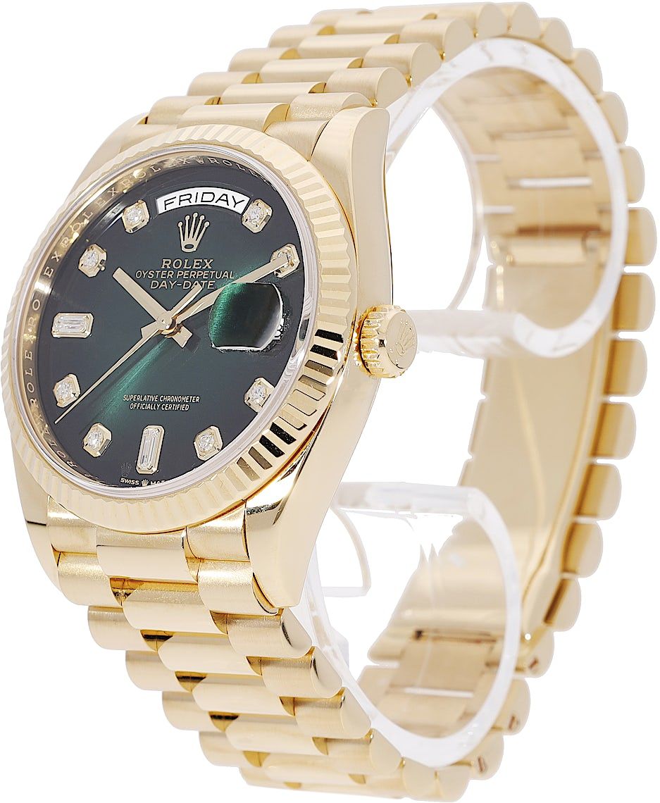 Rolex Day-Date 36, Reference: 128238, Gender: Unisex, Size: 36mm, Dial color: Green, Strap material: Yellow Gold, Movement: Automatic, Year: 2019, Condition: Previously worn, minor to no signs of usage. The movement is flawless and the case has been cleaned. watch tested ensure full functionality. An inspection by our certified watchmakers guarantees its authenticity., Documents: Original papers, CHRONEXT Certificate