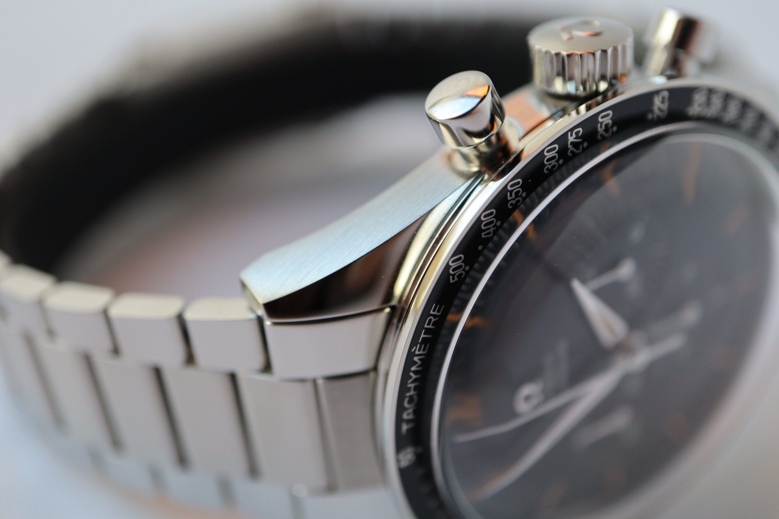La caja de 39.70 mm está hecha de acero inoxidable pulido y cepillado y cuenta con una pulsera de "eslabones planos" con el sistema de ajuste de liberación de confort patentado por OMEGA. El bisel está presentado en aluminio negro e incluye la legendaria escala taquimétrica con un emblemático "Punto sobre Noventa".