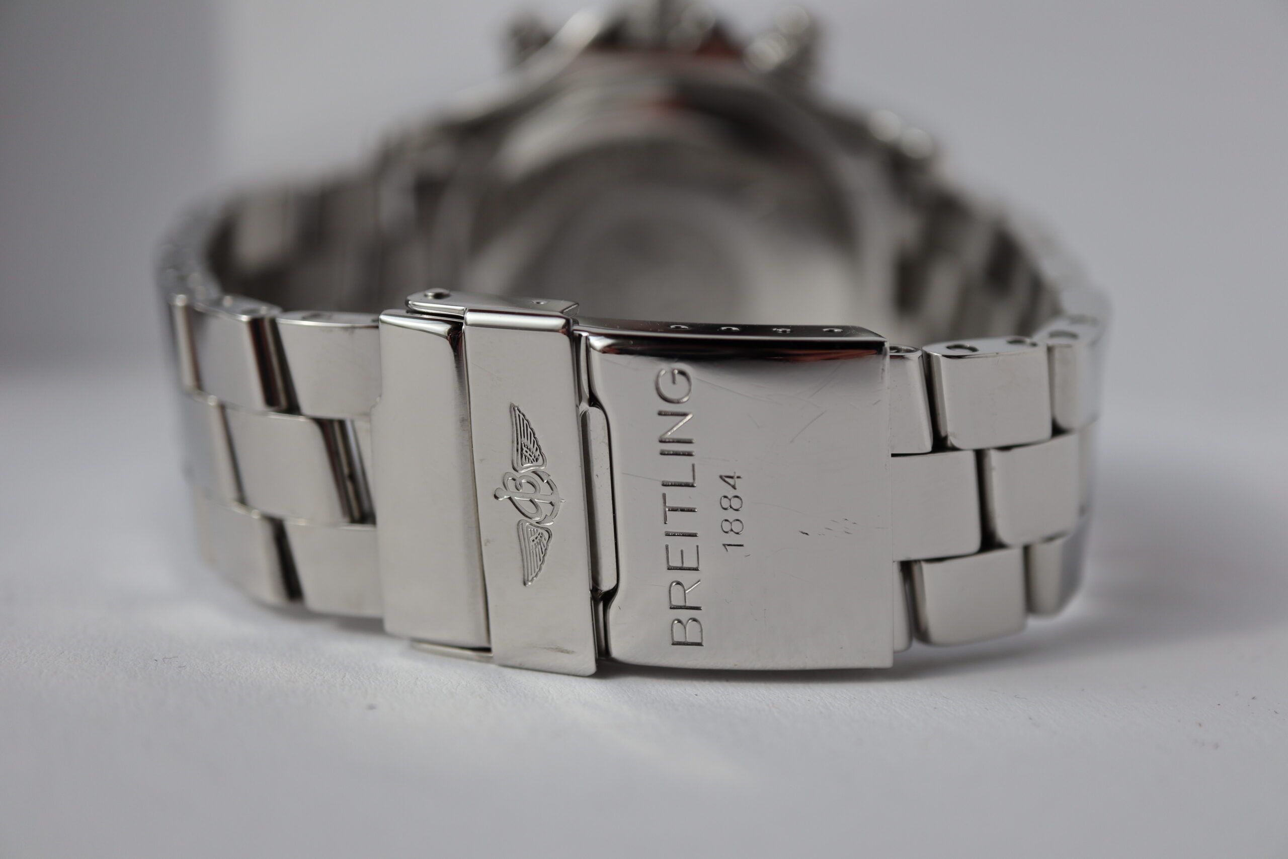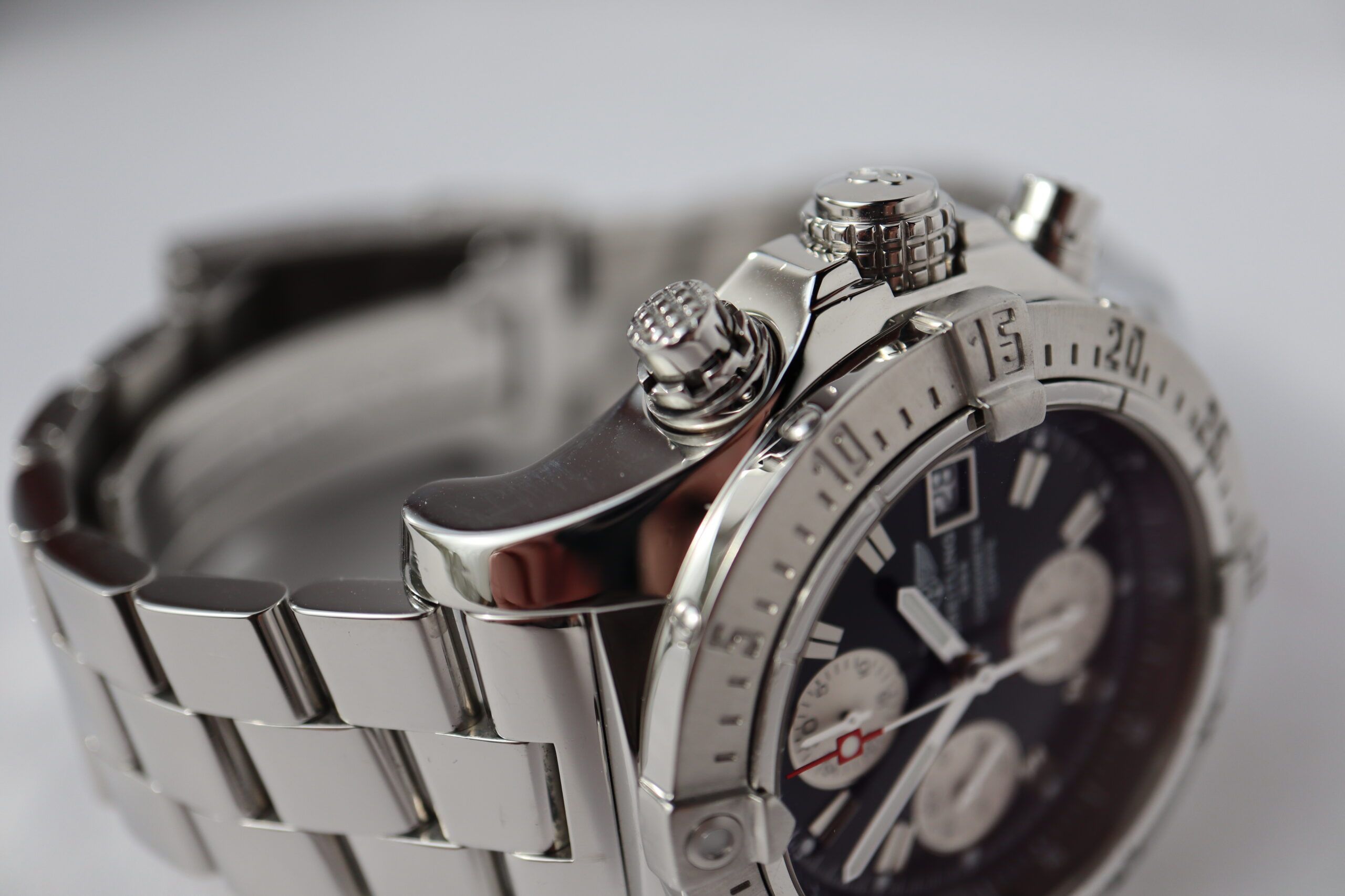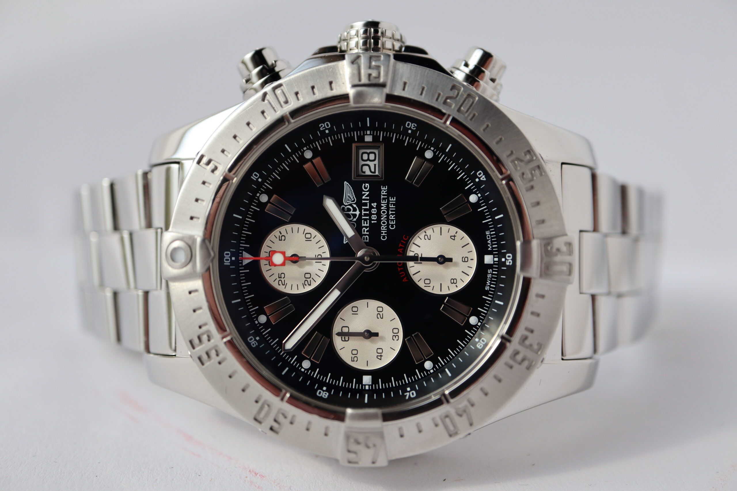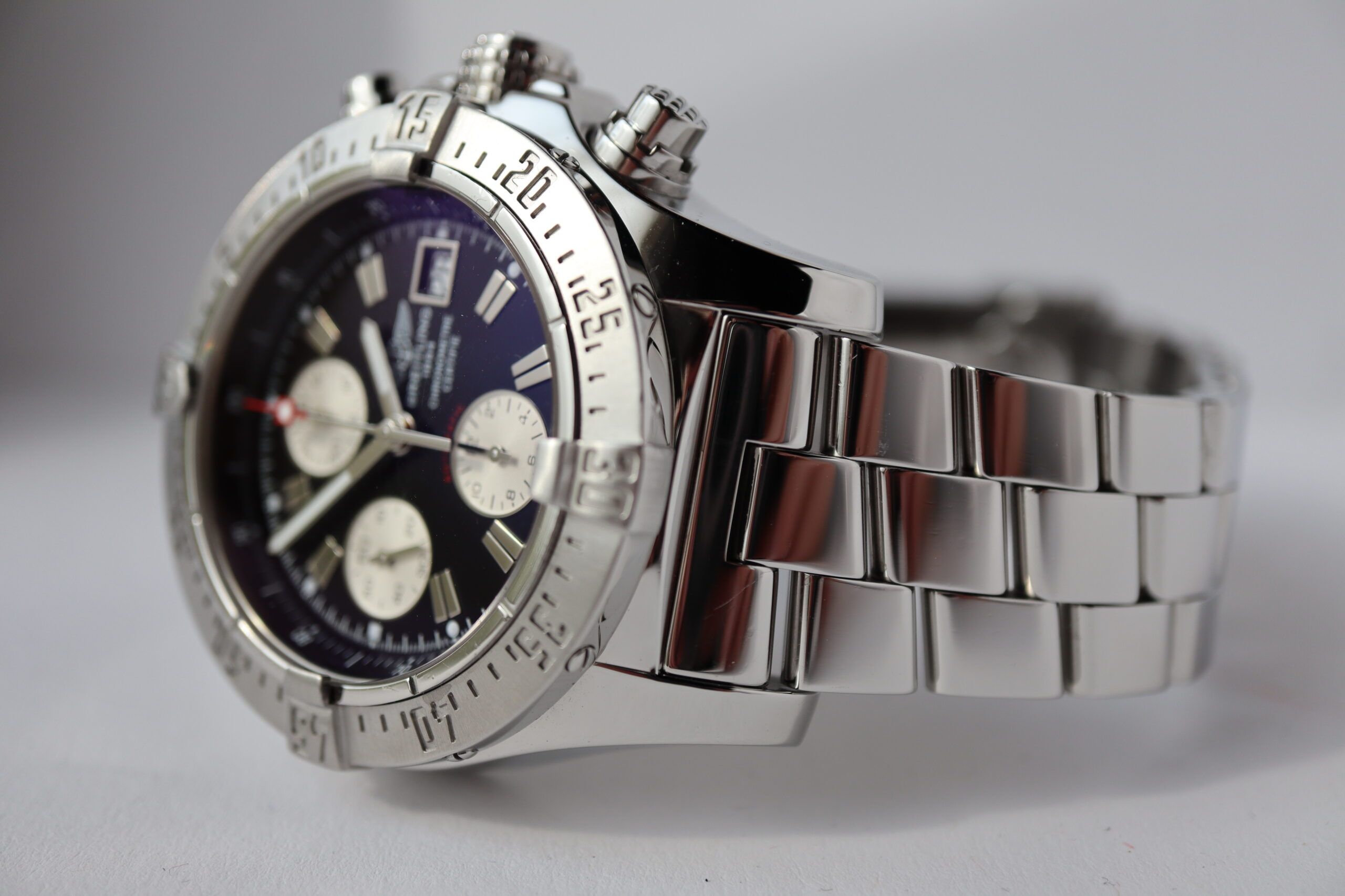 Breitling Super Avenger Skyland A13380 Men's Watch. 45 mm Stainless steel case with a unidirectional bezel. Black dial with Luminous Steel hands and index hour markers. Date display at 3 o'clock position. 22mm stainless steel bracelet with fold-over safety clasp. Calibre B13 automatic-self-wind movement featuring a 42-hour power reserve. Sapphire crystal glass.