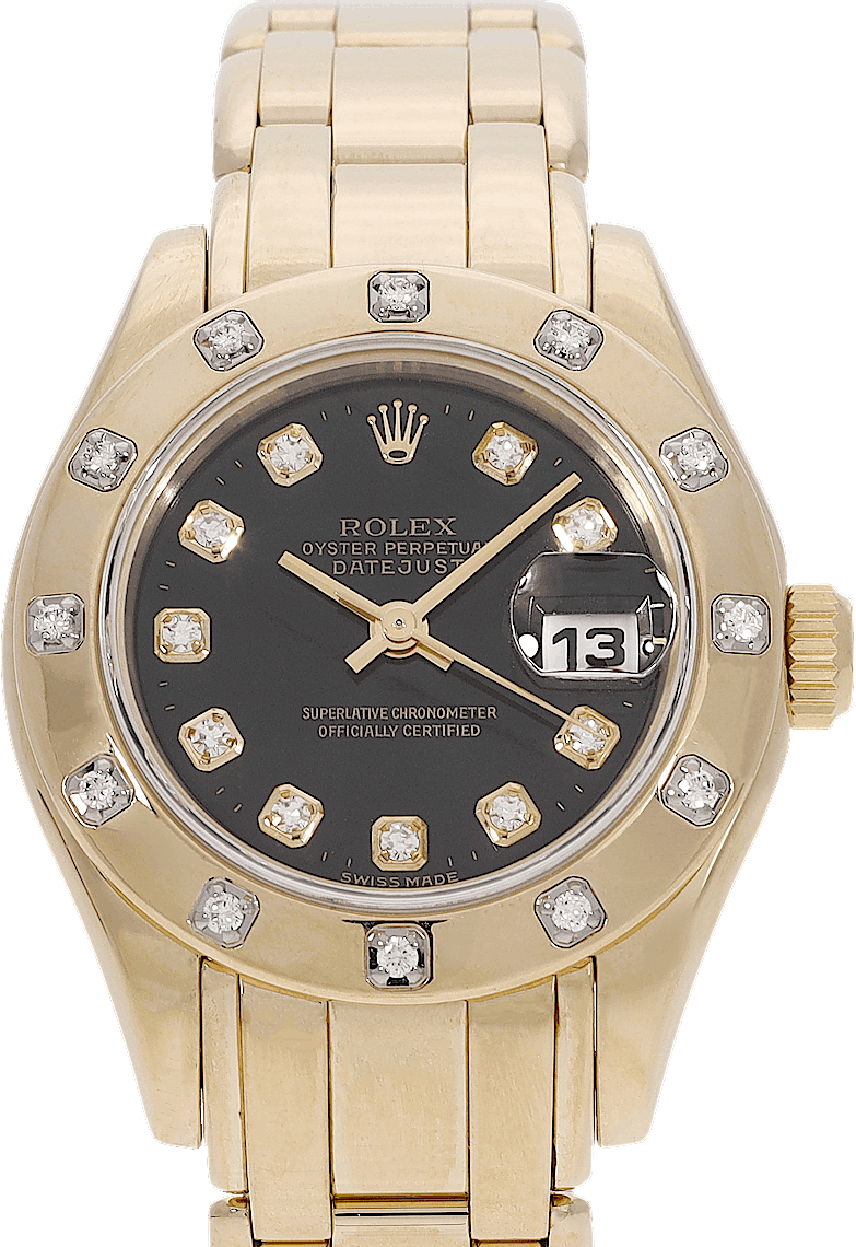 Rolex Lady-Datejust Pearlmaster, Reference: 69318, Gender: Female, Size: 34mm, Dial color: Black, Strap material: Yellow Gold, Movement: Automatic, Year: 1997, Condition: Previously worn with some signs of usage. The movement is flawless and the case has been cleaned. watch tested to ensure full functionality. An inspection by our certified watchmakers guarantees its authenticity., Documents: Original papers, CHRONEXT Certificate