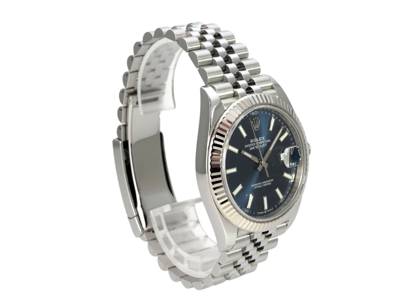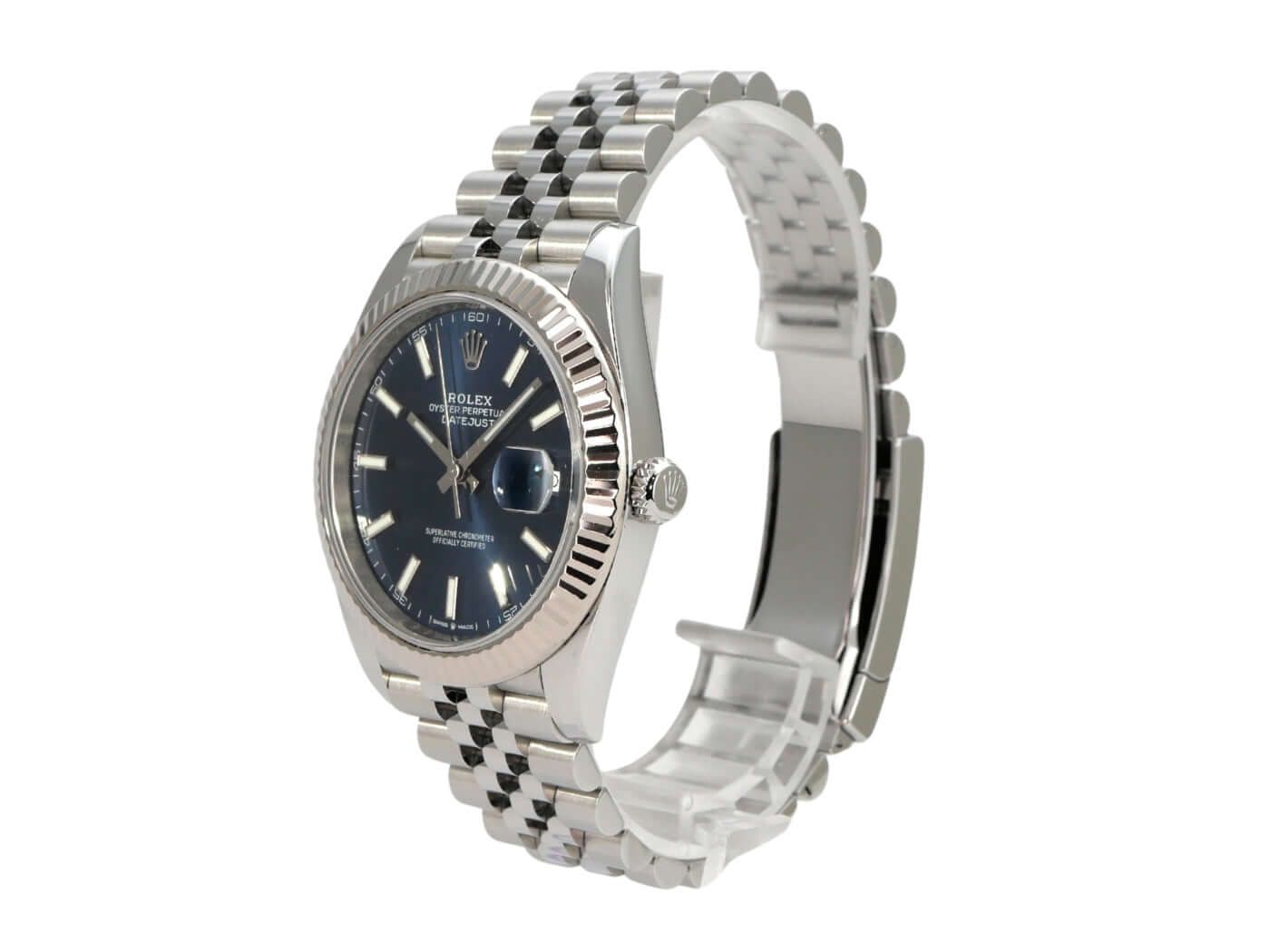 Rolex Datejust 41 Ref. 126334 Stainless Steel / White Gold Blue Jubilee Bracelet from 2021Polished and satin-finished stainless steel case, 41 mm case diameter, fluted 18 kt white gold bezel, polished and satin-finished stainless steel Jubilee bracelet with folding clasp, blue dial with 18 kt white gold luminous indices, luminous hands, automatic movement, Rolex manufacture caliber 3235, 70-hour power reserve, date display, chronometer, scratch-resistant sapphire crystal, screw-down crown, screwed stainless steel case back, water-resistant up to 10 bar.