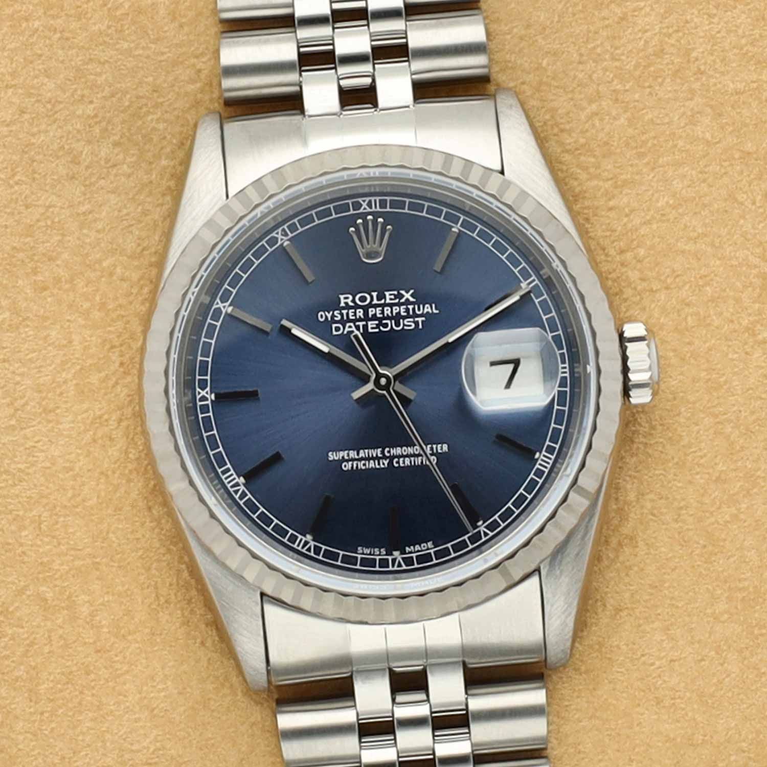 Impulsado por el calibre automático Rolex 3135, este Datejust ofrece un cronometraje fiable, una función de fecha rápida y una reserva de marcha de aproximadamente 48 horas.