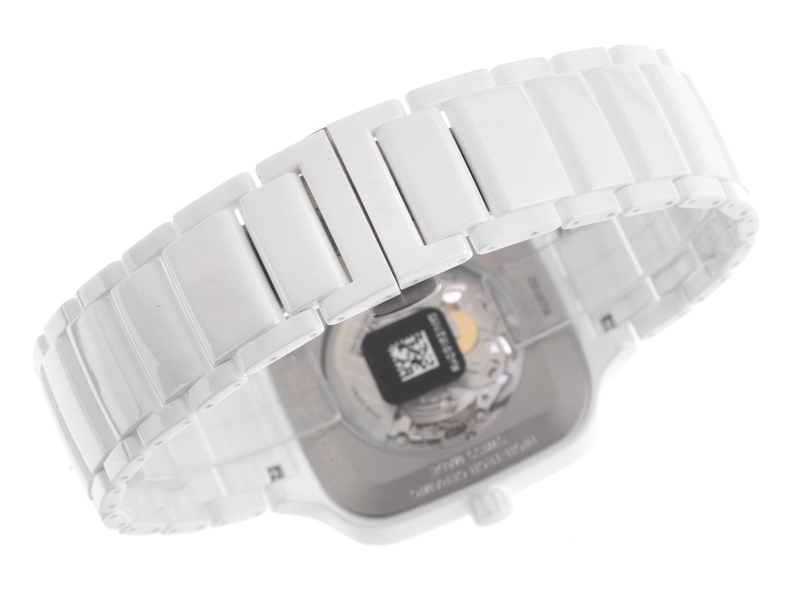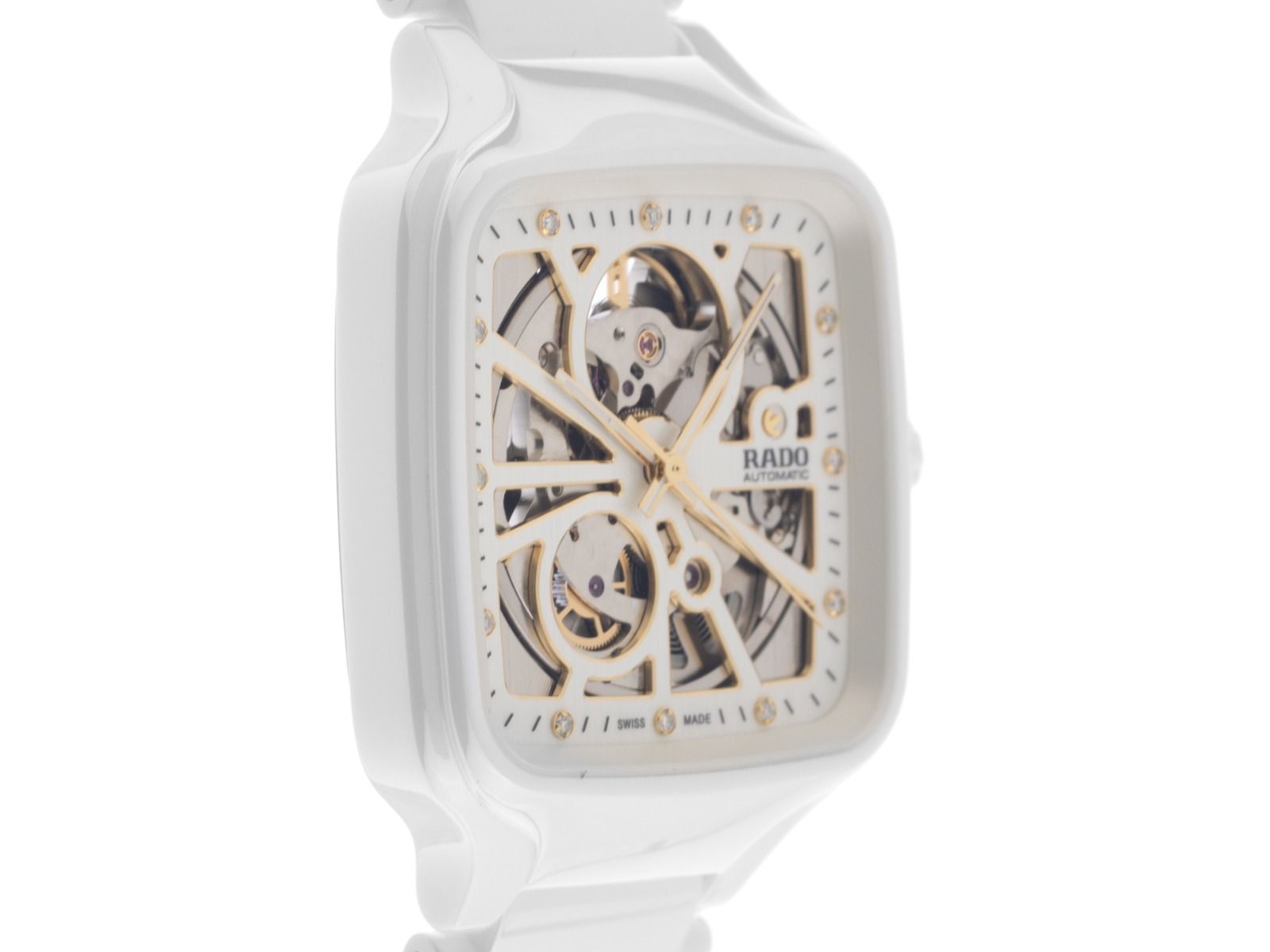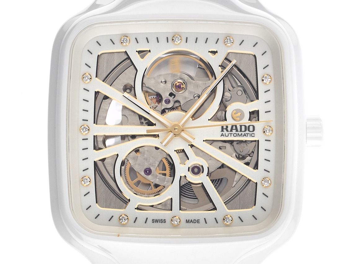Caja de Alta Tecnología Cerámica blanca, resistente a los arañazos, rectangular, dimensiones de la caja sin corona (L x A x H) 44 x 38 x 9,8mm. Pulsera de Alta Tecnología Cerámica blanca, resistente a los arañazos, cierre desplegable de doble seguridad oculto en titanio con el logo del fabricante. Esfera esqueletizada con 12 índices de diamante engastados en oro amarillo y agujas en oro amarillo, en total aproximadamente 0,096ct TW / VS - SI (blanco fino con inclusiones muy pequeñas hasta casi sin inclusiones). Movimiento automático, calibre Rado R734 con 25 piedras preciosas, reserva de marcha de aproximadamente 80 horas. Indicación de hora, minuto y segundo a través de agujas centrales con parada de segundero para un ajuste preciso de la hora. Cristal de zafiro resistente a los arañazos. Corona de cerámica blanca. Fondo de acero inoxidable atornillado y grabado. Peso del reloj incluyendo la pulsera 117g, longitud de la pulsera incluyendo la caja 210mm. Número de referencia: R27073702, ID: ST559247600326H-3450, número de artículo: 10000085313. Caja original de Rado con caja exterior y documentos de garantía de 2026, así como descripción, Full Set. Sin usar. Tiempo de entrega inmediato.