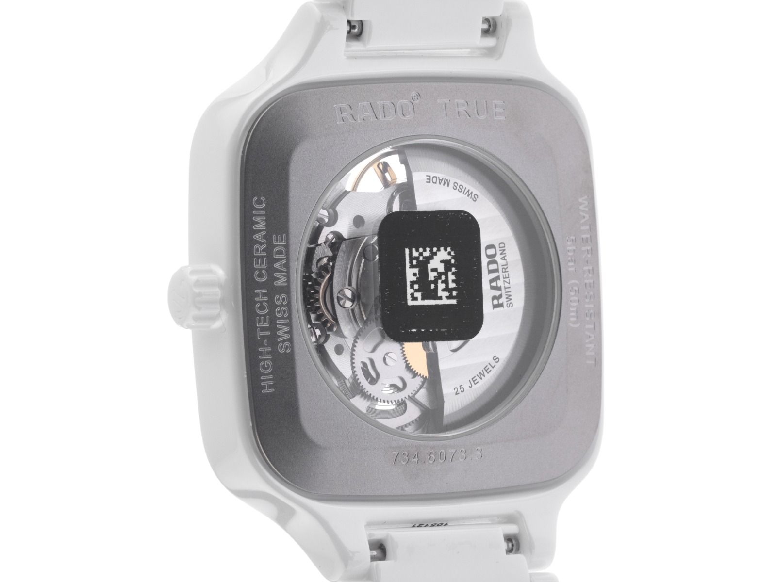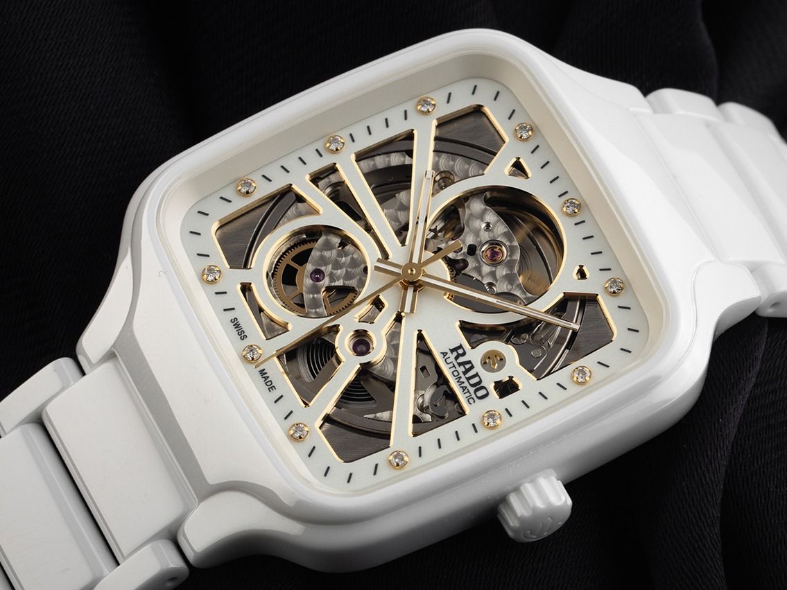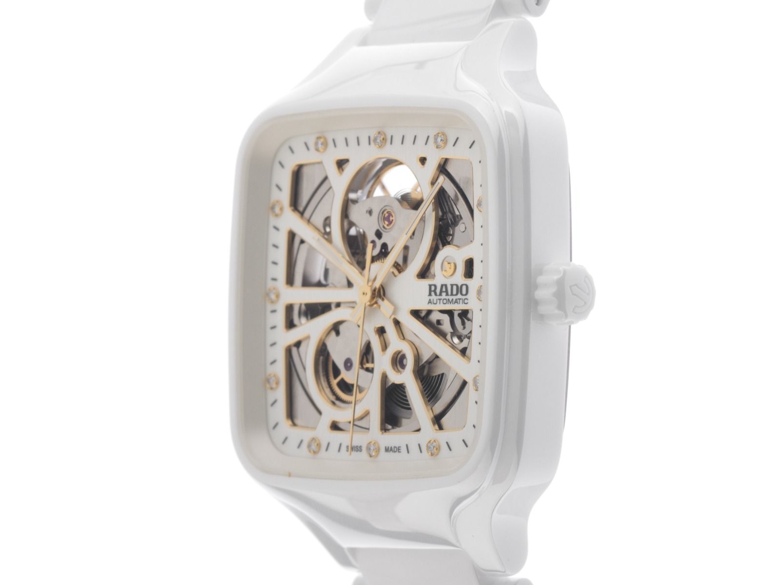 Caja de Alta Tecnología Cerámica blanca, resistente a los arañazos, rectangular, dimensiones de la caja sin corona (L x A x H) 44 x 38 x 9,8mm. Pulsera de Alta Tecnología Cerámica blanca, resistente a los arañazos, cierre desplegable de doble seguridad oculto en titanio con el logo del fabricante. Esfera esqueletizada con 12 índices de diamante engastados en oro amarillo y agujas en oro amarillo, en total aproximadamente 0,096ct TW / VS - SI (blanco fino con inclusiones muy pequeñas hasta casi sin inclusiones). Movimiento automático, calibre Rado R734 con 25 piedras preciosas, reserva de marcha de aproximadamente 80 horas. Indicación de hora, minuto y segundo a través de agujas centrales con parada de segundero para un ajuste preciso de la hora. Cristal de zafiro resistente a los arañazos. Corona de cerámica blanca. Fondo de acero inoxidable atornillado y grabado. Peso del reloj incluyendo la pulsera 117g, longitud de la pulsera incluyendo la caja 210mm. Número de referencia: R27073702, ID: ST559247600326H-3450, número de artículo: 10000085313. Caja original de Rado con caja exterior y documentos de garantía de 2026, así como descripción, Full Set. Sin usar. Tiempo de entrega inmediato.