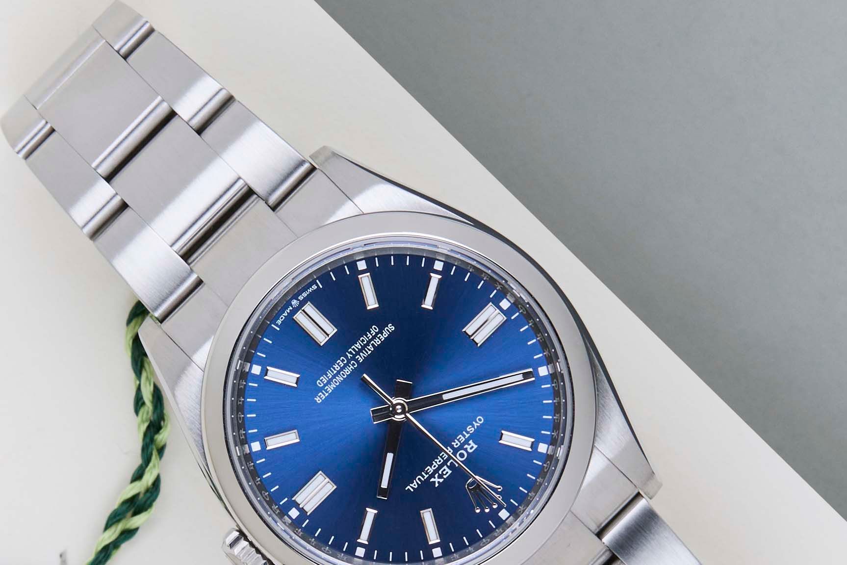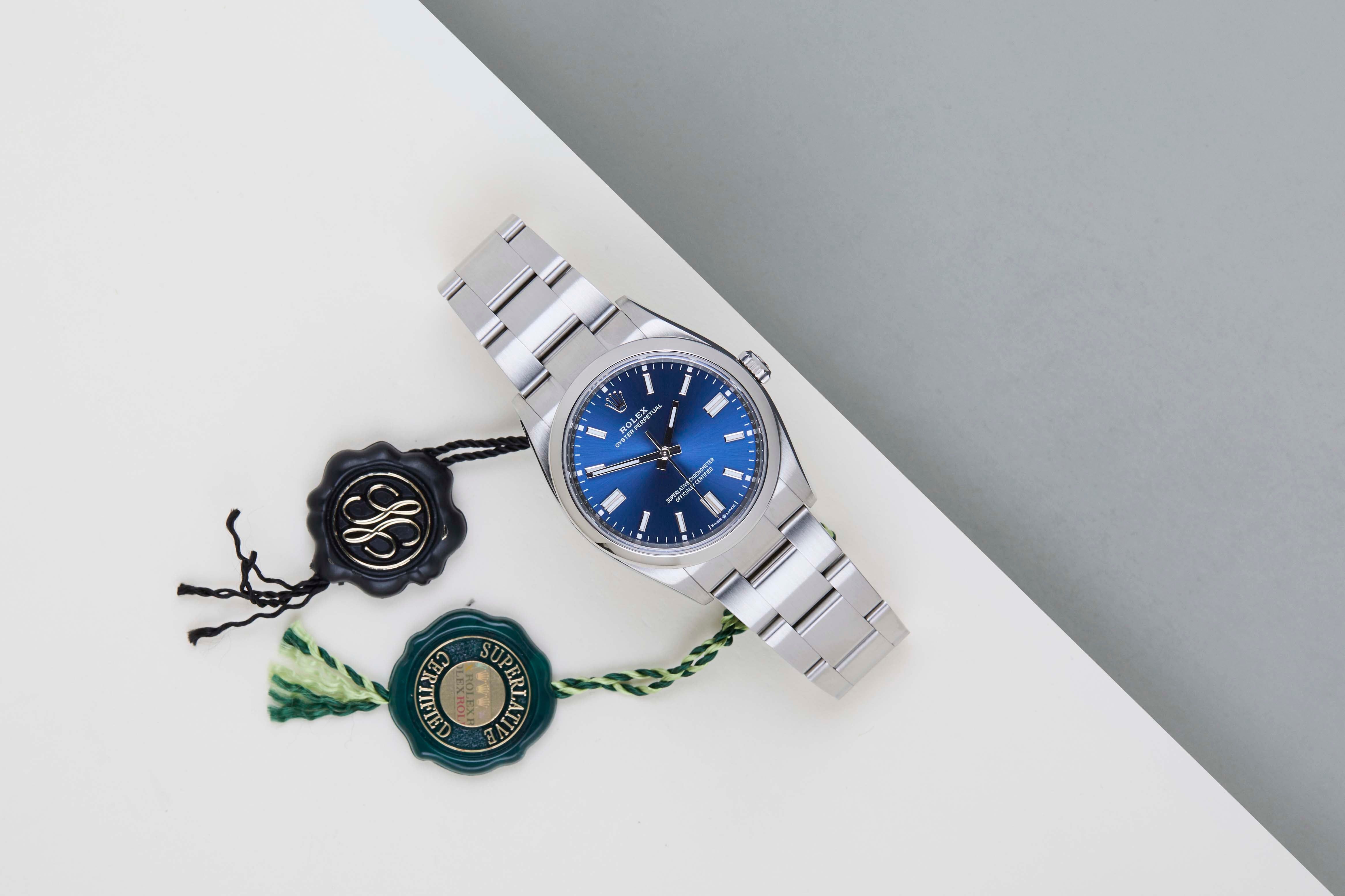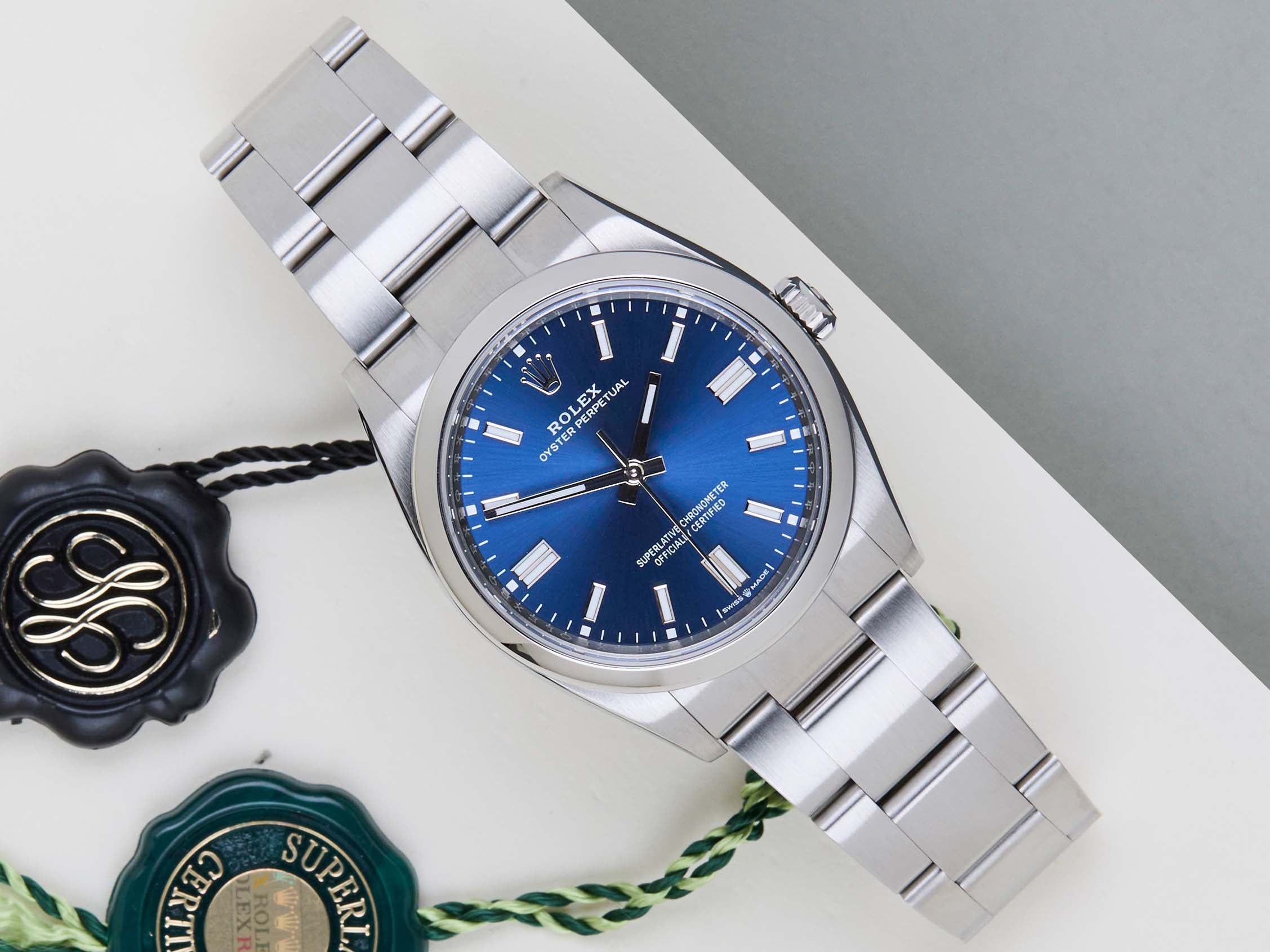 Full Set | International Rolex Warranty until October 2028The Rolex Oyster Perpetual was first introduced by Rolex in the 1930s. It is characterized by its water-resistant Oyster case and self-winding Perpetual movement. The Rolex Oyster Perpetual a simple, yet elegant timepiece that is suitable for both casual and formal wear.This Rolex Oyster Perpetual 36 ‘Blue Dial’ was sold for the first time in October 2023.The watch is fully made out of stainless steel. Rolex uses 904L in it’s steel watches, which is an extremely resistant and highly polishable superalloy.This amazing Rolex Oyster Perpetual is in Mint Condition and comes with the original Rolex Warranty Card and Box. Furthermore, the watch still has Worldwide Rolex Warranty until October 2028.