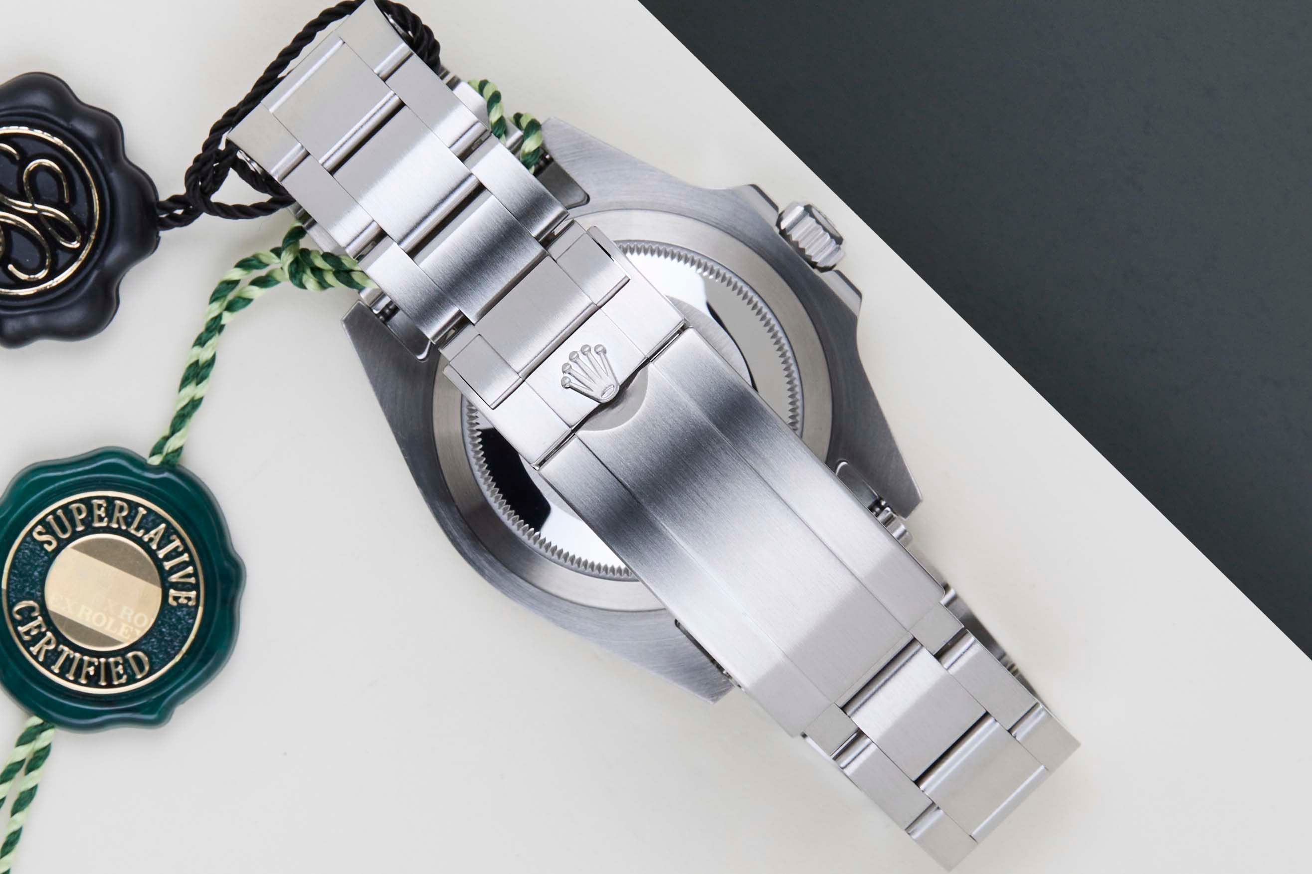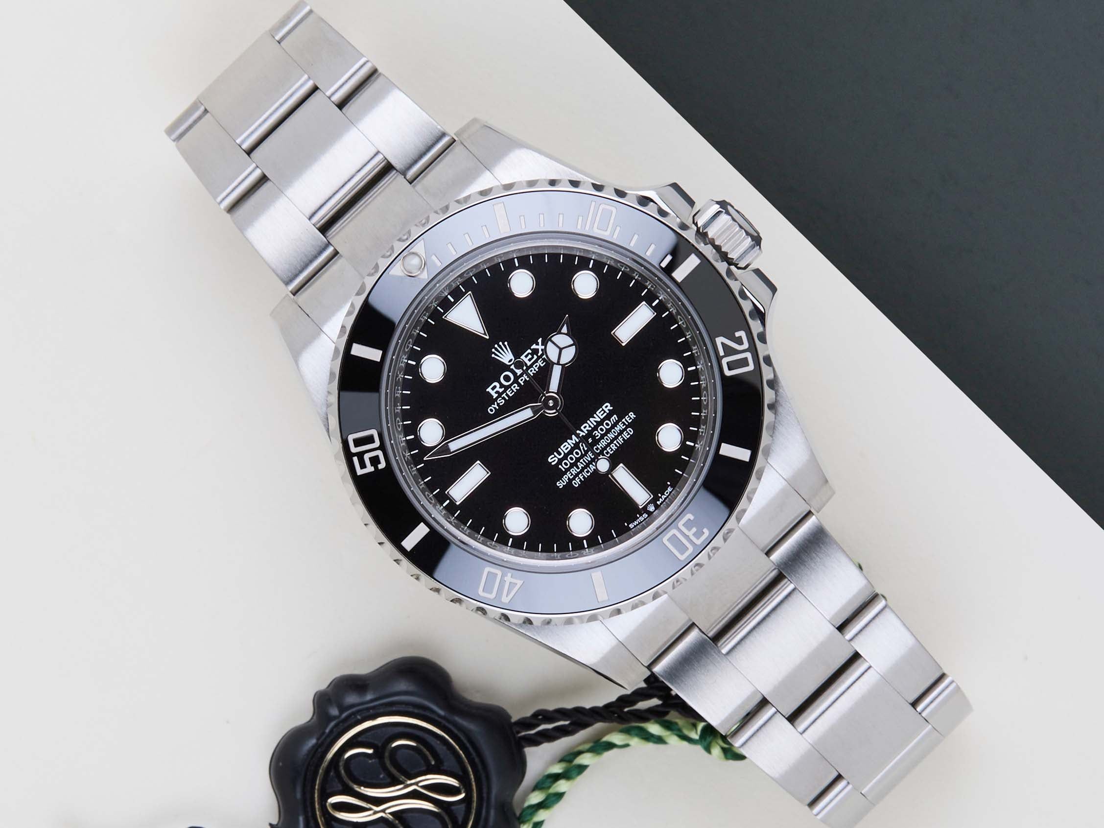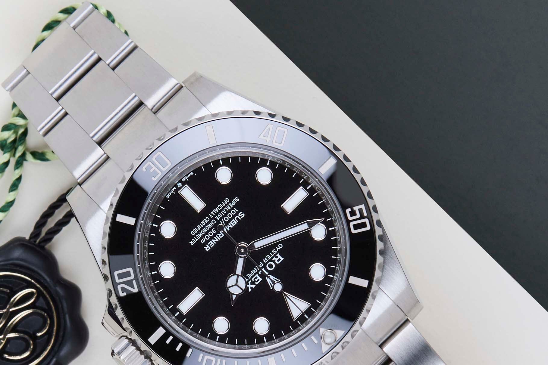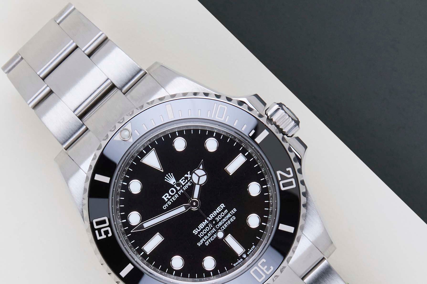 Este Rolex Submariner No Date se vendió por primera vez en mayo de 2022. El reloj está completamente hecho de acero inoxidable. Rolex utiliza 904L en sus relojes de acero, que es una superaleación extremadamente resistente y altamente pulible. Este Rolex está equipado con una esfera Chromalight que se puede reconocer por su luminiscencia azul.