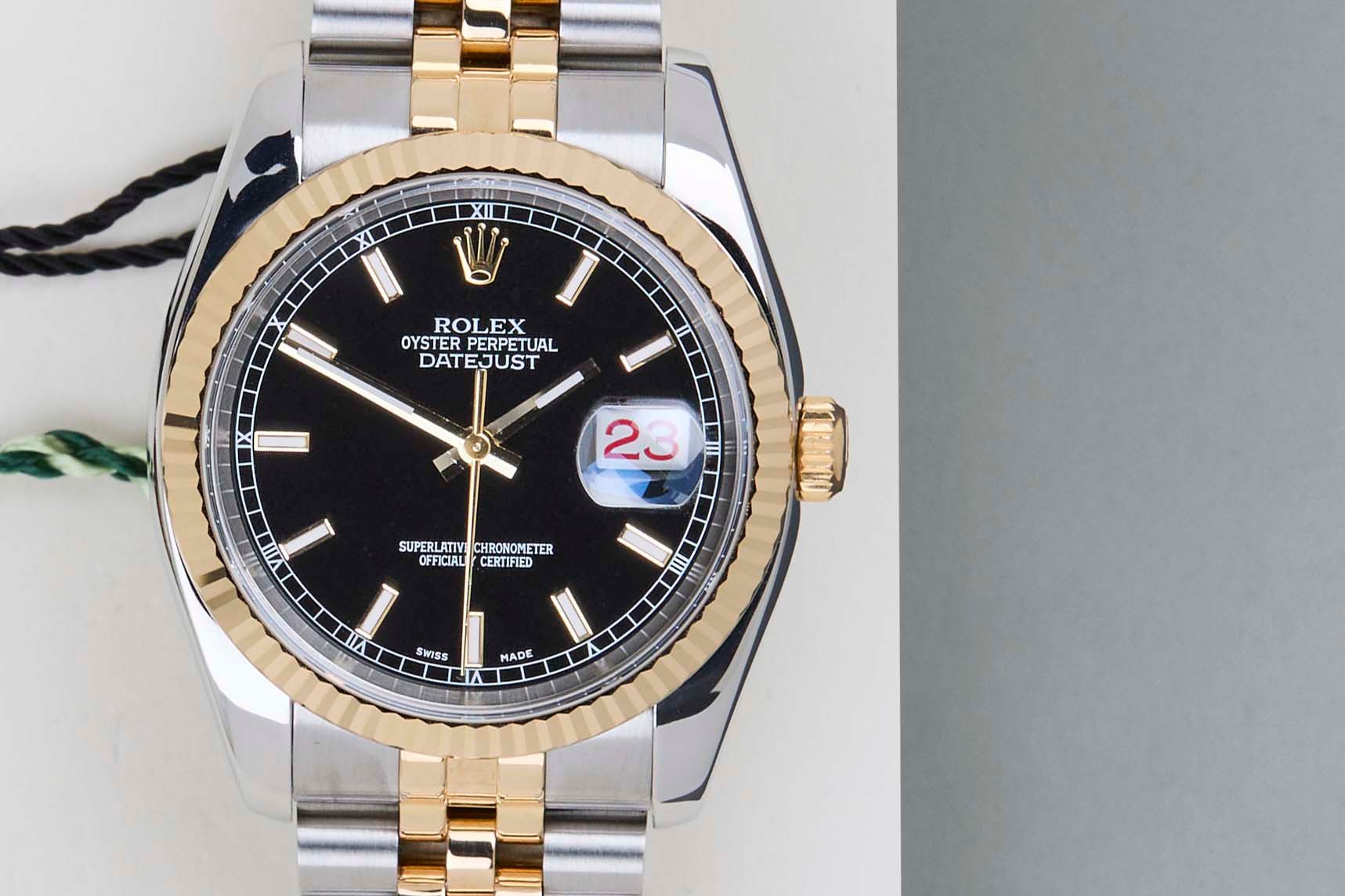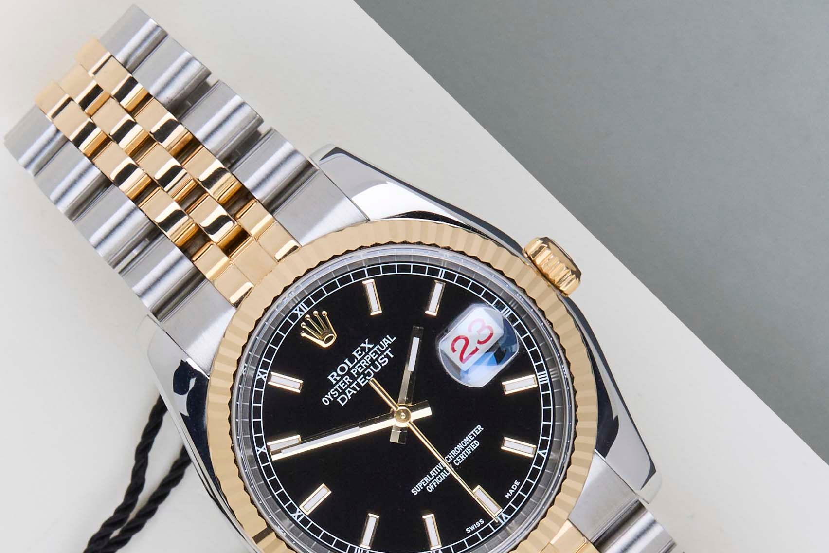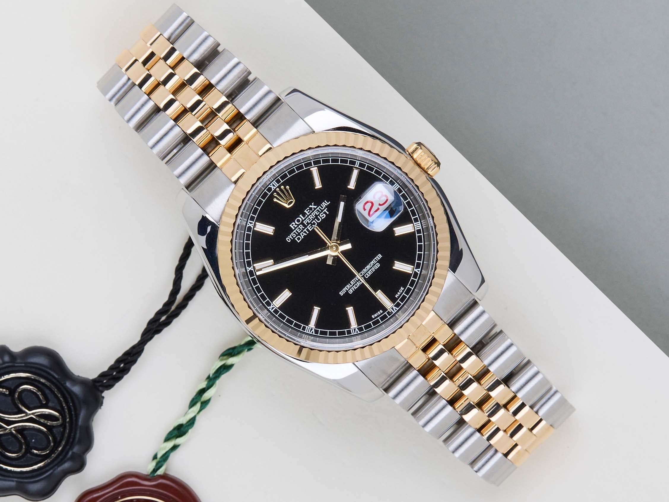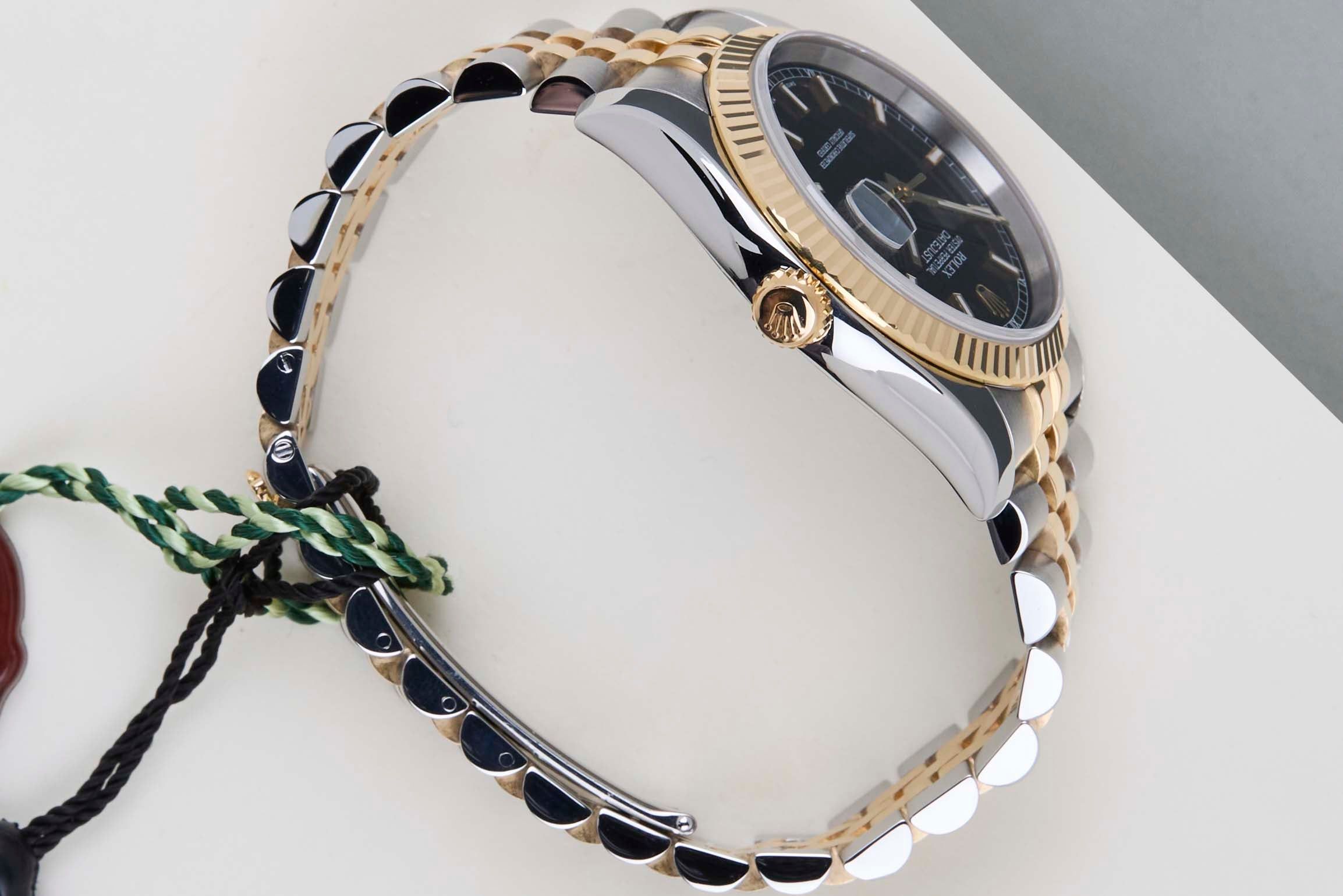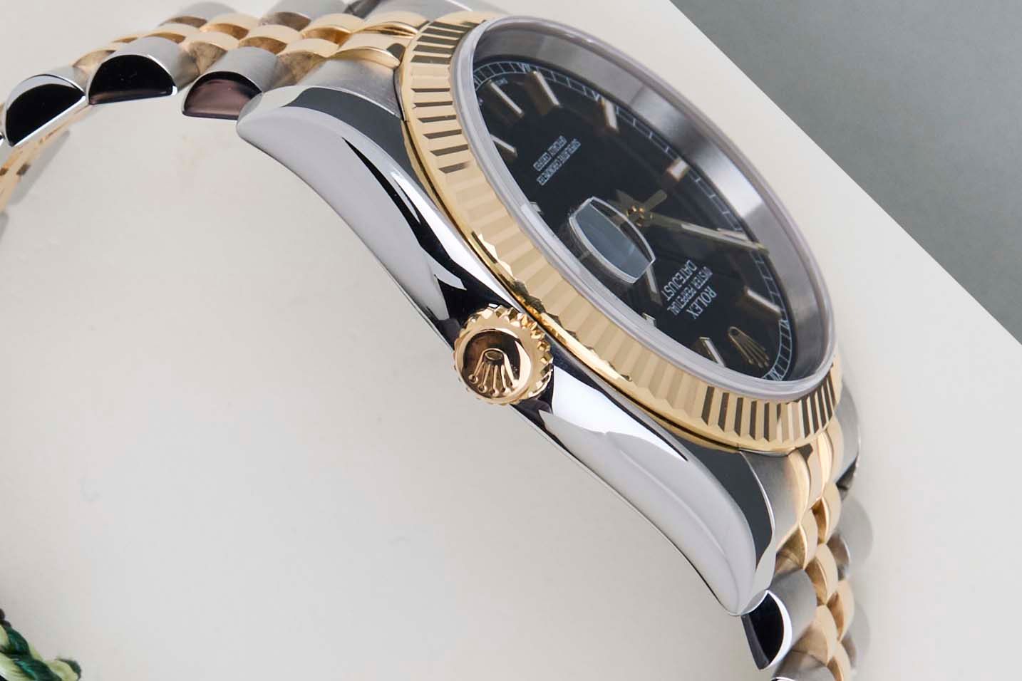 Full Set | Roulette Date WheelRolex introduced the original Datejust in 1945 to celebrate the company's 40th anniversary. Due to the various case sizes and materials, the Datejust has been ingrained in Rolex's history and remains incredibly popular for 75 years.This Rolex Datejust 'Black Dial' was sold for the first time in February 2015.This Datejust is made of a combination of 18k Yellow Gold and stainless steel and is fitted with a Jubilee bracelet which conceals the Crownclasp. The timepiece features a Black Dial.This Rolex Datejust 36 is in Mint condition and comes with the original Rolex Warranty Papers and Box. Furthermore, the watch has been serviced by our watchmaker, and therefore it comes with one year of Steiner warranty.