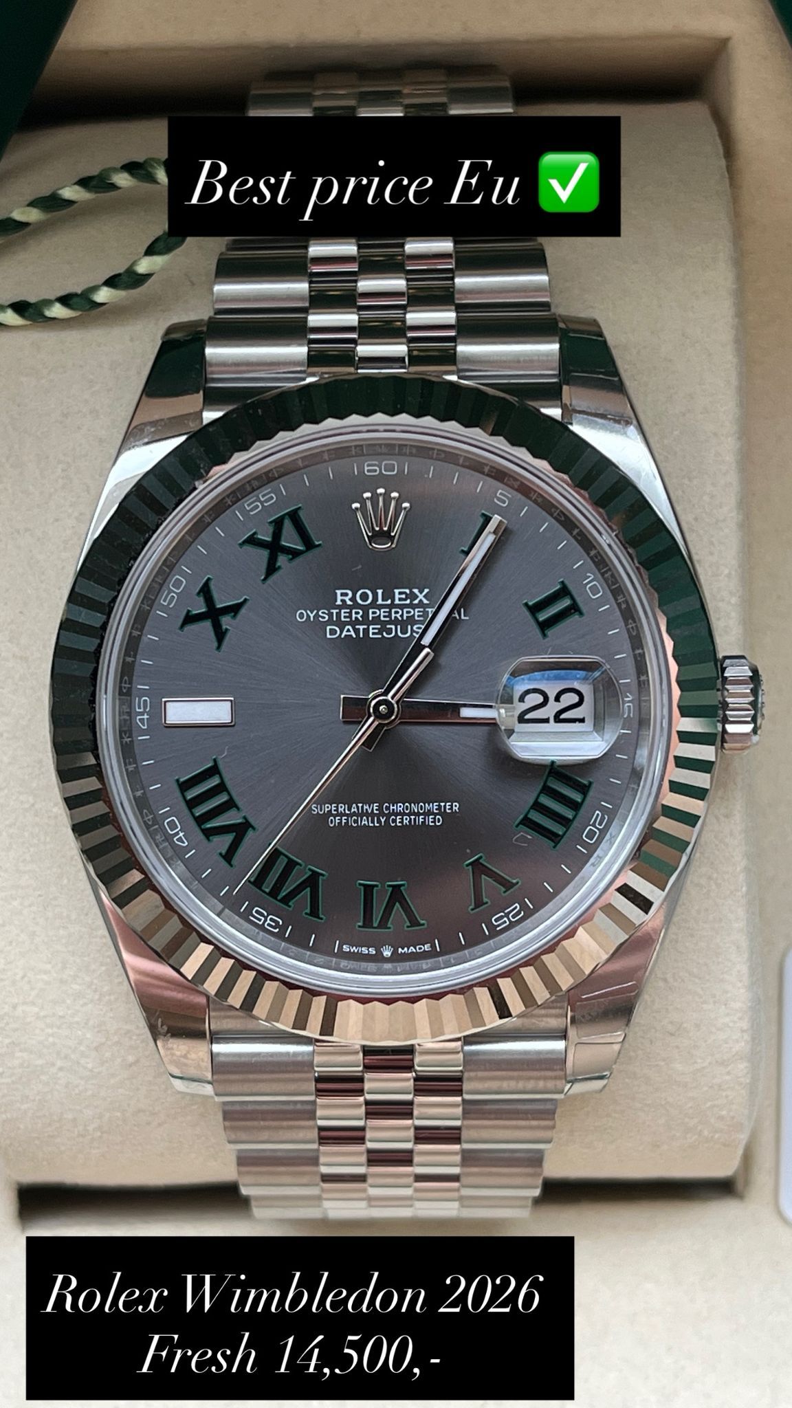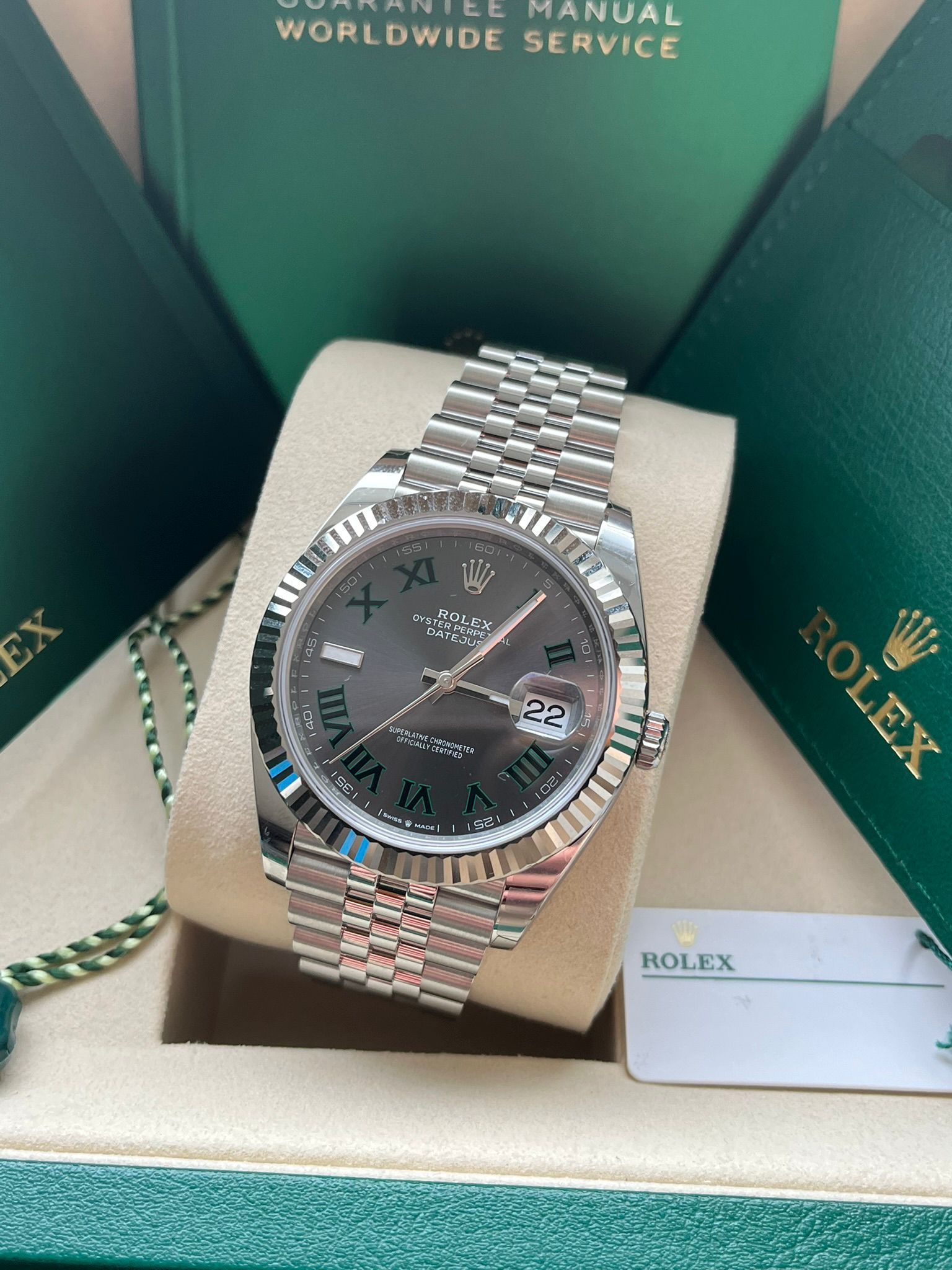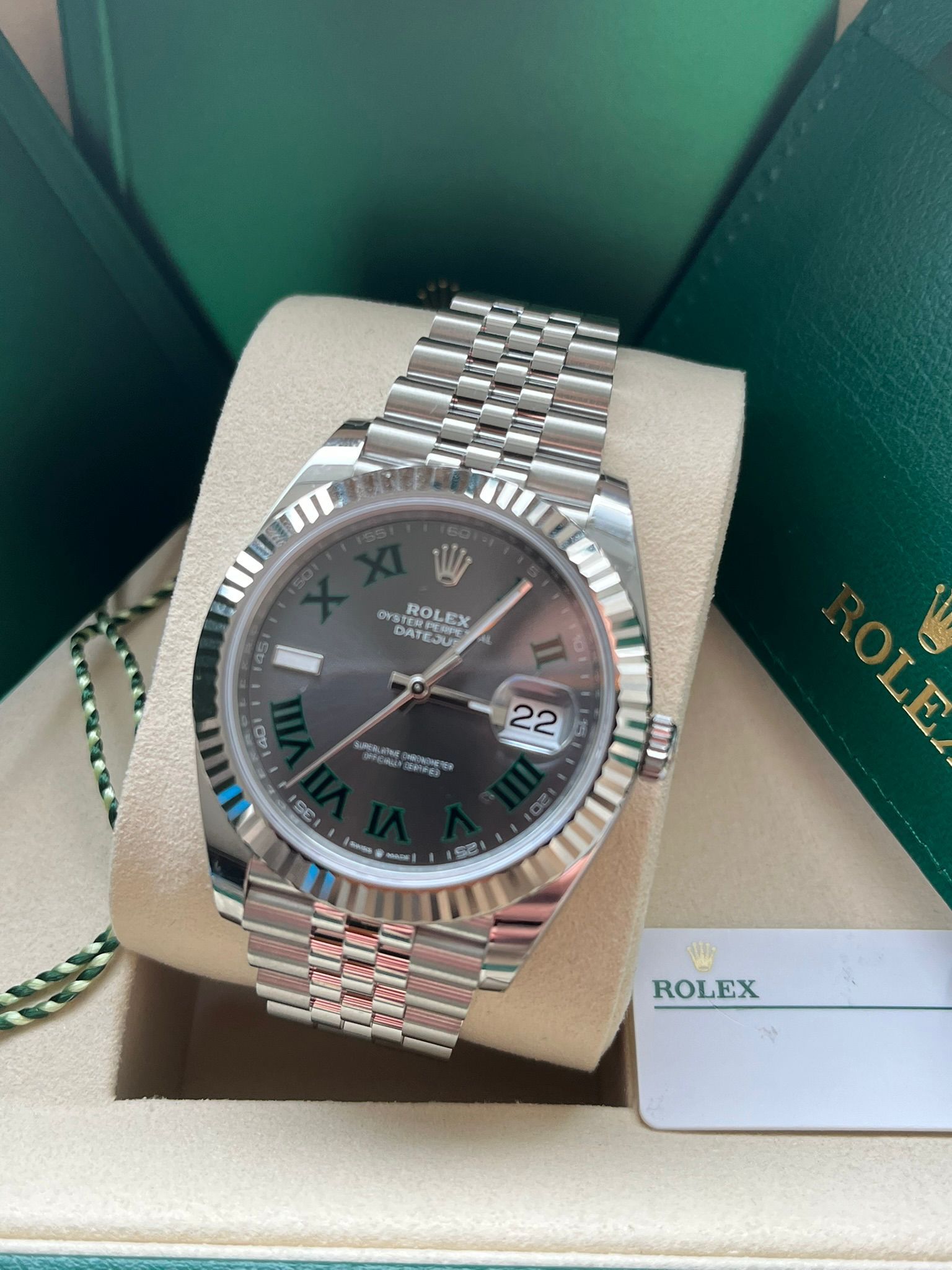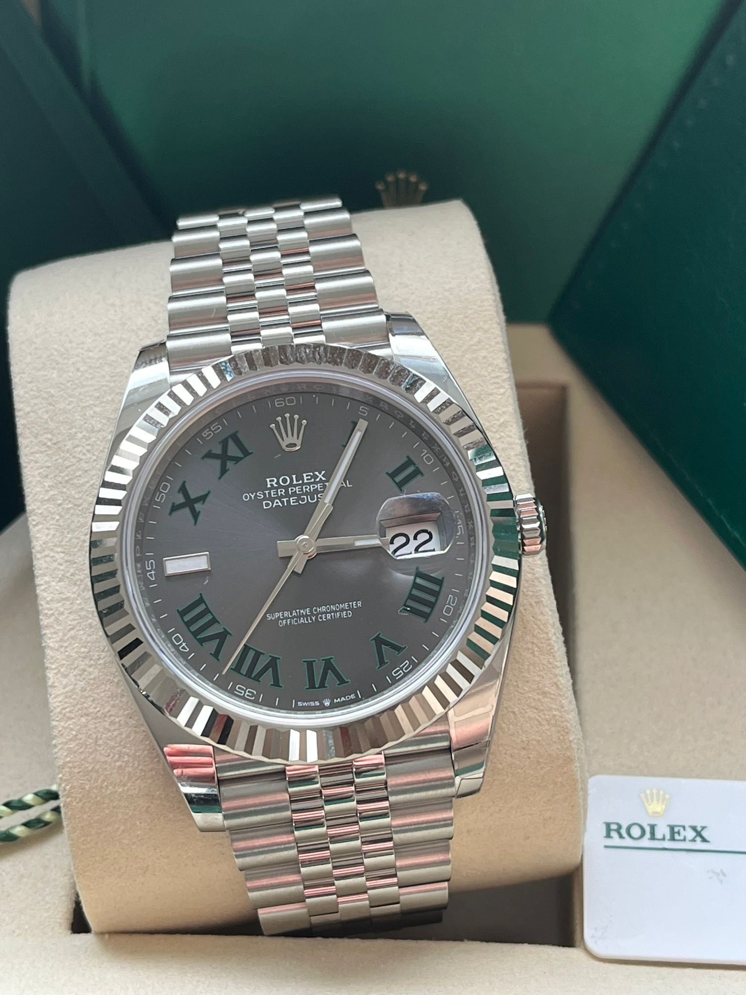 This iconic Rolex Datejust 41 ref. 126334 is presented with the distinctive Wimbledon dial—one of the most recognizable and sought-after configurations within the Datejust collection. The combination of the 41 mm Oyster case in Oystersteel, the elegant white gold fluted bezel, and the unique slate dial with green Roman numerals results in a perfectly balanced timepiece that embodies Rolex’s timeless elegance, precision, and contemporary appeal.This example is offered in new condition and is dated 2026. The watch is powered by the Rolex in-house caliber 3235, celebrated for its exceptional precision, robustness, and approximately 70-hour power reserve, and naturally operates within Rolex Superlative Chronometer specifications.