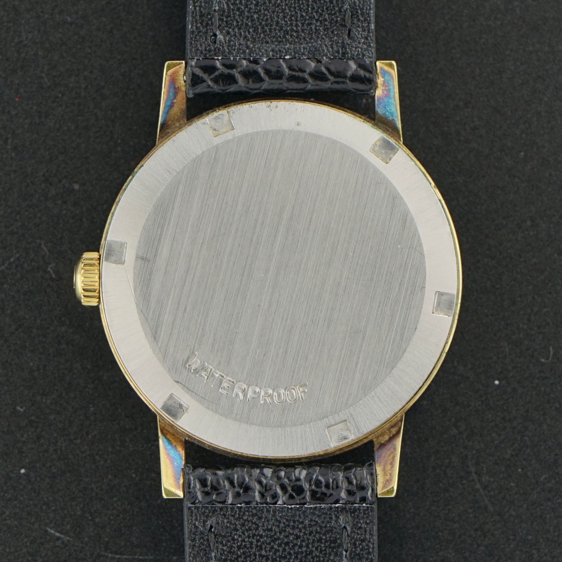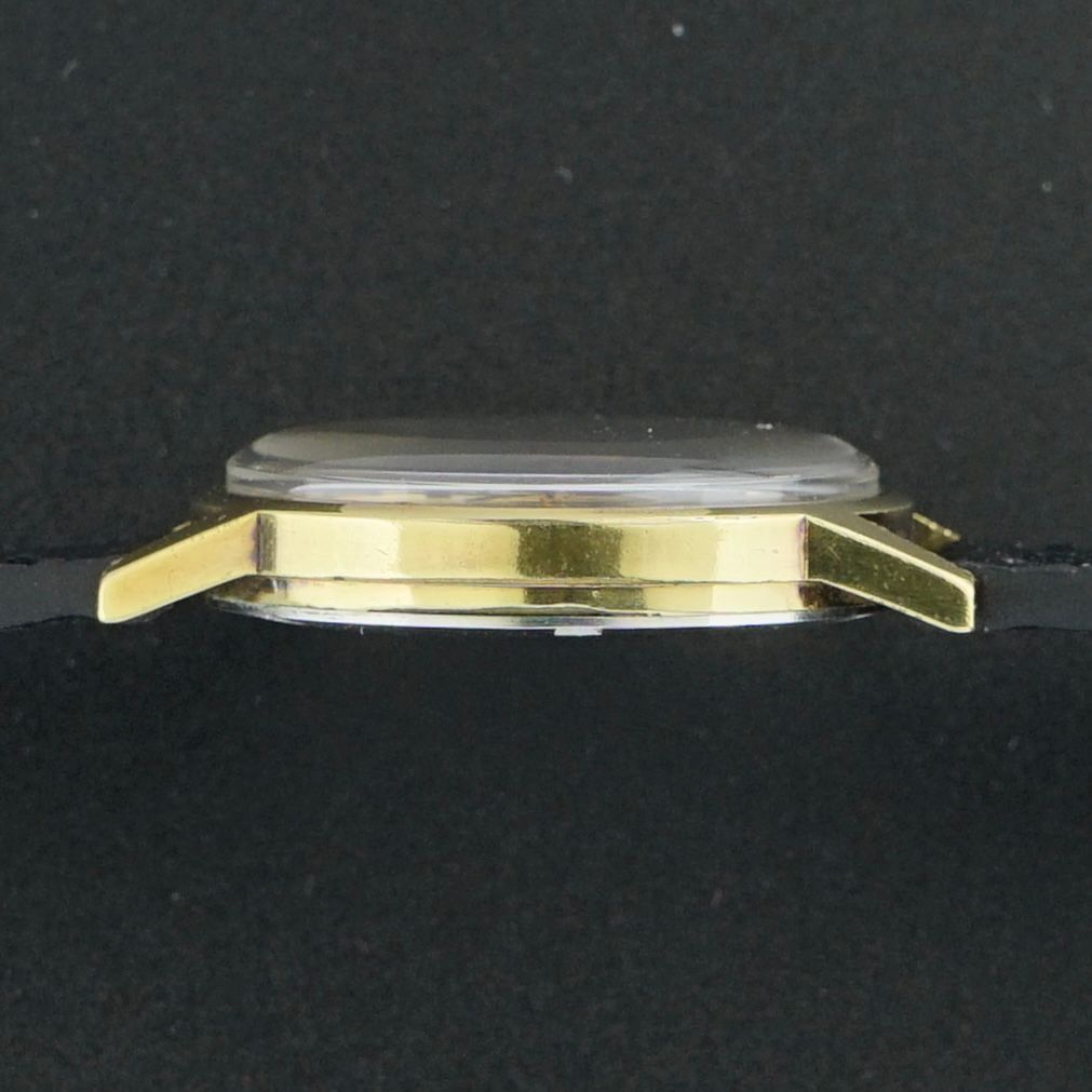 This vintage Omega Genève was produced in 1970. The watch features a beautiful golden sunburst dial with tritium lume plots and gold and black accents, of which the condition is magnificent. The case is gold plated and measures 34.5mm in width, with some light patina visible between the lugs, around the crown, and along the outer edges of the lugs, which can easily be polished off if preferred using a cloth. Inside is a caliber 613 manual wind movement, serviced in March 2026 and now running and functioning well. The watch is paired with a black top grain leather strap with a crocodile motif and a light glossy finish. Overall, this piece is in nice condition and would make a beautiful dress watch or a great daily wearer.Year of production: 1970