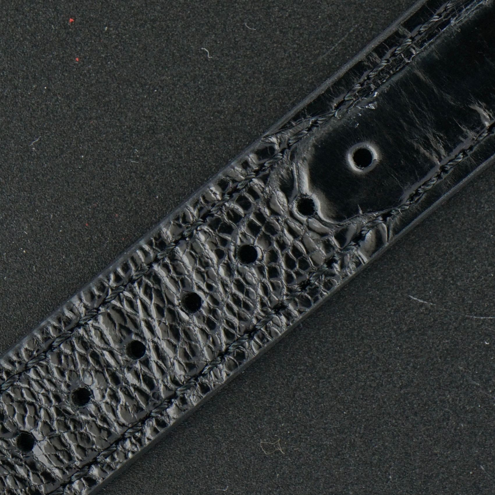 Correa: Una correa de cuero negro de grano superior con un motivo de cocodrilo. (Se adapta a muñecas de 12 a 20 cm)