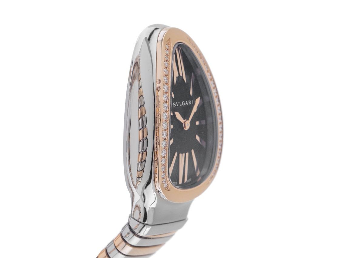 Bulgari Serpenti Tubogas Stahl 18kt Roségold Diamanten Quarz Armband Stahl 18kt RoségoldGehäuse Edelstahl gebogen, gewölbt und poliert, Gehäusemaße ohne Krone (L x B x H) 35 x 23 x 9,1mm. Lünette 18kt Roségold mit Brillanten besetzt. Einfach geschwungenes Armband Edelstahl / 18kt Roségold poliert, Size S. Zifferblatt schwarz, teilguillochiert mit aufgesetzten roségoldenen Indexen und römischen Ziffern sowie roségoldenen Zeigern. Uhrwerk quarzgesteuert. Anzeige von Stunde und Minute über Zeiger aus der Mitte. Saphirglas kratzfest. Krone mit rosafarbenem Rubellit Cabochon. Boden Edelstahl 3-fach verschraubt und graviert. Gewicht der Uhr inklusive Armband 70g, Länge des Armbandes inklusive Gehäuse 145mm. Referenznummer: 102098, ID: ST1160219920625H-17200, Artikelnummer: 10000080859. Original Bulgari Box und Garantie Papiere von Juni 2025, Full Set. Ungetragen. Lieferzeit sofort.