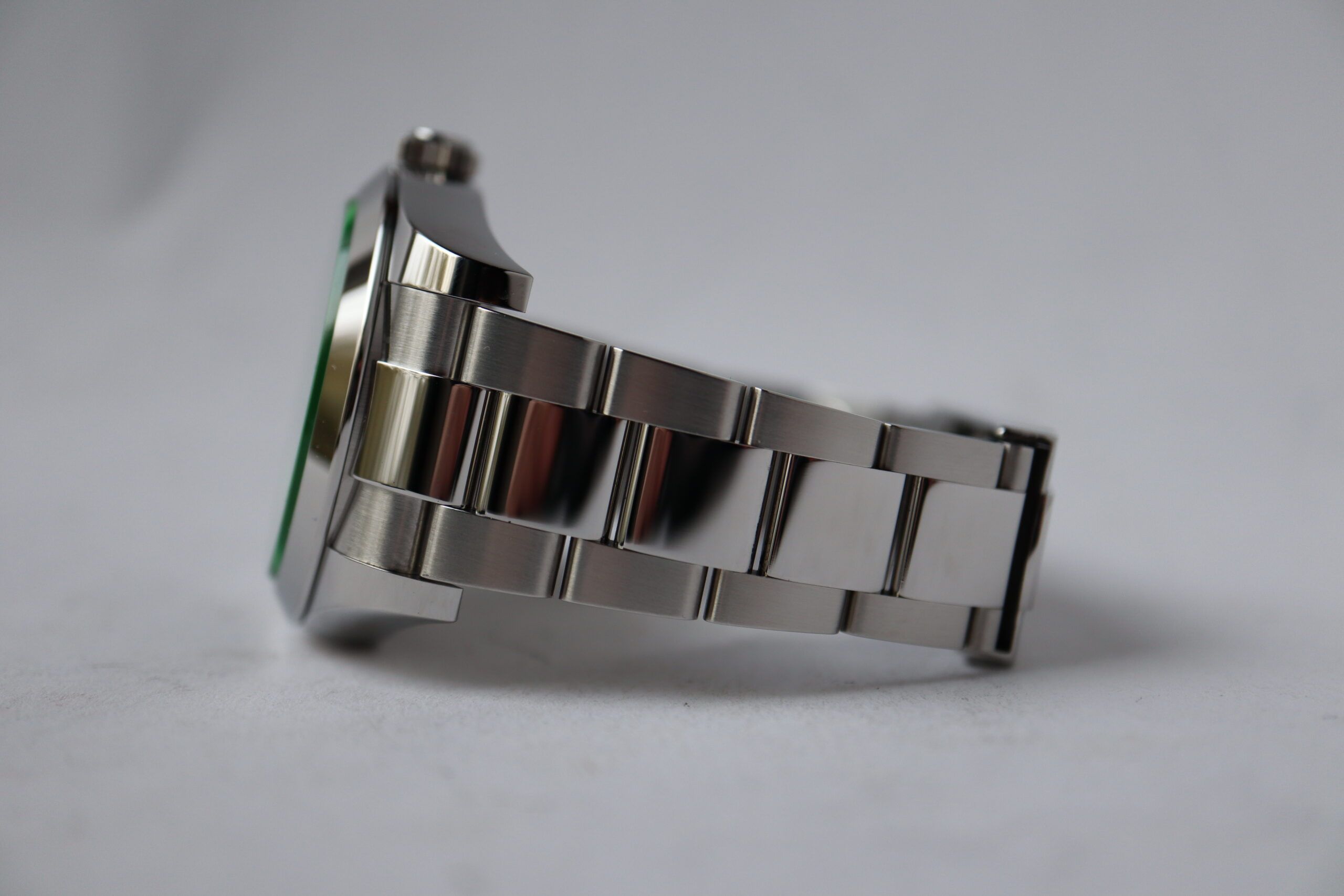 - Signos leves de uso como microarañazos o pequeños arañazos superficiales. La caja, el bisel y el brazalete conservan sus aristas definidas y su forma general. Puede haber sido pulido profesionalmente sin afectar a las líneas originales. Totalmente funcional mecánicamente.