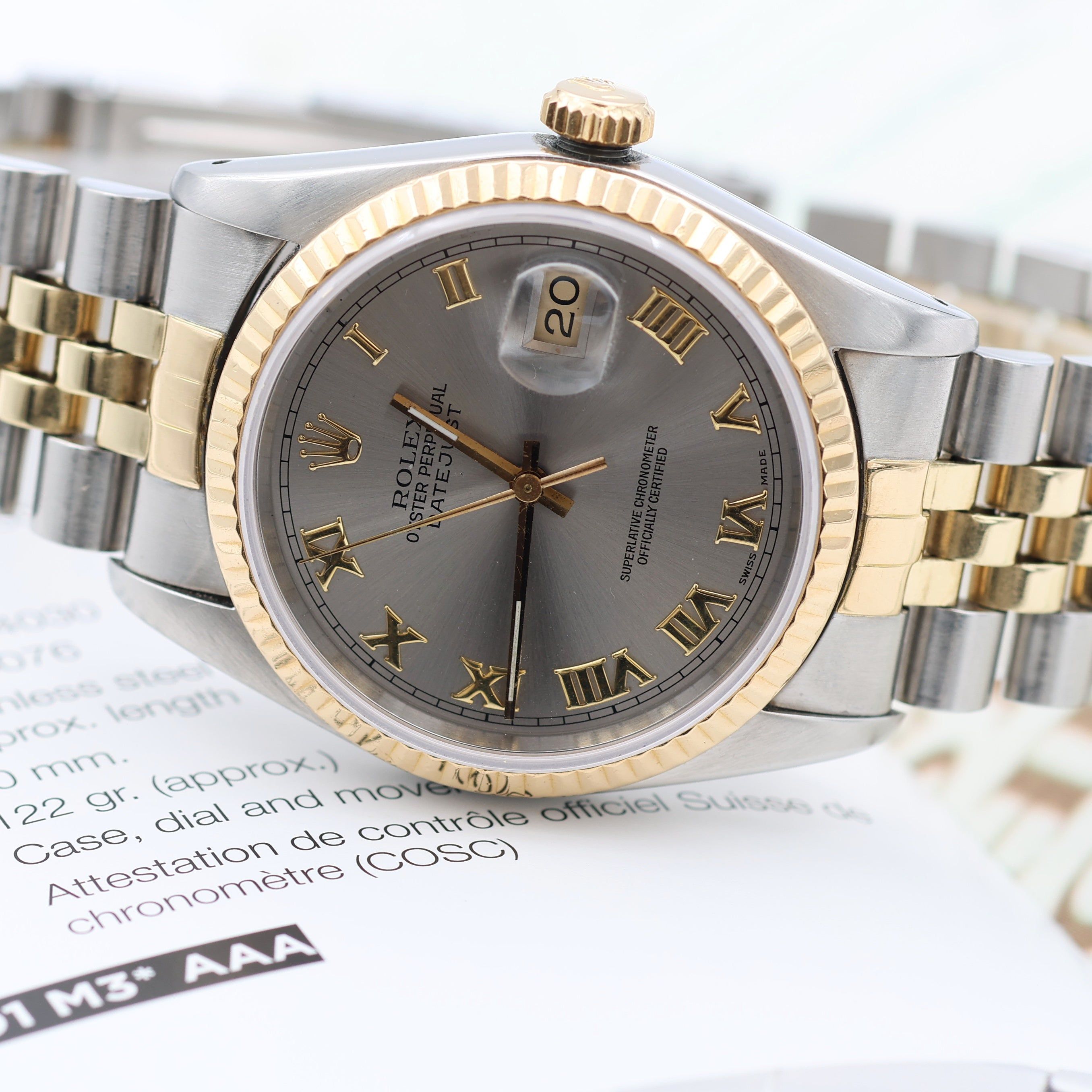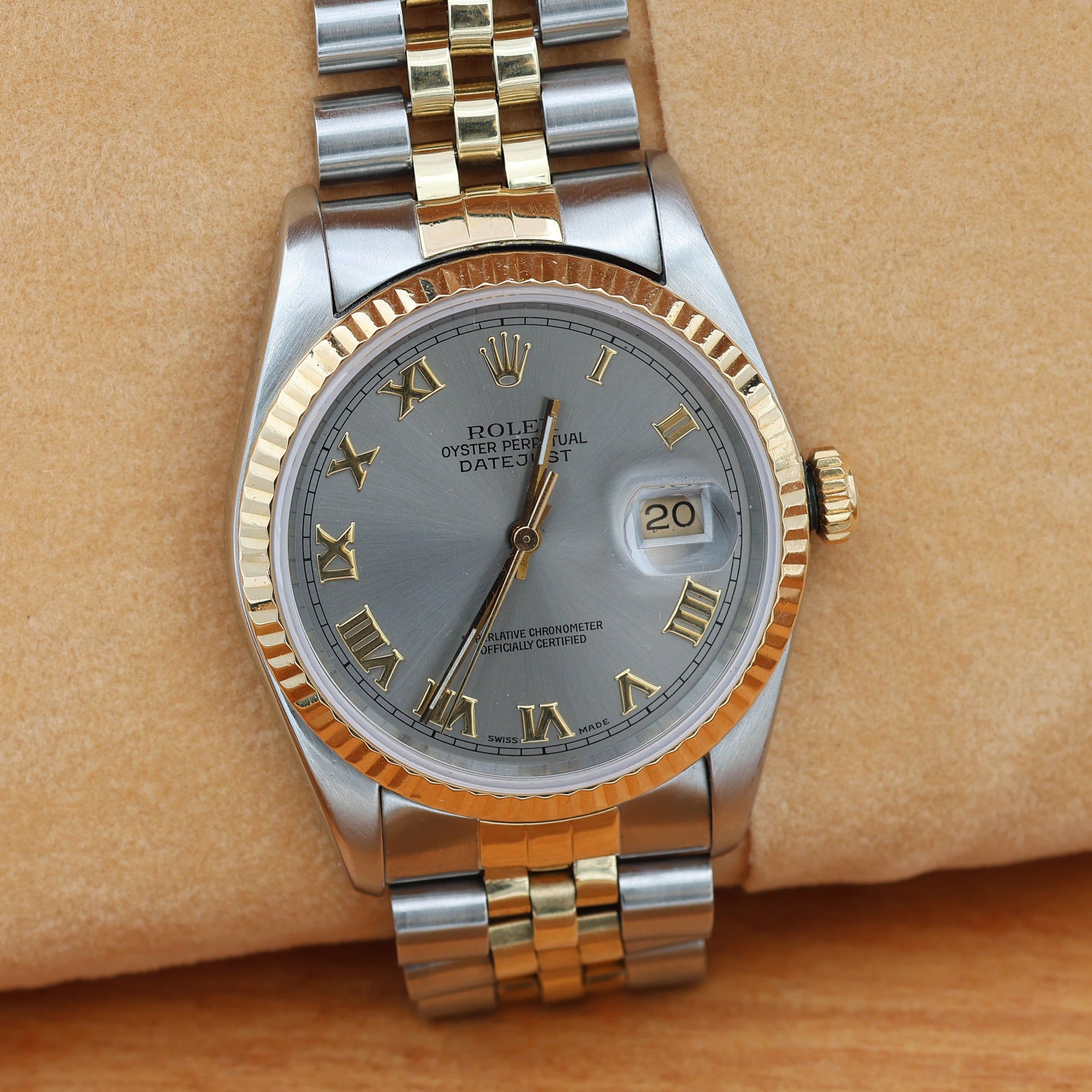 For sale at Debonar Watches: pre-owned Rolex Datejust 16233 in steel and 18k yellow gold, full set.Fluted yellow gold bezel on a Jubilee bracelet, with a beautiful grey dial with roman numbers.The Rolex Datejust reference 16233 first made its appearance in 1988, boasting notable upgrades over its predecessor.The ref. 16233 was the direct replacement for the ref. 16013, which is sometimes known as the American Psycho Rolex.This reference maintained the classic 36mm case diameter from years past, which while a bit on the modest side by today’s standards still wears very well on a range of wrist sizes.Even though the series came to an end in the mid 2000’s, the Datejust ref. 16233 is a thoroughly modern version of the watch, and one with the classic two-tone Rolex look. BRAND ROLEX MODEL DATEJUST REFERENCE 16233 CASE MATERIAL 18K GOLD AND STEEL MOVEMENT AUTOMATIC DIMENSION 36 MM DIAL GREY ROMAN BEZEL 18K GOLD CRYSTAL SAPPHIRE BRACELET TYPE JUBILEE BRACELET MATERIAL 18K GOLD AND STEEL BRACELET LENGHT 16,5 CM ORIGINAL BOX YES ORIGINAL PAPERS YES YEAR APPROX. THE '90s CONDITION VERY GOOD