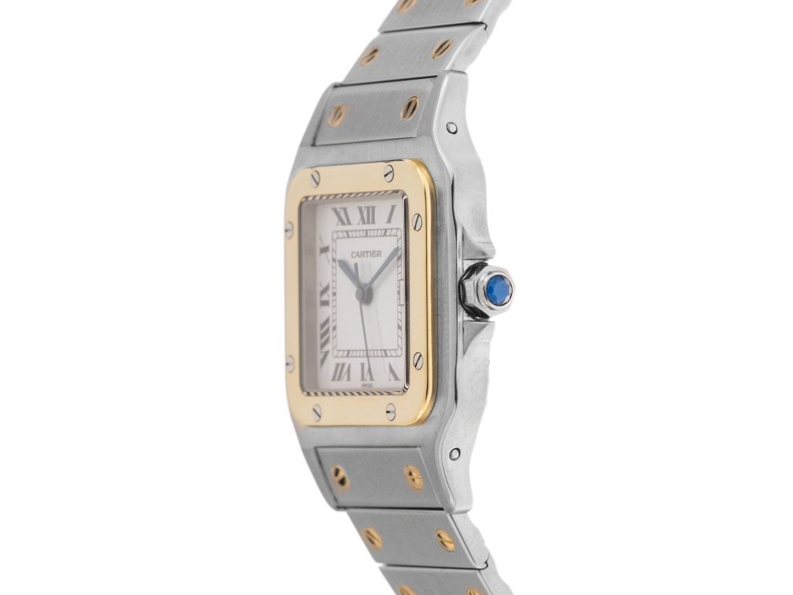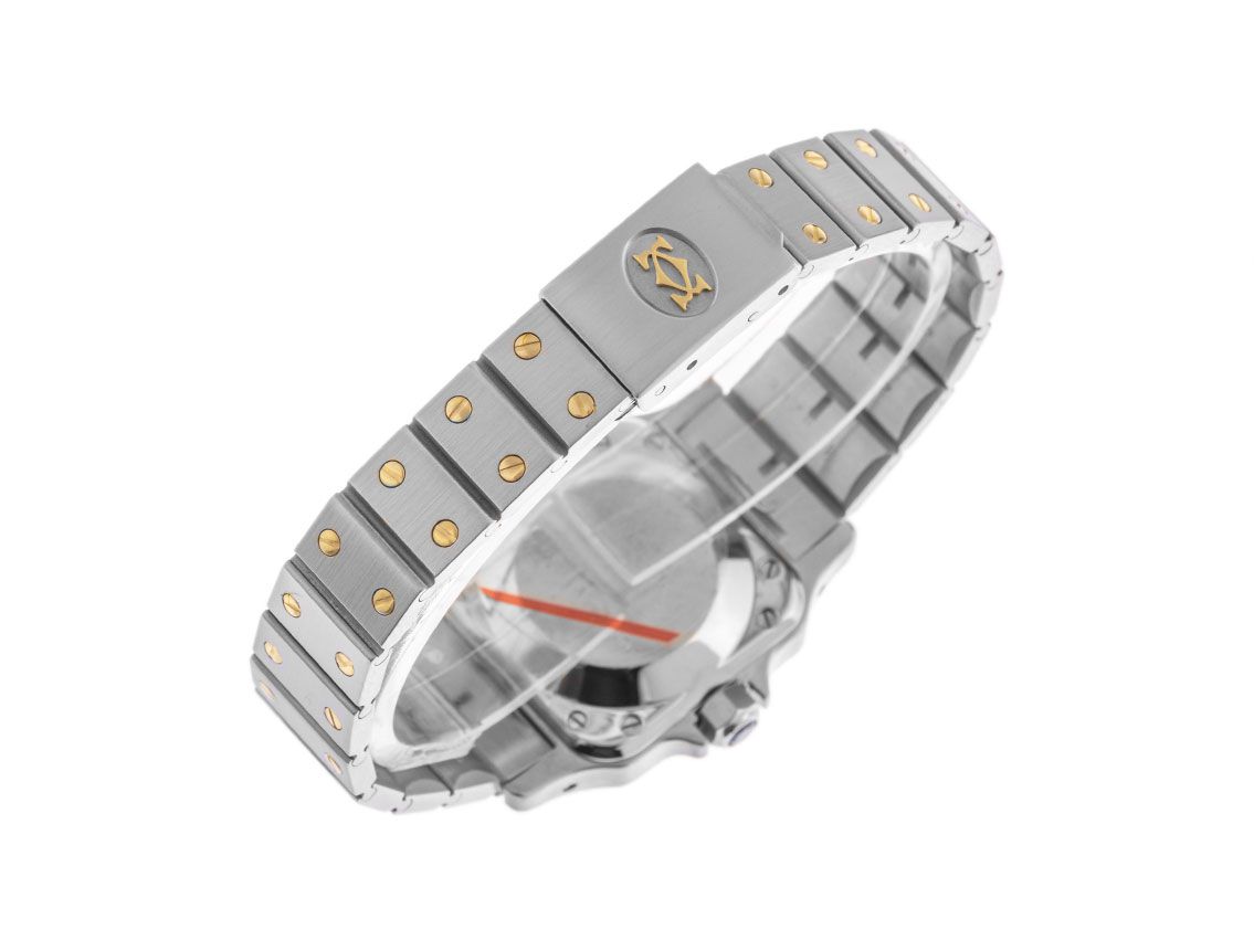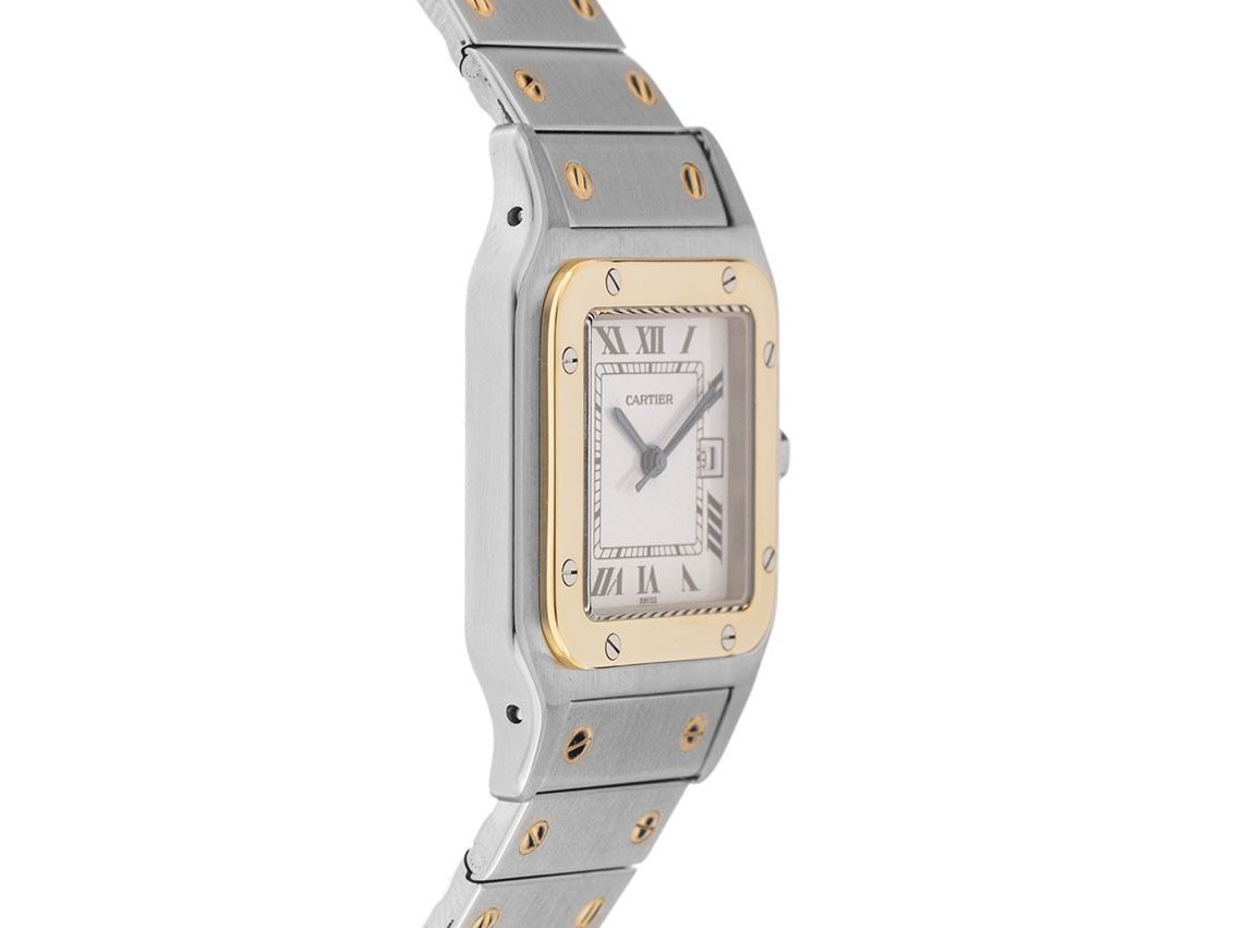 Cartier Santos Galbee Lady PM kleines Modell Stahl Gelbgold Automatik Armband Stahl GelbgoldGehäuse Edelstahl satiniert, rechteckig, Gehäusemaße ohne Krone (L x B x H) 35 x 24 x 5,8mm. Lünette 18kt Gelbgold 8-fach verschraubt und poliert. Armband Edelstahl satiniert mit Gelbgoldenen Schrauben verziehrt, Faltschließe Edelstahl mit Hersteller-Logo. Zifferblatt cremeweiß mit schwarzen römischen Ziffern und gebläuten Zeigern. Uhrwerk Automatik, Kaliber Cartier. Anzeige von Stunde, Minute und Sekunde über Zeiger aus der Mitte. Saphirglas kratzfest. Krone mit blauem Spinell und Flankenschutz. Boden Edelstahl 8-fach verschraubt und graviert. Gewicht der Uhr inklusive Armband 58g, Länge des Armbandes inklusive Gehäuse 155mm. Referenznummer: 0902, Gehäusenummer: 56XXX, Baujahr: 1994, ID: P278154000326HW-6200, Artikelnummer: 10000085356. Mit Gangkontrolle und kompletter äußerlicher Aufarbeitung von März 2026. Original Cartier Box sowie Beschreibung und Watchregister Auszug von März 2026, The Watch Register Zertifikat / ohne Eintrag (Internationale Datenbank für verlorene oder gestohlene Uhren). Sehr seltenes Sammlerstück. Sehr guter Zustand. Lieferzeit sofort.