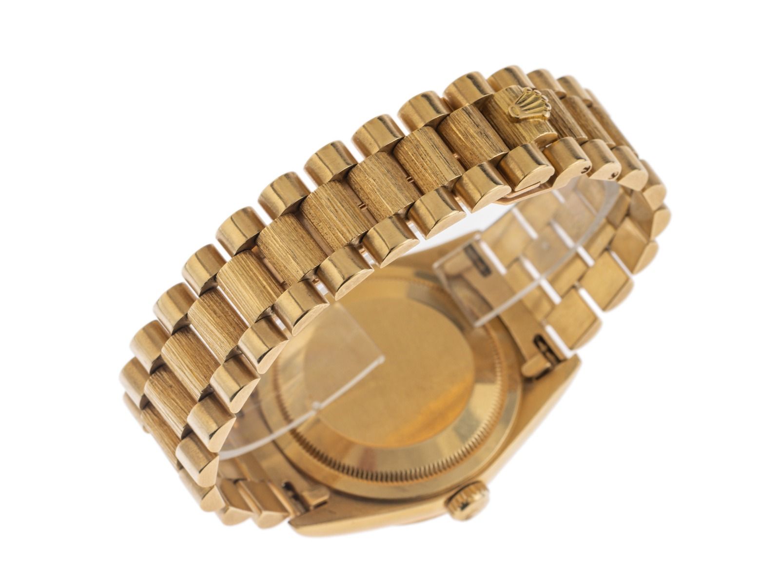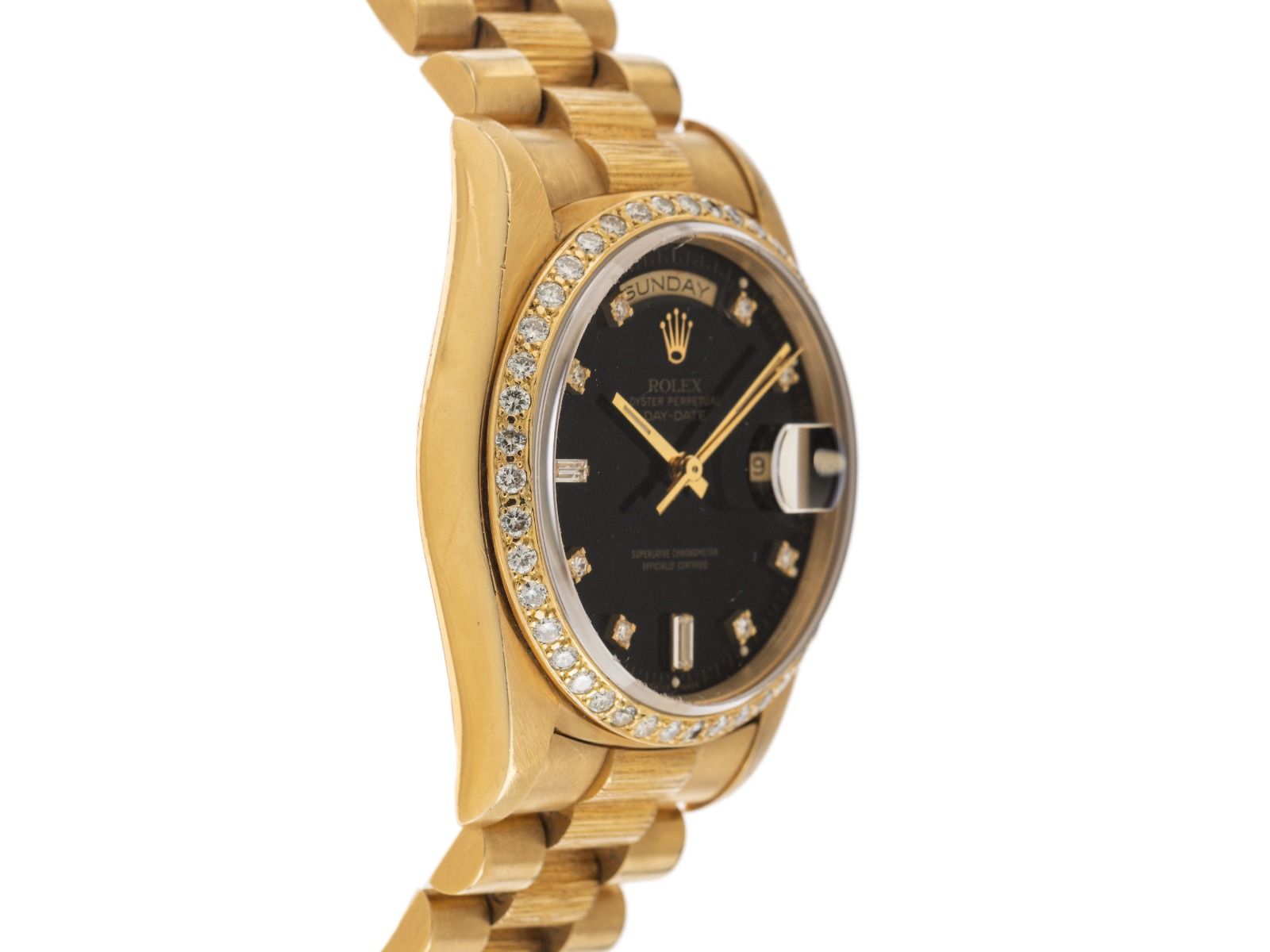 Rolex Day Date 18kt Oro Amarillo Diamantes Grabado de Corteza Automático Pulsera Presidente 18kt Oro Amarillo
