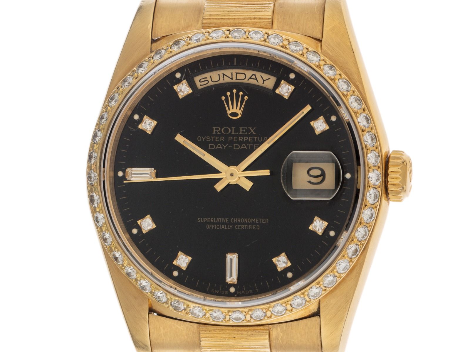 Caja de 18kt Oro Amarillo pulido y satinado, diámetro de la caja sin corona 36mm, altura de la caja 11,8mm. Bisel de 18kt Oro Amarillo engastado con diamantes. Pulsera Presidente de 18kt Oro Amarillo pulido y satinado con grabado de corteza, cierre desplegable oculto Crownclasp de 18kt Oro Amarillo con logo del fabricante. Esfera negra con índices de diamante engastados en oro amarillo y manecillas en oro amarillo, inscripción "T swiss made T" a las 6 en punto. Movimiento automático, cronómetro, calibre de manufactura Rolex 3155 con 31 piedras preciosas. Indicación de hora, minuto y segundo a través de manecillas centrales con parada de segundero para ajuste preciso de la hora, indicación de fecha con ajuste rápido bajo cristal de lupa a las 3 en punto, indicación del día de la semana en inglés con ajuste rápido a las 12 en punto, Doble Rápido. Cristal de zafiro resistente a los arañazos. Corona atornillada con logo del fabricante. Fondo de 18kt Oro Amarillo atornillado. Peso del reloj incluyendo la pulsera 134g, longitud de la pulsera incluyendo la caja 160mm. Número de referencia: 18248, número de caja: X269XXX, año de fabricación: 1991, ID: P2786368000326H-28500, número de artículo: 10000085367. Con control de marcha y completa restauración exterior de marzo de 2026. Caja original de Rolex con caja exterior así como descripción, folleto de traducción, estuche de cuero, calendario de Rolex de 1990 / 1991, sello de cronómetro de Rolex, extracto de día y registro de reloj de marzo de 2026, certificado de The Watch Register / sin entrada (base de datos internacional para relojes perdidos o robados). Super oferta, inversión con potencial de revalorización, pieza de colección muy rara, de primera mano. Muy buen estado. Tiempo de entrega inmediato.