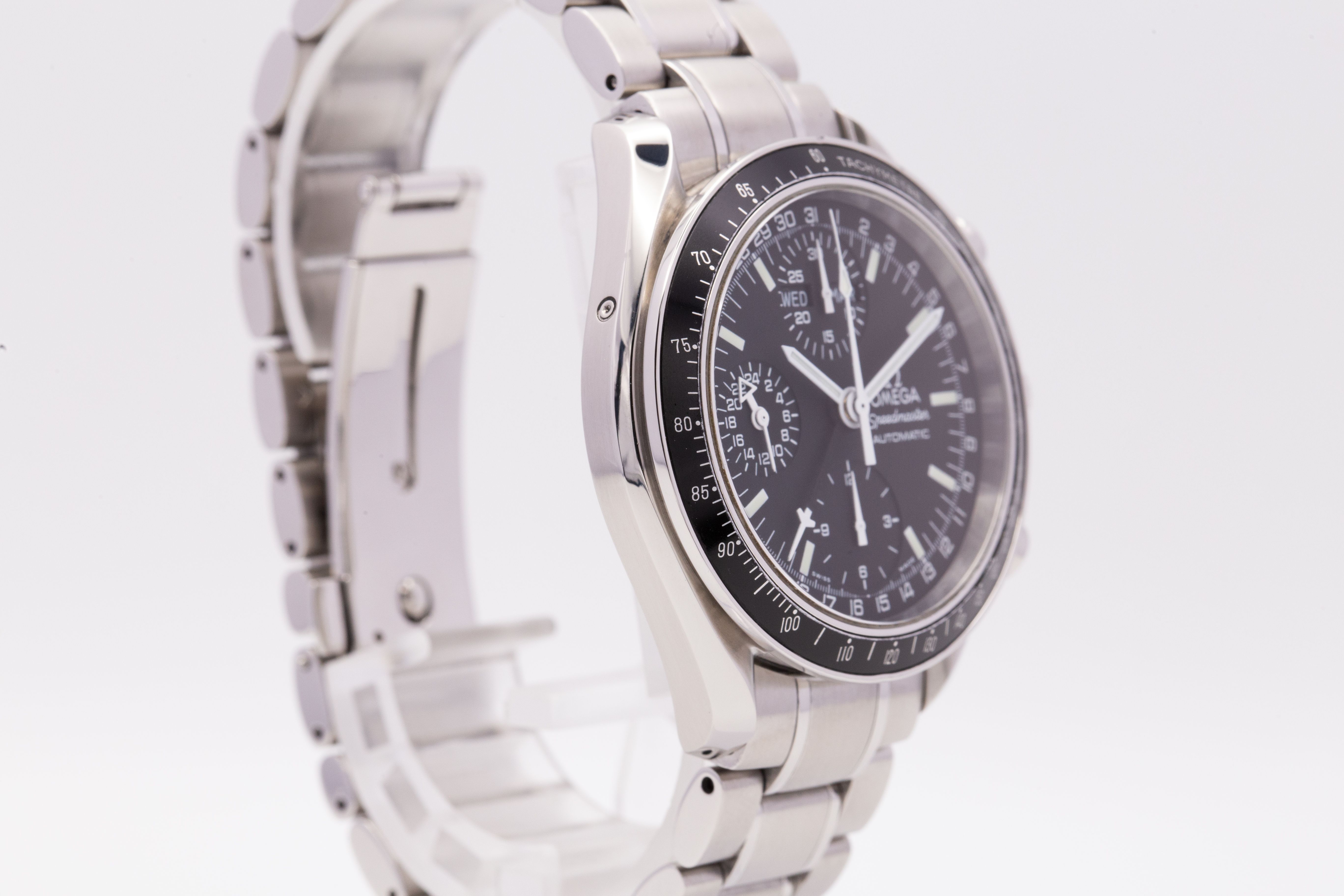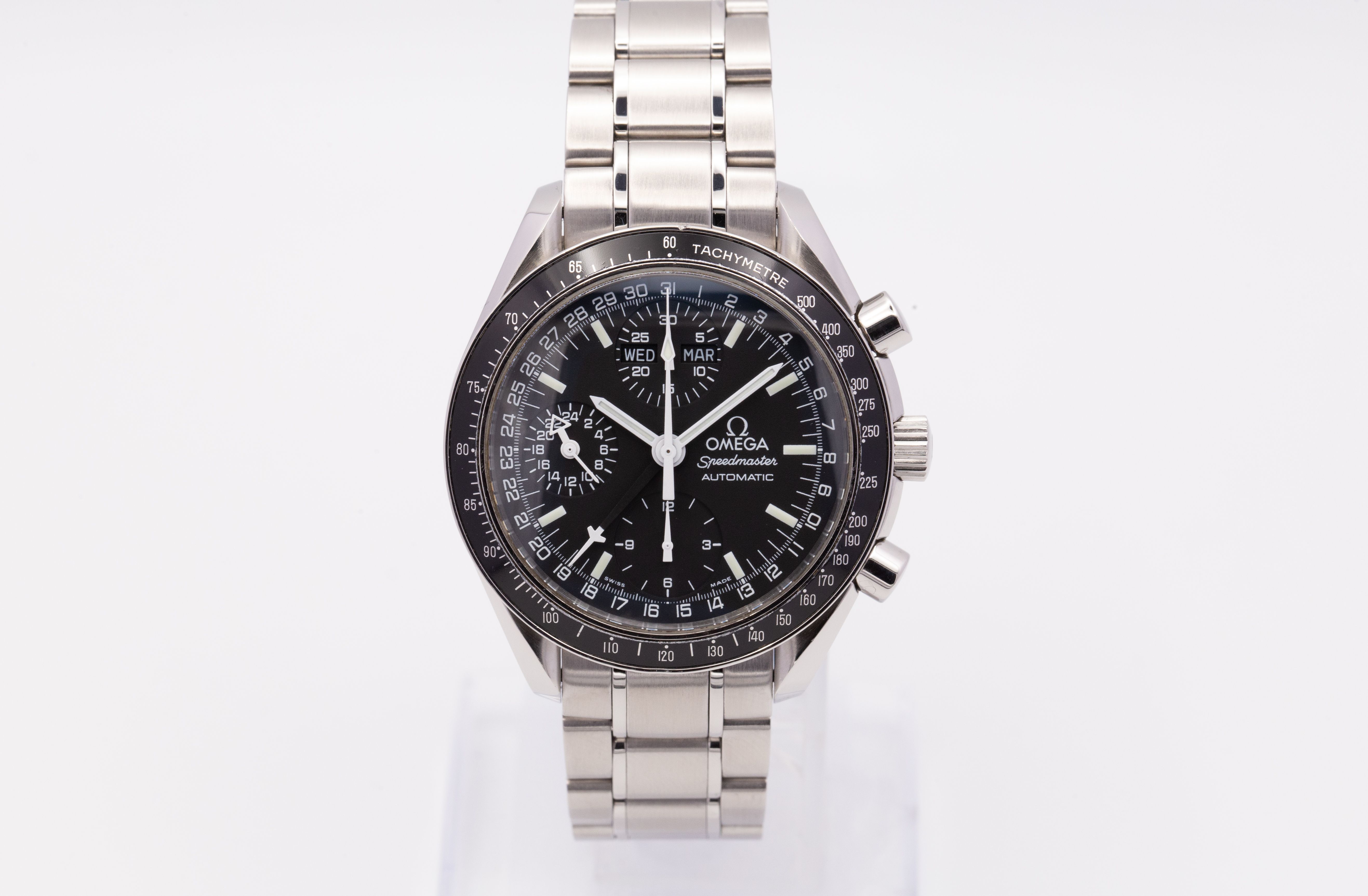 Die Speedmaster Day-Date von Omega kombiniert das klassische Speedmaster-Design mit einer Vielzahl praktischer Komplikationen. Neben der Chronographenfunktion bietet sie Wochentags-, Monats- und Datumsanzeige sowie eine 24-Stunden-Anzeige, was sie zu einer der vielseitigsten Varianten innerhalb der Speedmaster-Linie macht.