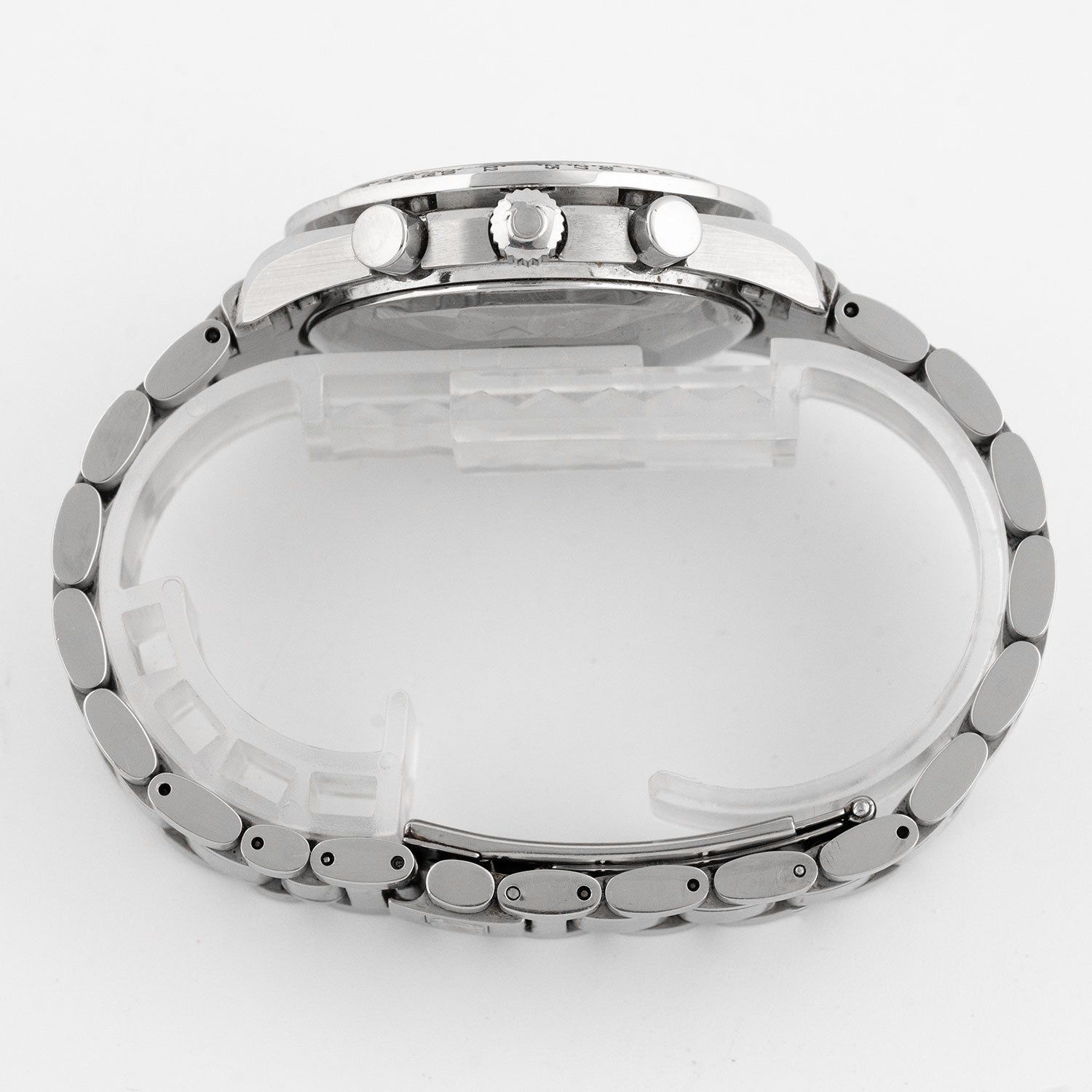 - Signos leves de uso como microarañazos o pequeños arañazos superficiales. La caja, el bisel y el brazalete conservan sus aristas definidas y su forma general. Puede haber sido pulido profesionalmente sin afectar a las líneas originales. Totalmente funcional mecánicamente.