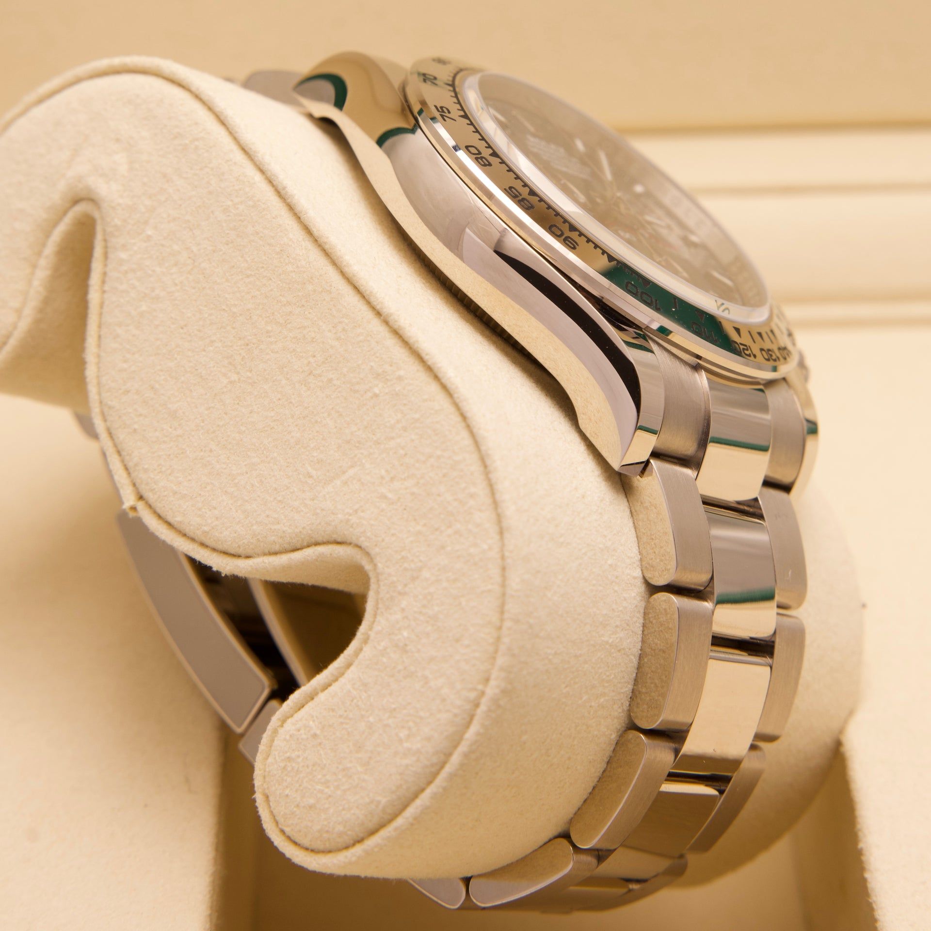 - Signos leves de uso como microarañazos o pequeños arañazos superficiales. La caja, el bisel y el brazalete conservan sus aristas definidas y su forma general. Puede haber sido pulido profesionalmente sin afectar a las líneas originales. Totalmente funcional mecánicamente.