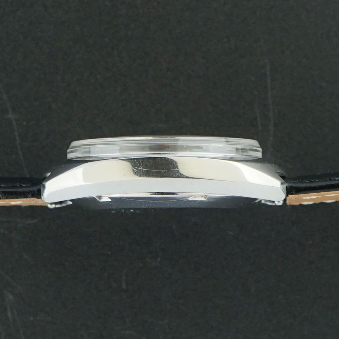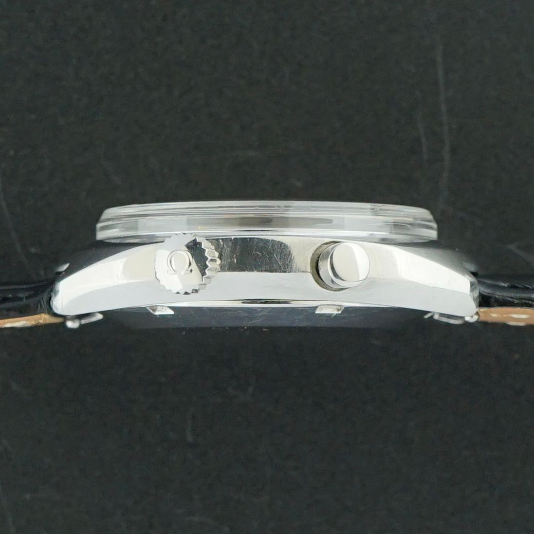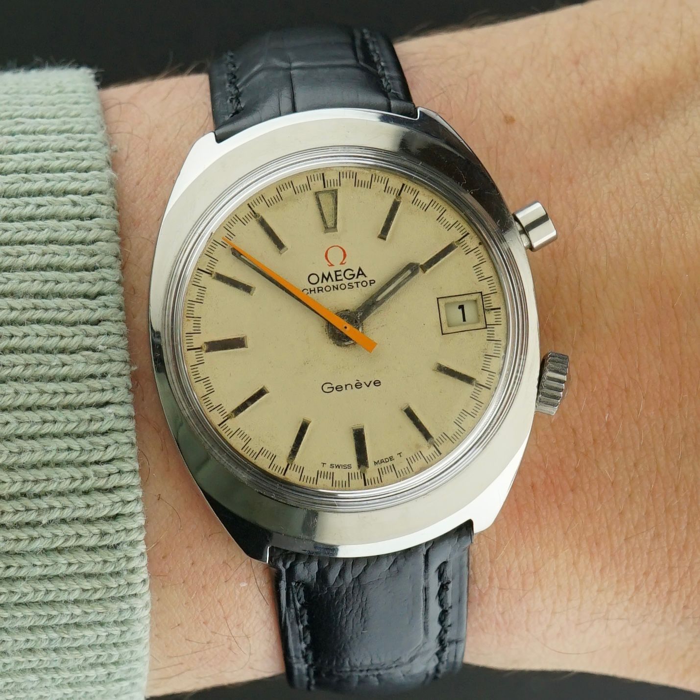 A Vintage Omega Genève Chronostop from 1969 with a unique dial that has aged from white to a full off-white, cream tone over more than 50 years. This configuration features the red Omega logo, orange beak seconds hand, pusher at 2 o’clock, crown at 4 o’clock, and a date window at 3 o’clock. The 35mm stainless steel case remains in good overall condition.Inside is the caliber 920 manual-wind movement, serviced in April 2026 and running excellently. It comes on a black leather strap with crocodile motif, making it a strong and characterful vintage piece.