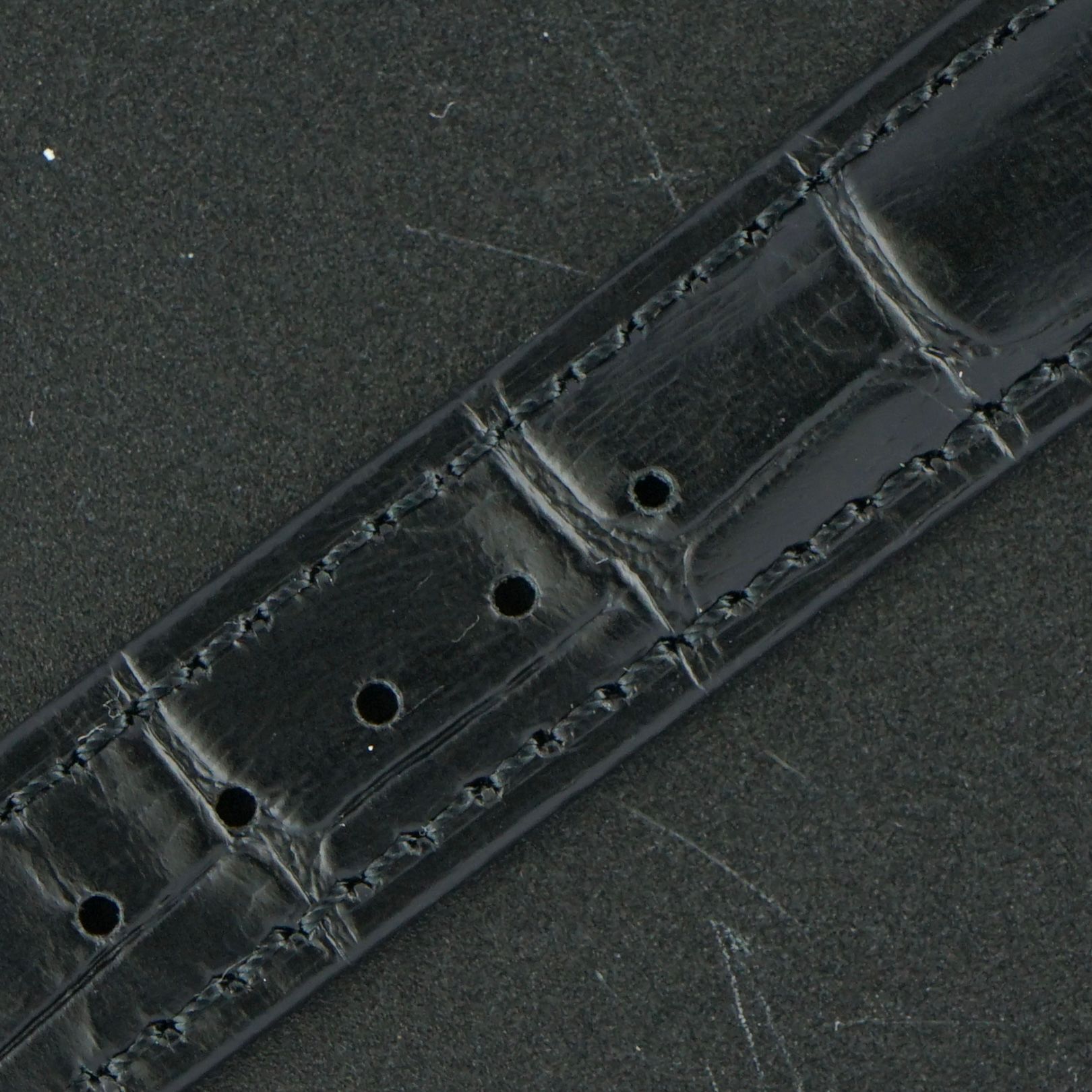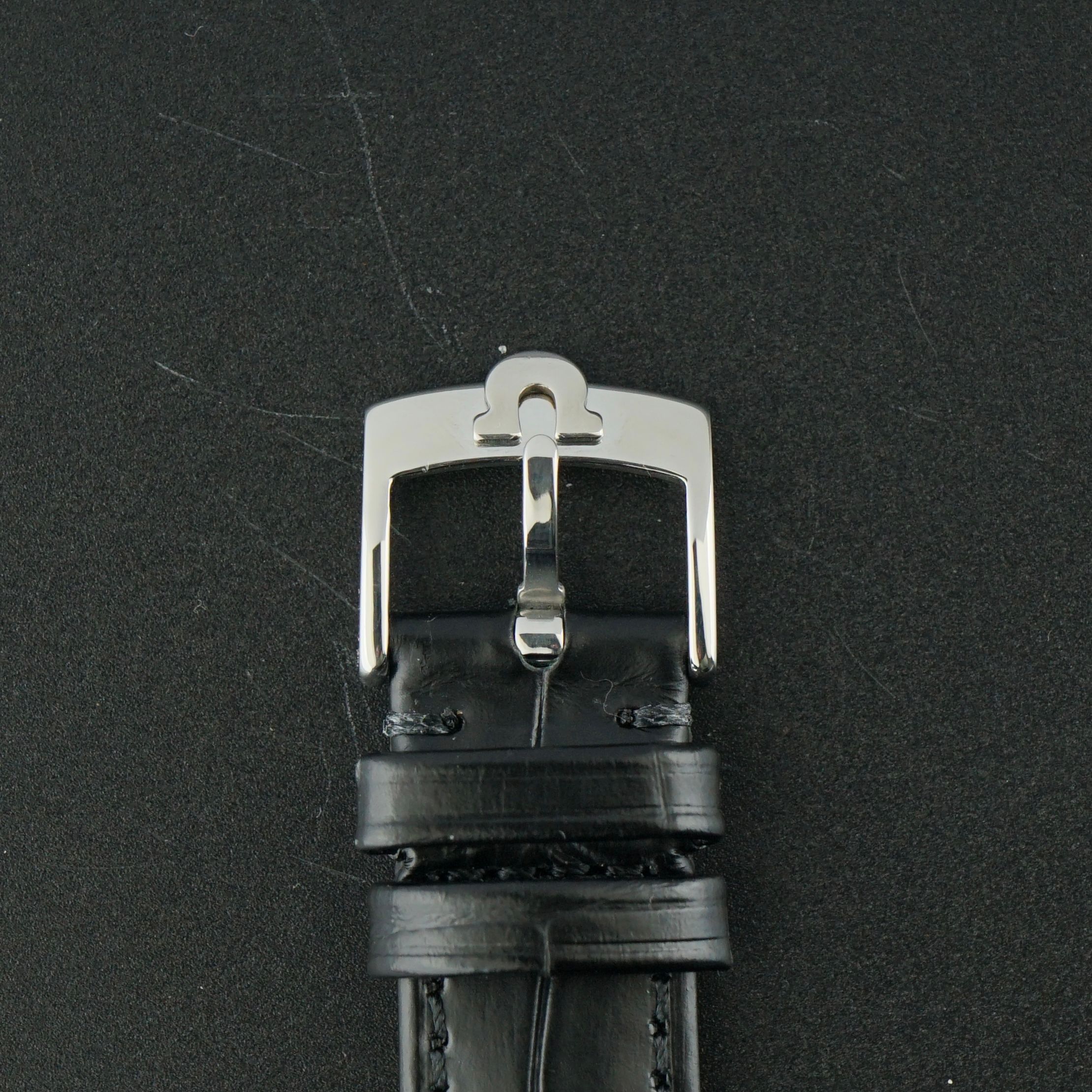 Strap: A black leather strap with a crocodile motif. (Fits a 13 to 21cm wrist)