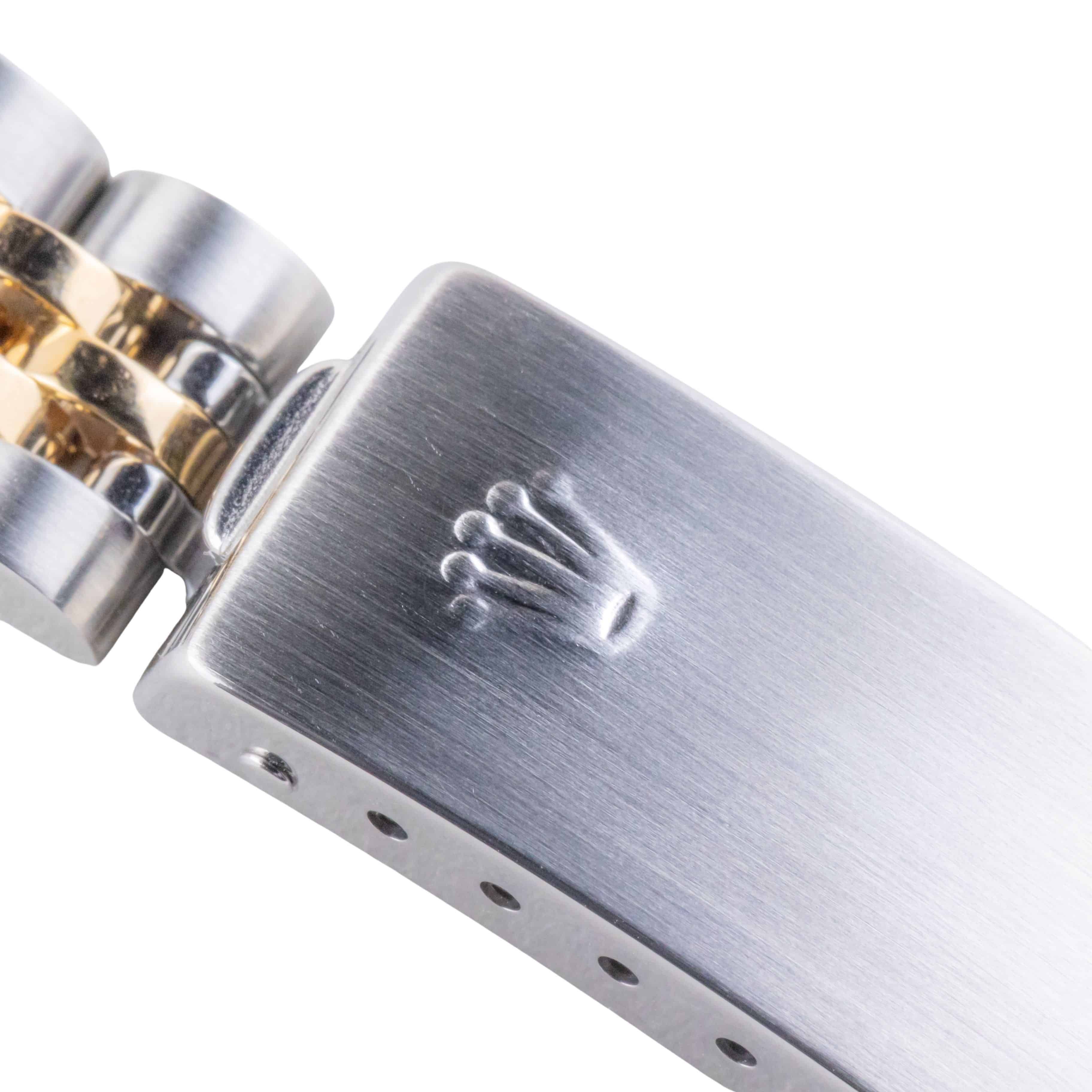 Rolex Oyster Perpetual Lady-Datejust Referencia 69173 de 1990 con set completo. La Lady-Datejust 69173 mide 26 mm y cuenta con una caja de oro y acero inoxidable, un brazalete bicolor de aniversario y un bisel estriado de oro de 14k. Esta Lady-Datejust 69173 tiene un movimiento automático calibre 2135 con función de fecha rápida, cristal de zafiro resistente a los arañazos y una esfera color champán con índices de diamante.