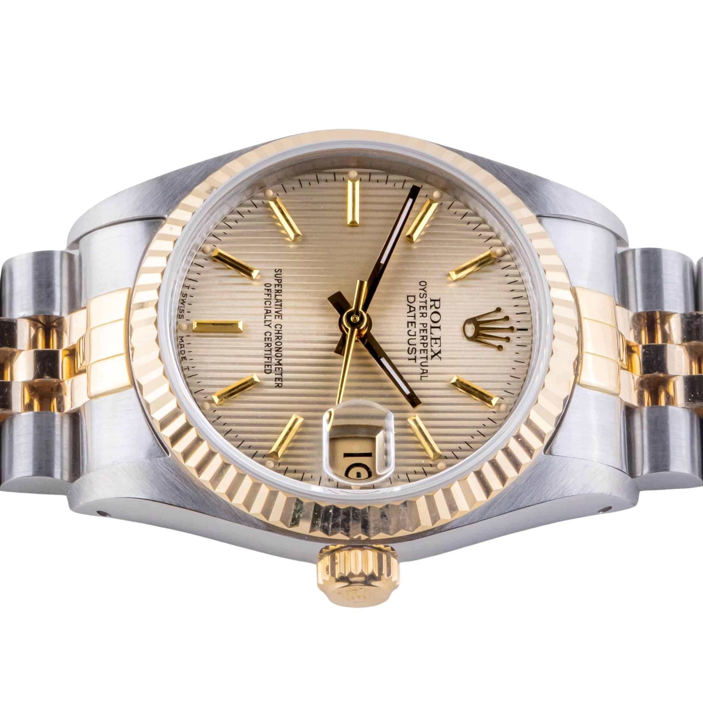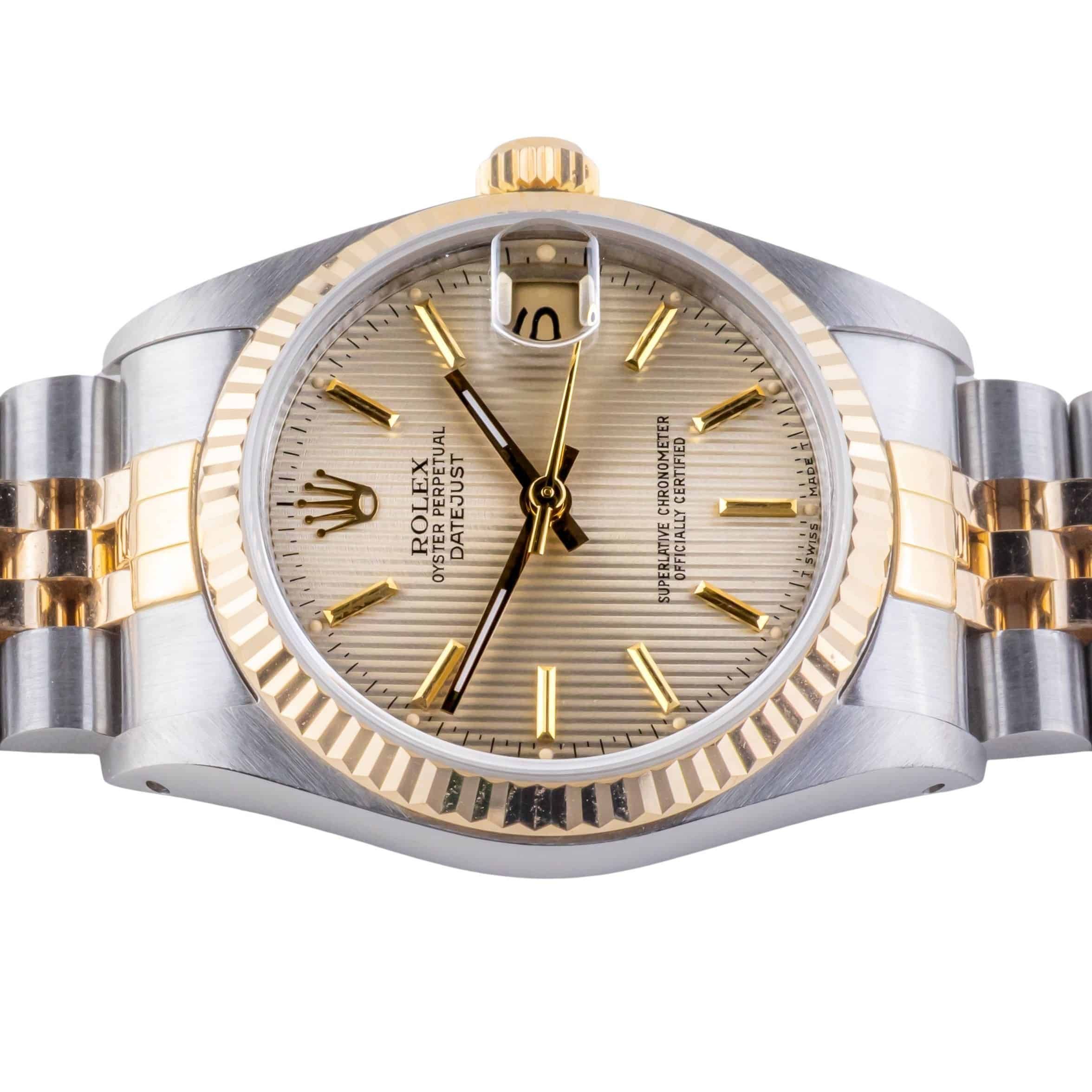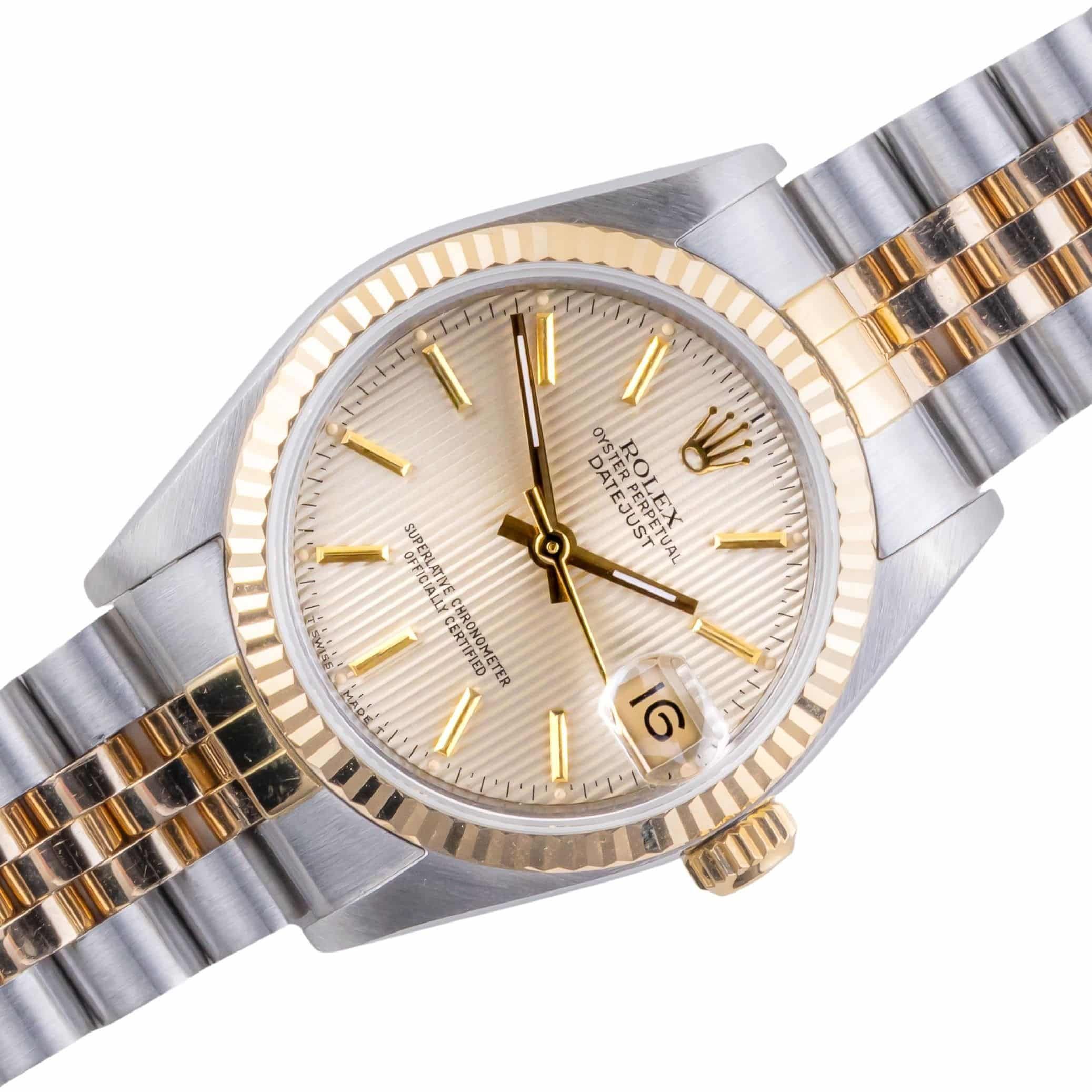 Rolex Oyster Perpetual Datejust Mid-Size referencia 68273 de 1991, incluyendo juego completo. El Datejust 68273 tiene una caja de 31 mm de oro/acero inoxidable, una pulsera Jubilee de oro/acero inoxidable y un bisel estriado de oro de 18k. Este Datejust 68273 cuenta con un movimiento automático calibre 3135 con función de fecha rápida, un cristal de zafiro resistente a los arañazos y una esfera de tapicería color champán con manecillas de tritio.
