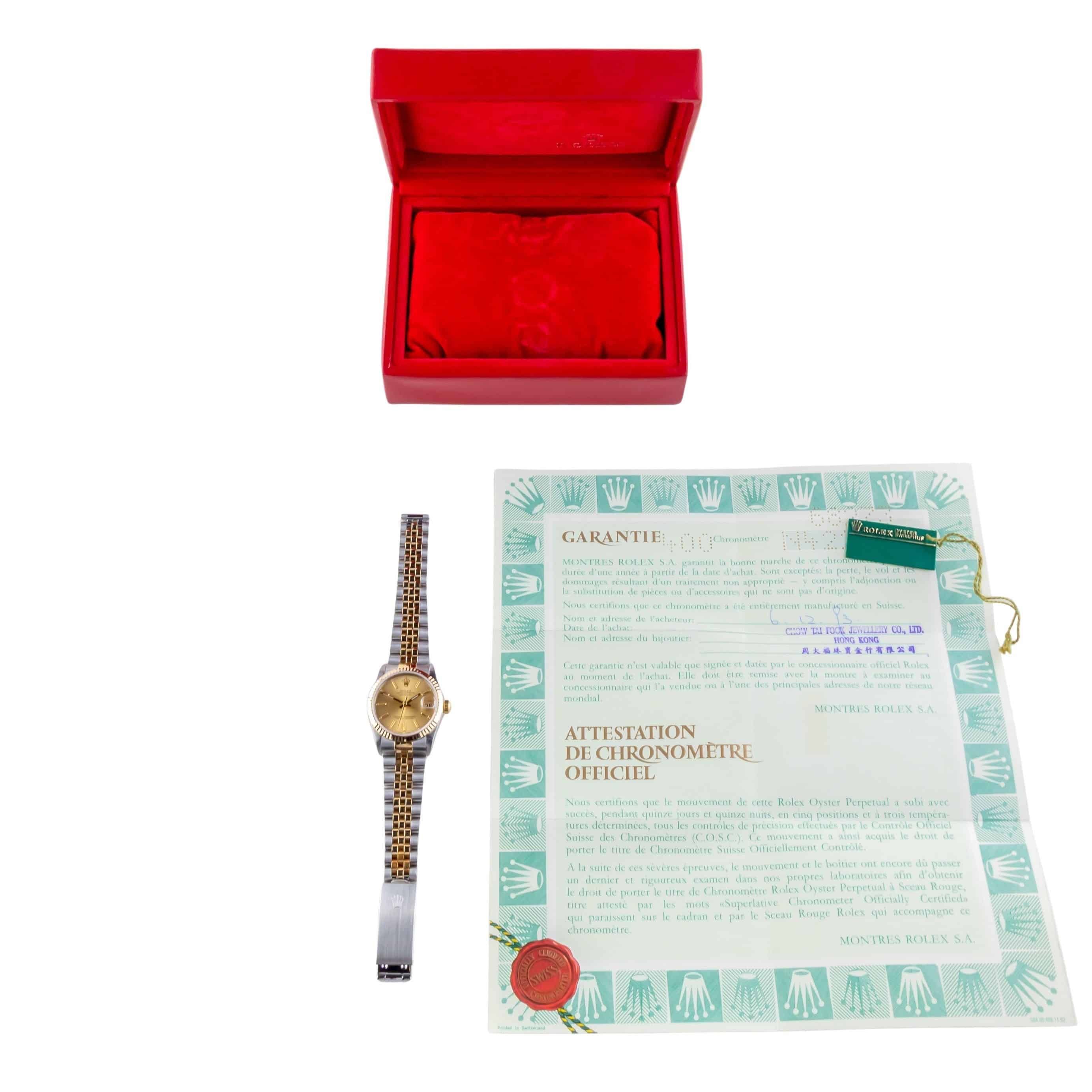 Rolex Oyster Perpetual Datejust Mid-Size referencia 68273 de 1991, incluyendo set completo. El Datejust 68273 tiene una caja de 31 mm en oro/acero inoxidable, una pulsera Jubilee de oro/acero inoxidable y un bisel estriado de oro de 18k. Este Datejust 68273 cuenta con un movimiento automático calibre 3135 con función de fecha rápida, un cristal de zafiro resistente a los arañazos y una esfera color champán con manecillas de tritio.