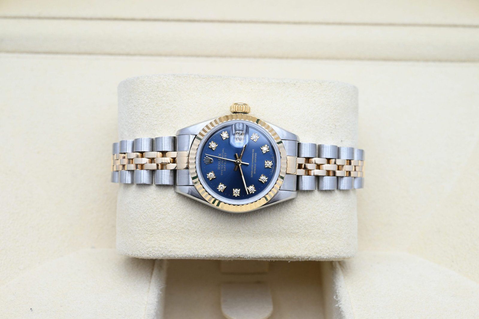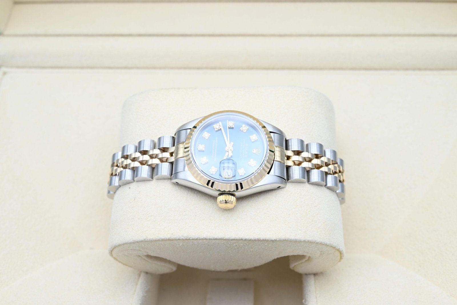 Rolex Lady-Datejust 69173 with the blue diamond dial from 1988 in excellent condition, comes complete with the full set. All of our watches have been thoroughly checked by our own watchmaker and serviced when needed.