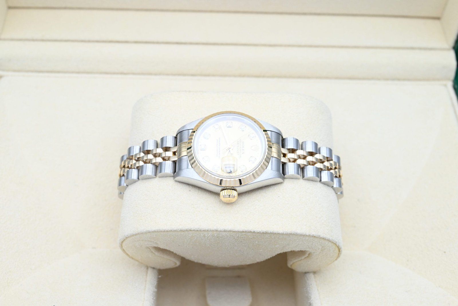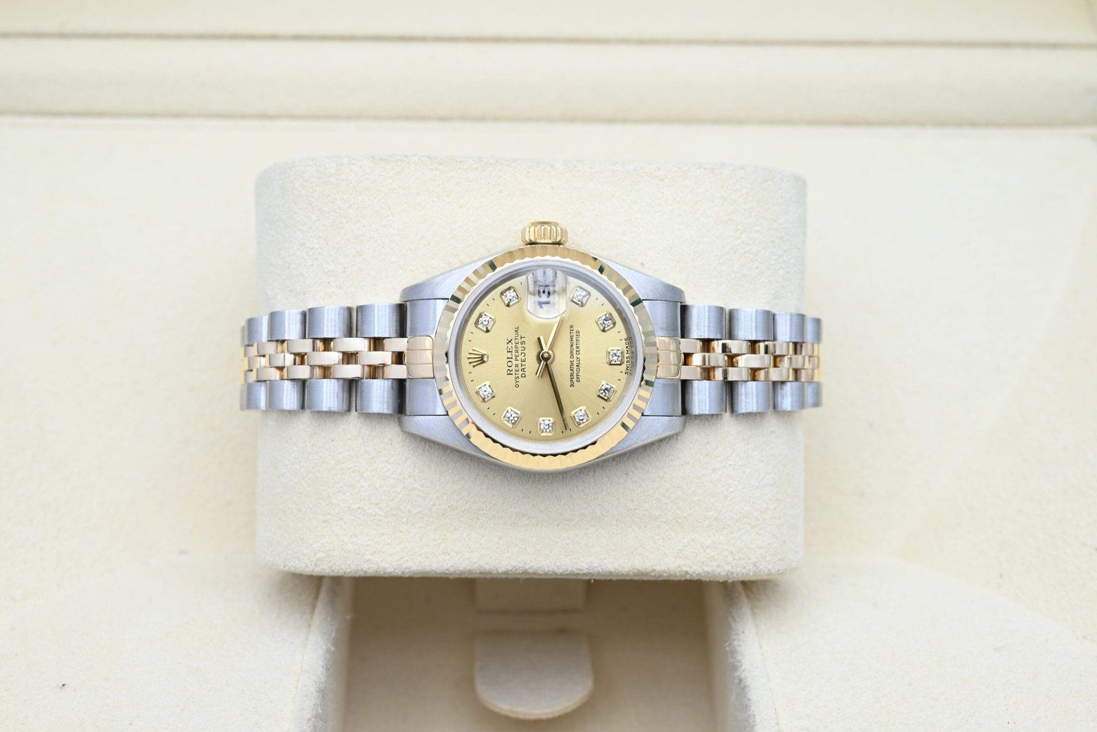 Rolex Lady-Datejust 69173 with the champagne diamond dial from 1999 in excellent condition, including the original box and papers. All of our watches have been thoroughly checked by our own watchmaker and serviced when needed.