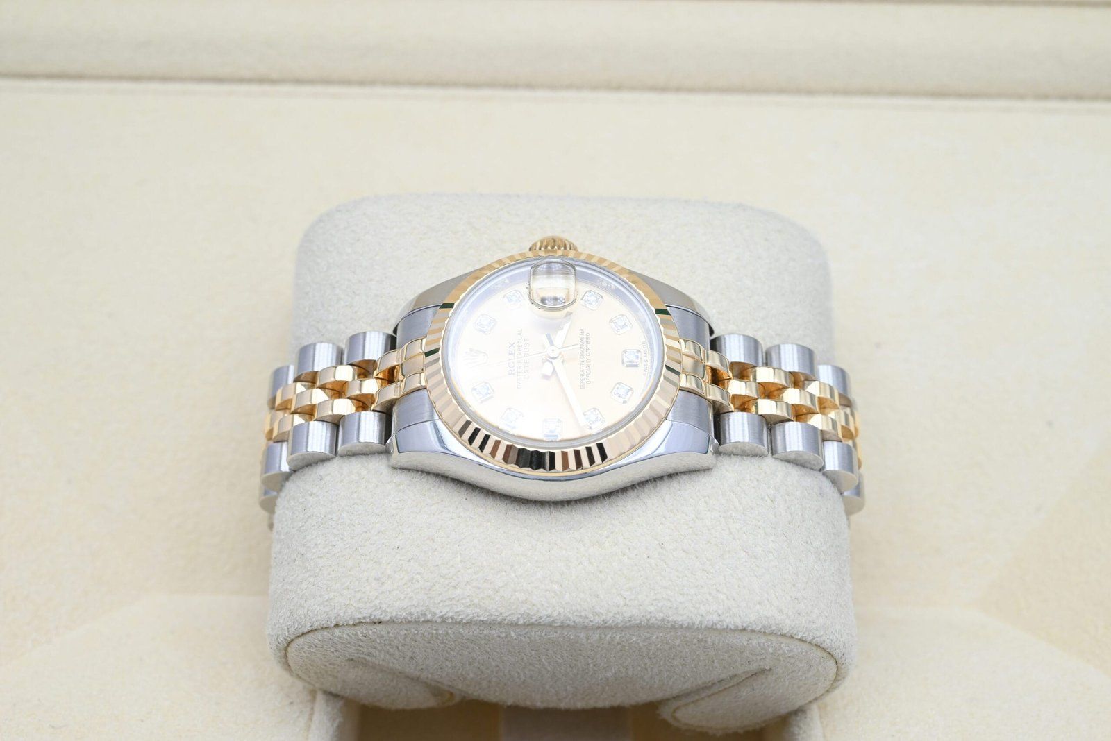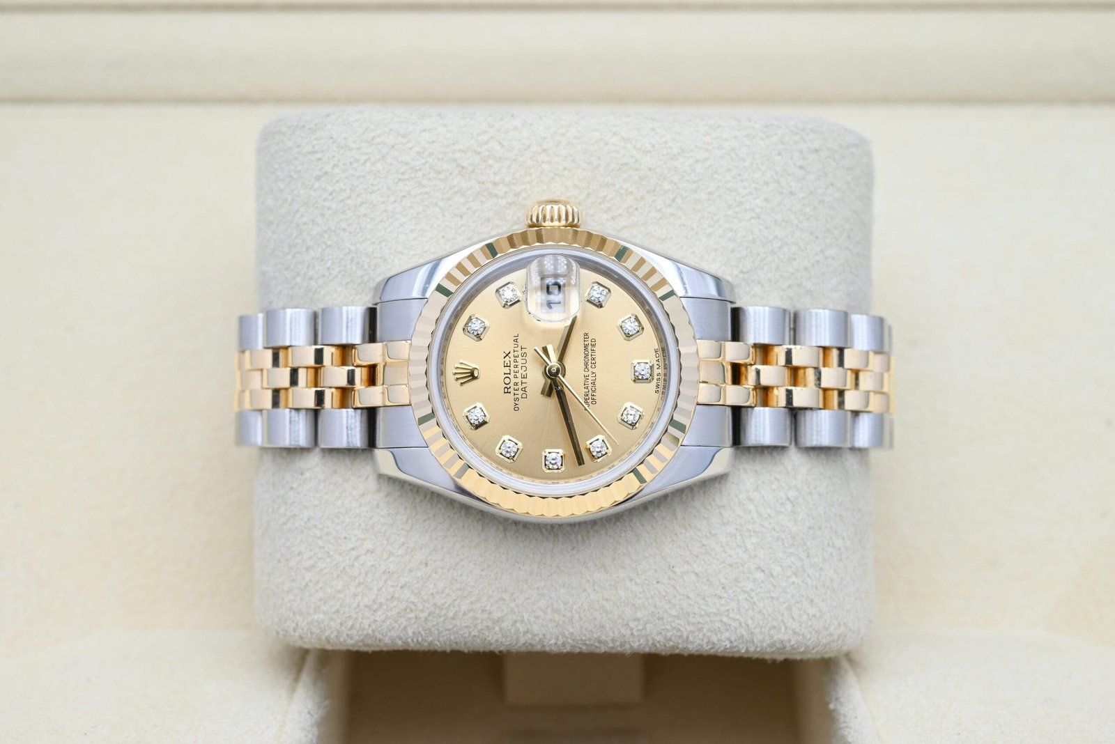 Rolex Lady-Datejust 179173 with the chamapagne diamond dial from 2011 in excellent condition, comes complete with the full set. All of our watches have been thoroughly checked by our own watchmaker and serviced when needed.