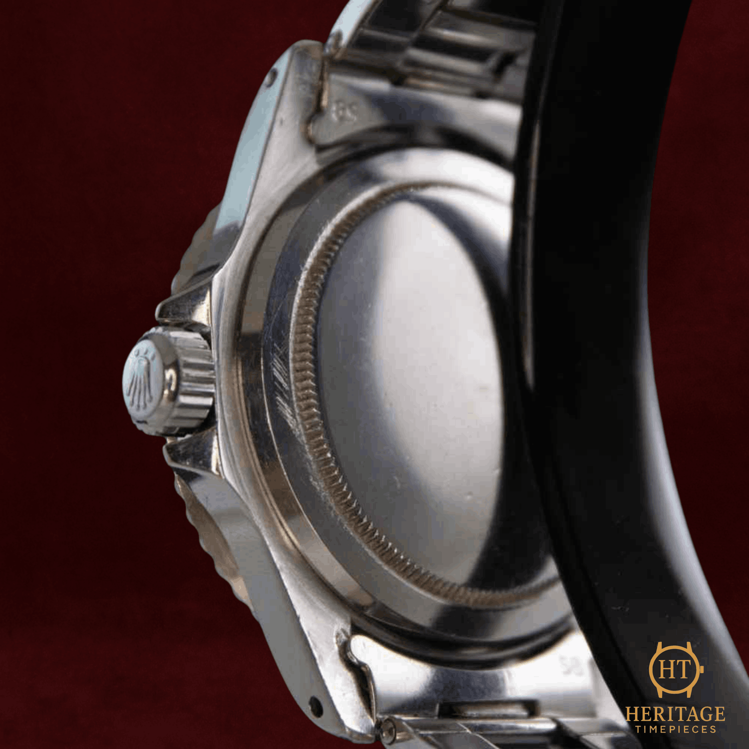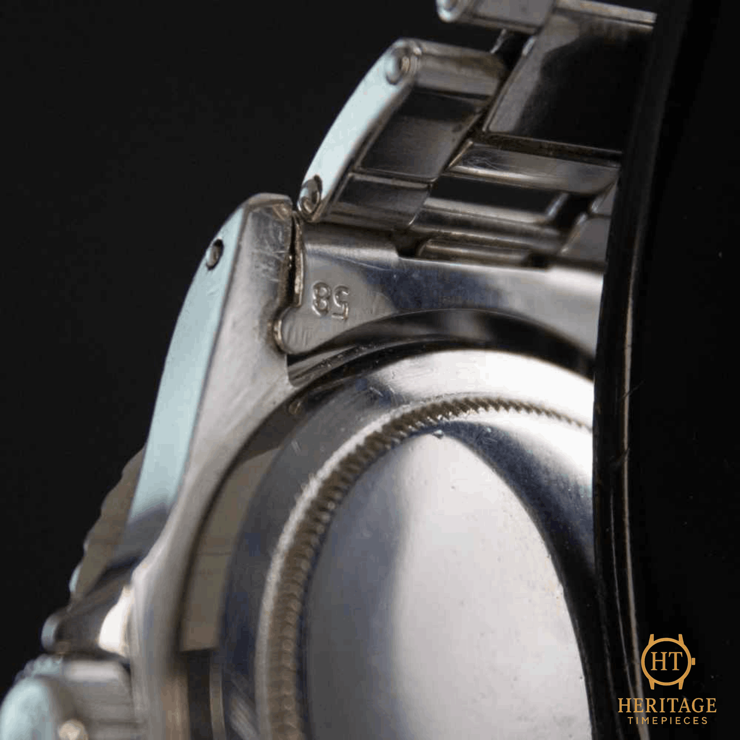 - Signos leves de uso como microarañazos o pequeños arañazos superficiales. La caja, el bisel y el brazalete conservan sus aristas definidas y su forma general. Puede haber sido pulido profesionalmente sin afectar a las líneas originales. Totalmente funcional mecánicamente.