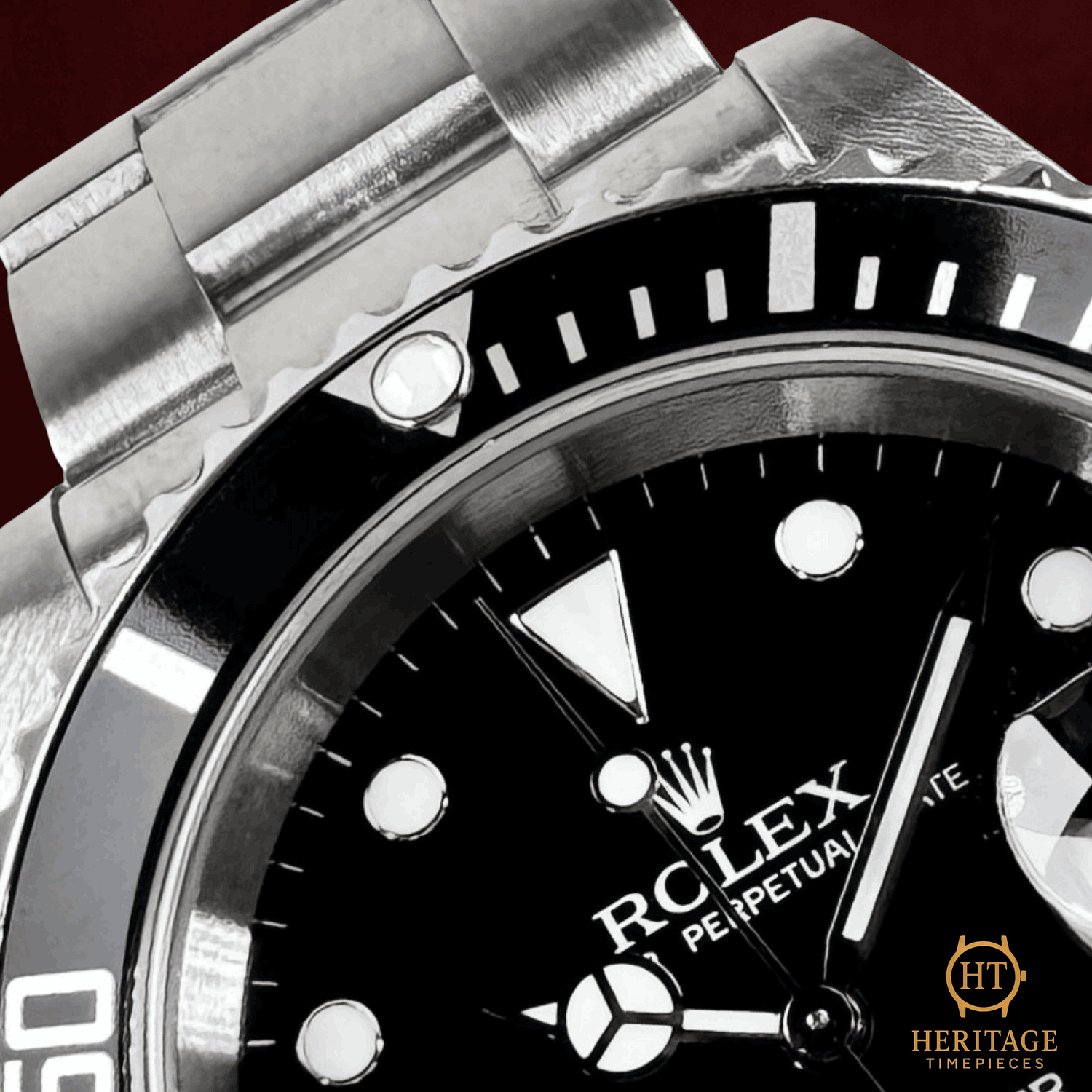 Heritage Narrative The Rolex Submariner reference 16610 occupies a pivotal place in the model’s history, representing the final era of classic proportions before the transition to ceramic bezels and bulkier case profiles. Produced for decades with incremental technical updates, the 16610 is widely regarded as the last truly traditional Submariner—combining modern reliability with vintage-era restraint. This example, dating to 2004, features the familiar 40 mm stainless steel case paired with a black aluminum bezel insert and a clean black dial with luminous hour markers. The proportions remain slim and balanced, making the 16610 exceptionally comfortable on the wrist and highly versatile for daily wear. The date complication, magnified by the Cyclops lens, adds practicality while maintaining the unmistakable Submariner aesthetic. Inside, the watch is powered by Rolex’s self-winding Perpetual mechanical movement with quickset date functionality, offering dependable performance and ease of use. The Oyster bracelet completes the package, delivering the robust yet understated feel that defined Rolex professional watches throughout this era. An excellent example of a reference that bridges vintage character and modern usability, the Submariner 16610 remains one of the most sought-after Rolex sports watches among collectors and enthusiasts alike. Technical Specifications Brand:Rolex Model:Submariner Date Reference:16610 Serial Number:F86XXXX Year:2004 Movement:Rolex self-winding Perpetual mechanical movement Complications:Quickset date Case:40 mm stainless steel case Bezel:Unidirectional rotatable bezelBlack insert with 60-minute elapsed time scale Crystal:Scratch-resistant sapphire crystal Dial / Hands:Black dial with luminous hour markers and hands Bracelet:Stainless steel Oyster braceletApprox. 7 3/4 in (adjustable) Condition & Inclusions Overall Condition:Pre-owned — excellent condition Service Status:Movement tested and functioning correctly Set:Includes: Box, Booklets Shipping & Logistics The watch is stored securely and shipped fully insured within 1–3 business days. Worldwide shipping is available. Any applicable import duties or taxes are the responsibility of the buyer. Shipping & Returns Complimentary insured worldwide shipping and a 14-day return window. Each timepiece is authenticated, time-tested, and professionally prepared prior to dispatch. Secure packaging, tracking, and full insurance are included with every shipment.