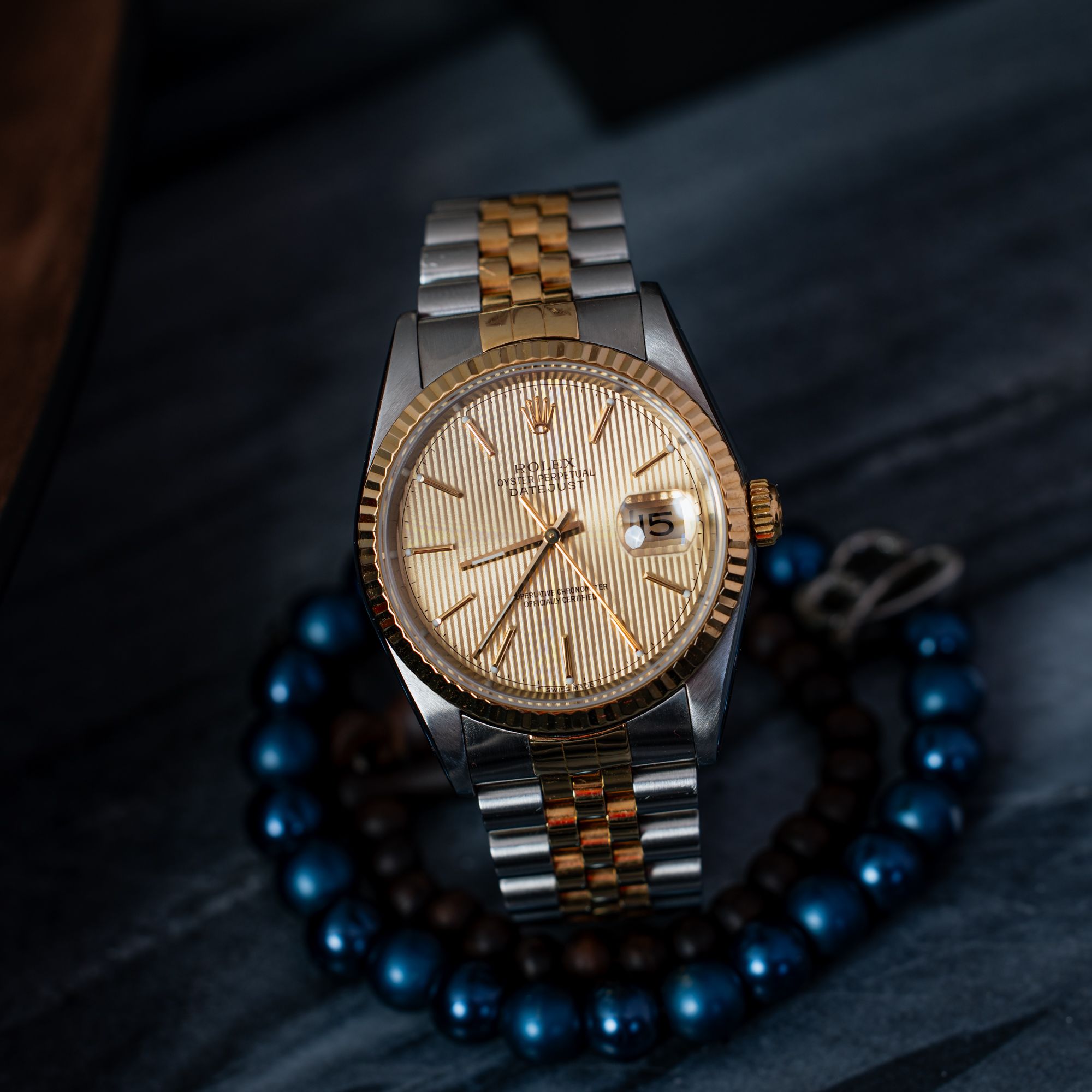 A truly beautiful and highly distinctive Rolex Datejust in the classic 36 mm size, featuring the iconic two-tone (Rolesor) configuration. This is a model that perfectly captures the spirit of the 1990s while remaining timeless.The standout feature of this piece is undoubtedly the “Tapestry” dial — finished in gold with a unique vertical texture resembling fabric. Combined with the light play, it creates a stunning visual effect, making it one of the most eye-catching Datejust variations.