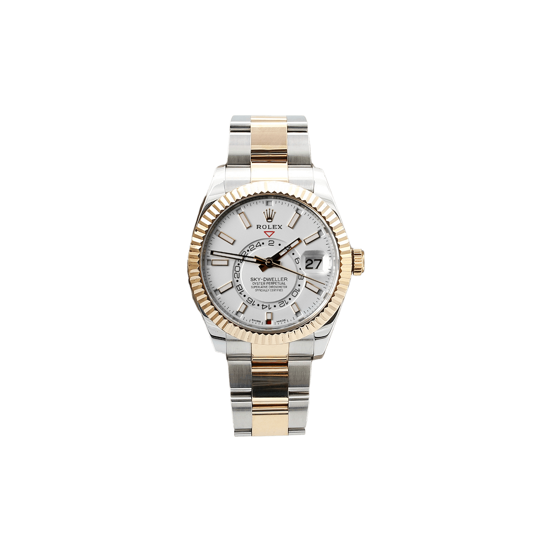 For sale a pre-owned Rolex Sky Dweller Steel and Gold ref. 326933.The Oyster case is 42mm in diameter and 14.10mm in thickness, making it the largest “dressy” timepiece produced by the brand. The purpose of the Sky-Dweller was to introduce a timepiece for the modern jet-setter who uses his watch both for utility and as a status item. Rolex listened to the desires of many people to produce a larger, everyday non-sports watch and also understood that something many of its customers have in common is travel. The in-house made caliber 9001 automatic movement offers the wearer a different GMT time read-out as compared to Rolex’s other GMT-hand equipped watches, and introduced one of the best annual calendar systems on the market.The most unique part of the Sky-Dweller as compared to other Rolex watches is the exposed eccentric ring on the dial used to display the GMT time. The second time zone is read under 12 o’clock via the red and white arrow pointer. The model made its debut in 2017. BRAND ROLEX MODEL SKY-DWELLER REFERENCE 326933 CASE MATERIAL STEEL/GOLD MOVEMENT AUTOMATIC DIMENSION 42 MM DIAL WHITE CRYSTAL SAPPHIRE BRACELET TYPE OYSTER BRACELET MATERIAL STEEL/GOLD ORIGINAL BOX YES ORIGINAL PAPERS YES YEAR 2017-2022 CONDITION EXCELLENT